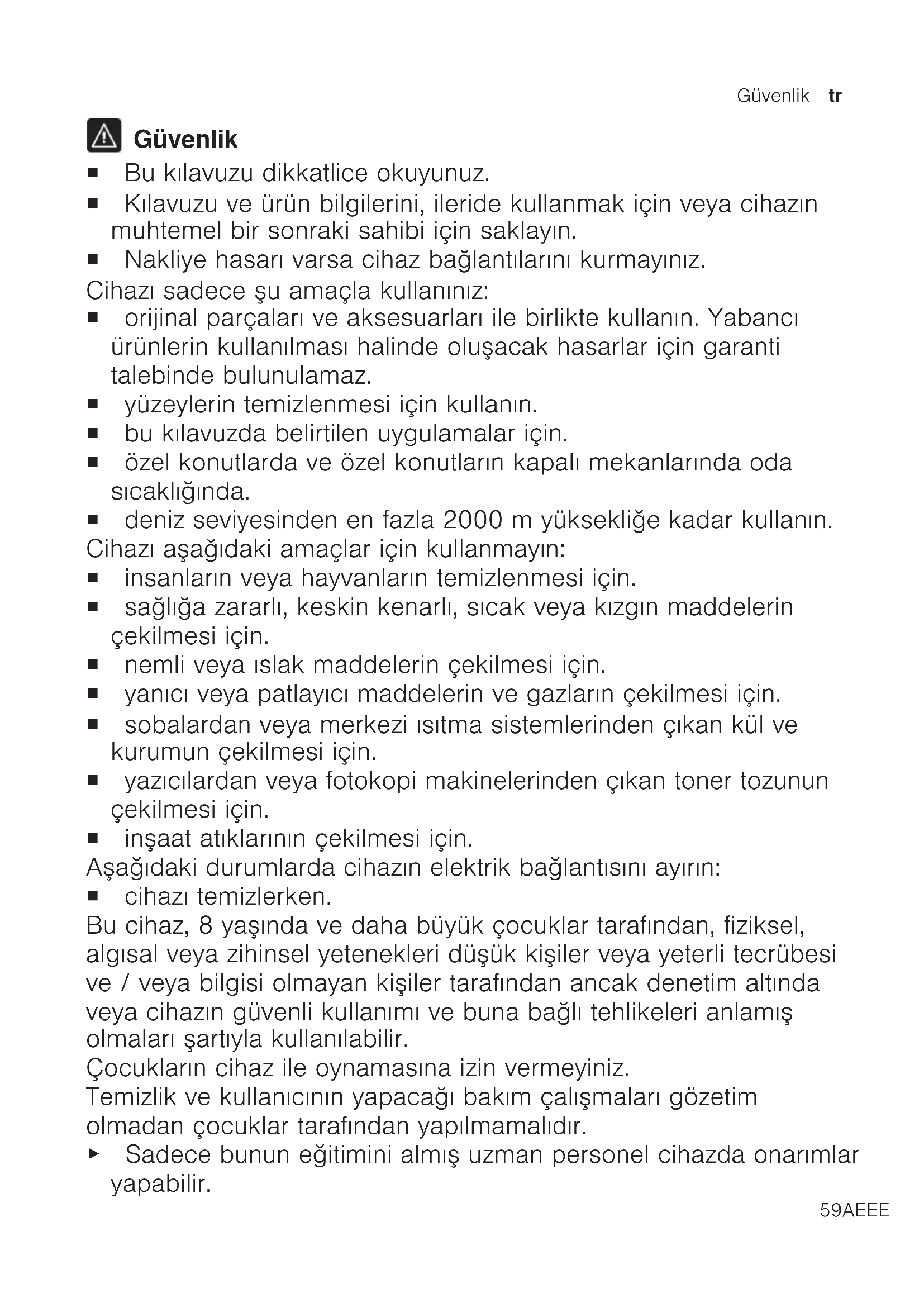 Λεπτομερείς πληροφορίες για τον χρόνο εγγύησης και τους όρους εγγύησης στη χώρα σας θα λάβετε από την υπηρεσία εξυπηρέτησης πελατών της εταιρείας μας, τον έμπορά σας ή την ιστοσελίδα μας. Τα στοιχεία επικοινωνίας της υπηρεσίας εξυπηρέτησης πελατών θα τα βρείτε στον συνημμένο κατάλογο της υπηρεσίας εξυπηρέτησης πελατών ή στην ιστοσελίδα μας.Güvenlik tr 59AEEE Yönetmeliǧine Uygundur. PCB içermez. Güvenlik ¡ Bu kılavuzu dikkatlice okuyunuz. ¡ Kılavuzu ve ürün bilgilerini, ileride kullanmak için veya cihazın muhtemel bir sonraki sahibi için saklayın. ¡ Nakliye hasarı varsa cihaz bağlantılarını kurmayınız. Cihazı sadece şu amaçla kullanınız: ¡ orijinal parçaları ve aksesuarları ile birlikte kullanın. Yabancı ürünlerin kullanılması halinde oluşacak hasarlar için garanti talebinde bulunulamaz. ¡ yüzeylerin temizlenmesi için kullanın. ¡ bu kılavuzda belirtilen uygulamalar için. ¡ özel konutlarda ve özel konutların kapalı mekanlarında oda sıcaklığında. ¡ deniz seviyesinden en fazla 2000m yüksekliğe kadar kullanın. Cihazı aşağıdaki amaçlar için kullanmayın: ¡ insanların veya hayvanların temizlenmesi için. ¡ sağlığa zararlı, keskin kenarlı, sıcak veya kızgın maddelerin çekilmesi için. ¡ nemli veya ıslak maddelerin çekilmesi için. ¡ yanıcı veya patlayıcı maddelerin ve gazların çekilmesi için. ¡ sobalardan veya merkezi ısıtma sistemlerinden çıkan kül ve kurumun çekilmesi için. ¡ yazıcılardan veya fotokopi makinelerinden çıkan toner tozunun çekilmesi için. ¡ inşaat atıklarının çekilmesi için. Aşağıdaki durumlarda cihazın elektrik bağlantısını ayırın: ¡ cihazı temizlerken. Bu cihaz, 8 yaşında ve daha büyük çocuklar tarafından, fiziksel, algısal veya zihinsel yetenekleri düşük kişiler veya yeterli tecrübesi ve / veya bilgisi olmayan kişiler tarafından ancak denetim altında veya cihazın güvenli kullanımı ve buna bağlı tehlikeleri anlamış olmaları şartıyla kullanılabilir. Çocukların cihaz ile oynamasına izin vermeyiniz. Temizlik ve kullanıcının yapacağı bakım çalışmaları gözetim olmadan çocuklar tarafından yapılmamalıdır. ▶ Sadece bunun eğitimini almış uzman personel cihazda onarımlar yapabilir.tr Güvenlik