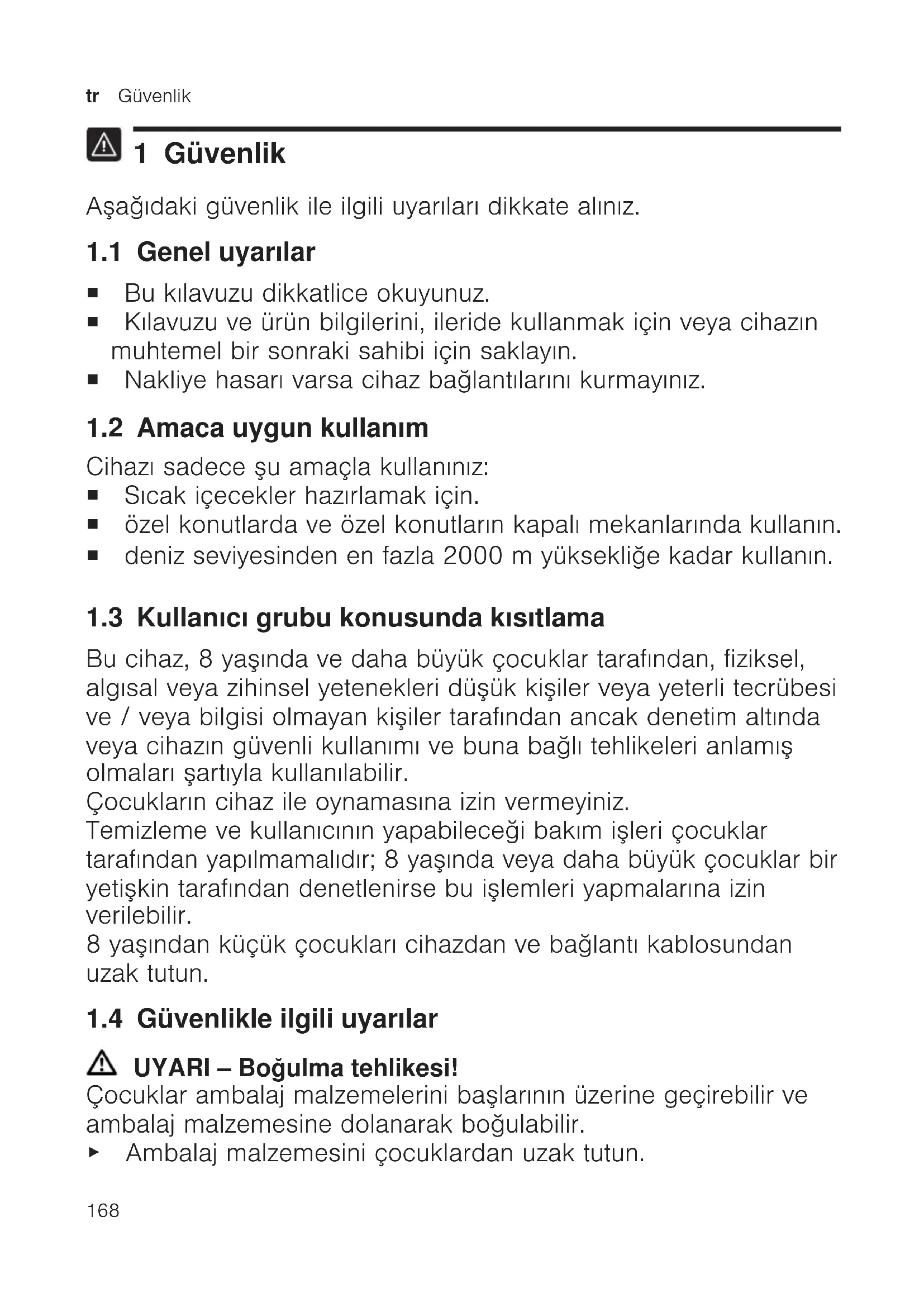 1 Güvenlik Aşağıdaki güvenlik ile ilgili uyarıları dikkate alınız. 1.1 Genel uyarılar ¡ Bu kılavuzu dikkatlice okuyunuz. ¡ Kılavuzu ve ürün bilgilerini, ileride kullanmak için veya cihazın muhtemel bir sonraki sahibi için saklayın. ¡ Nakliye hasarı varsa cihaz bağlantılarını kurmayınız. 1.2 Amaca uygun kullanım Cihazı sadece şu amaçla kullanınız: ¡ Sıcak içecekler hazırlamak için. ¡ özel konutlarda ve özel konutların kapalı mekanlarında kullanın. ¡ deniz seviyesinden en fazla 2000m yüksekliğe kadar kullanın. 1.3 Kullanıcı grubu konusunda kısıtlama Bu cihaz, 8 yaşında ve daha büyük çocuklar tarafından, fiziksel, algısal veya zihinsel yetenekleri düşük kişiler veya yeterli tecrübesi ve / veya bilgisi olmayan kişiler tarafından ancak denetim altında veya cihazın güvenli kullanımı ve buna bağlı tehlikeleri anlamış olmaları şartıyla kullanılabilir. Çocukların cihaz ile oynamasına izin vermeyiniz. Temizleme ve kullanıcının yapabileceği bakım işleri çocuklar tarafından yapılmamalıdır; 8 yaşında veya daha büyük çocuklar bir yetişkin tarafından denetlenirse bu işlemleri yapmalarına izin verilebilir. 8 yaşından küçük çocukları cihazdan ve bağlantı kablosundan uzak tutun. 1.4 Güvenlikle ilgili uyarılar UYARI‒Boğulma tehlikesi! Çocuklar ambalaj malzemelerini başlarının üzerine geçirebilir ve ambalaj malzemesine dolanarak boğulabilir. ▶ Ambalaj malzemesini çocuklardan uzak tutun.Güvenlik tr