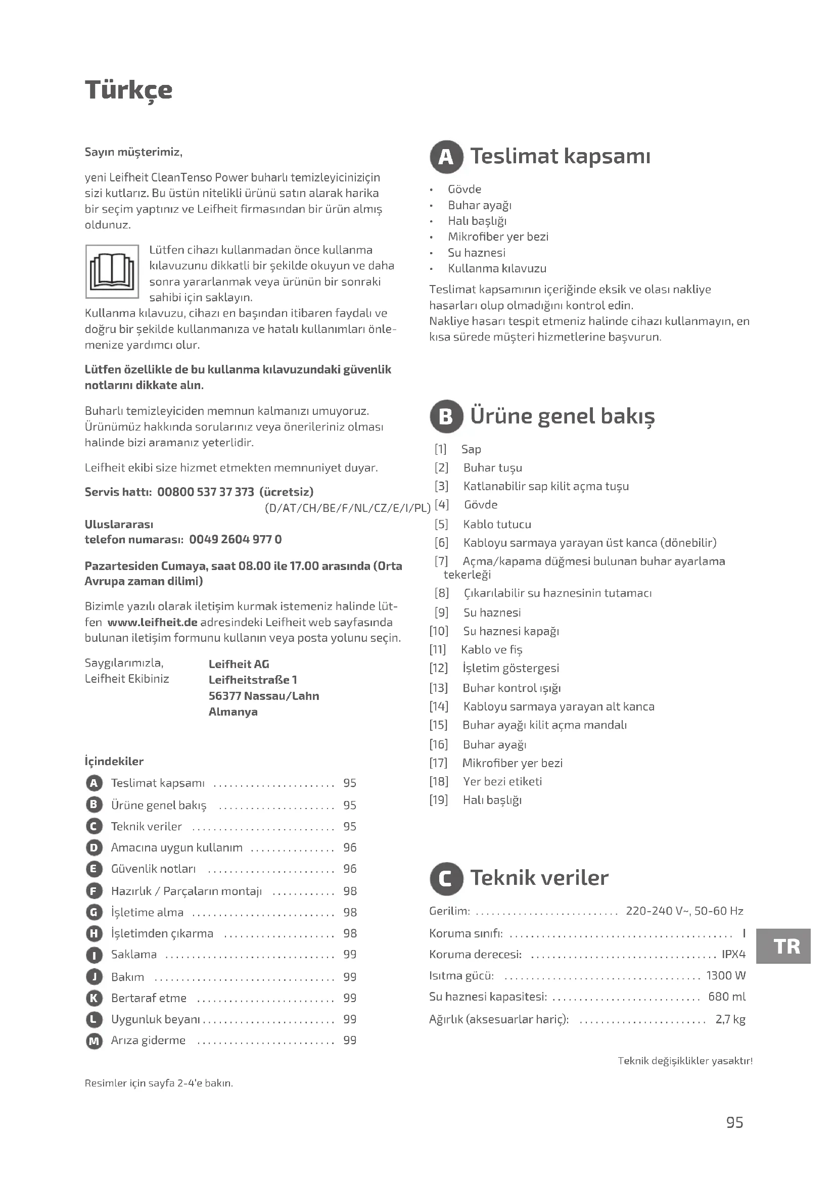 - Kullanmakılavuzu Teslimatkapsamınıniçeriğindeeksikveolasınakliye hasarlarıolupolmadığınıkontroledin. Nakliyehasarıtespitetmenizhalindecihazıkullanmayın,en kısasüredemüşterihizmetlerinebaşvurun. Sayın müşterimiz, yeniLeifheitCleanTensoPowerbuharlıtemizleyiciniz için sizikutlarız.Buüstünnitelikliürünüsatınalarakharika birseçimyaptınızveLeifheitrmasındanbirürünalmış oldunuz. Lütfencihazıkullanmadanöncekullanma kılavuzunudikkatlibirşekildeokuyunvedaha sonrayararlanmakveyaürününbirsonraki sahibiiçinsaklayın. Kullanmakılavuzu,cihazıenbaşındanitibarenfaydalıve doğrubirşekildekullanmanızavehatalıkullanımlarıönle- menizeyardımcıolur. Lütfen özellikle de bu kullanma kılavuzundaki güvenlik notlarını dikkate alın. Buharlıtemizleyicidenmemnunkalmanızıumuyoruz. Ürünümüzhakkındasorularınızveyaönerilerinizolması halindebiziaramanızyeterlidir. Leifheitekibisizehizmetetmektenmemnuniyetduyar. Servis hattı: 00800 537 37 373 (ücretsiz) (D/AT/CH/BE/F/NL/CZ/E/I/PL) Uluslararası telefon numarası: 0049 2604 977 0 Pazartesiden Cumaya, saat 08.00 ile 17.00 arasında (Orta Avrupa zaman dilimi) Bizimleyazılıolarakiletişimkurmakistemenizhalindelüt- fen www.leifheit.deadresindekiLeifheitwebsayfasında bulunaniletişimformunukullanınveyapostayolunuseçin. Saygılarımızla, LeifheitEkibiniz [1] Sap [2] Buhartuşu [3] Katlanabilirsapkilitaçmatuşu [4] Gövde [5] Kablotutucu [6] Kabloyusarmayayarayanüstkanca(dönebilir) [7] Açma/kapamadüğmesibulunanbuharayarlama tekerleği [8] Çıkarılabilirsuhaznesinintutamacı [9] Suhaznesi [10] Suhaznesikapağı [11] Kabloveş [12] İşletimgöstergesi [13] Buharkontrolışığı [14] Kabloyusarmayayarayanaltkanca [15] Buharayağıkilitaçmamandalı [16] Buharayağı [17] Mikroberyerbezi [18] Yerbezietiketi [19] Halıbaşlığı Gerilim:...........................220-240V~,50-60Hz Korumasınıfı:.......................................... I Korumaderecesi:...................................IPX4 Isıtmagücü: .....................................1300W Suhaznesikapasitesi:............................680ml Ağırlık(aksesuarlarhariç): ........................ 2,7kg Teknikdeğişiklikleryasaktır! İçindekiler Teslimatkapsamı....................... Ürünegenelbakış...................... Teknikveriler........................... Amacınauygunkullanım................ Güvenliknotları........................ Hazırlık/Parçalarınmontajı............ İşletimealma........................... İşletimdençıkarma..................... Saklama................................ Bakım .................................. Bertarafetme.......................... Uygunlukbeyanı......................... Arızagiderme.......................... Ürüne genel bakış Teknik veriler