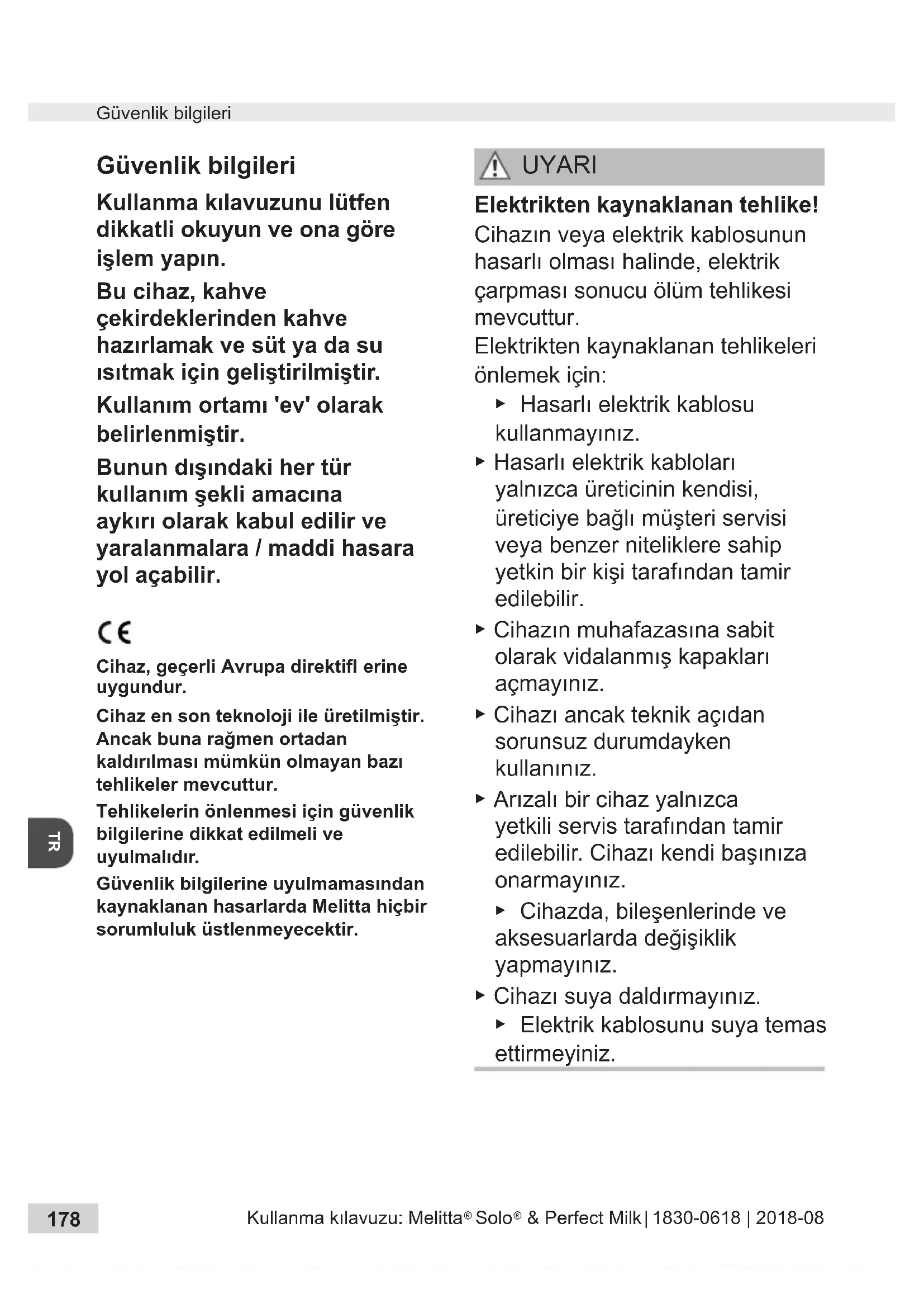 Güvenlik bilgileri Kullanma kılavuzunu lütfen dikkatli okuyun ve ona göre işlem yapın. Bu cihaz, kahve çekirdeklerinden kahve hazırlamak ve süt ya da su ısıtmak için geliştirilmiştir. Kullanım ortamı 'ev' olarak belirlenmiştir. Bunun dışındaki her tür kullanım şekli amacına aykırı olarak kabul edilir ve yaralanmalara / maddi hasara yol açabilir. Cihaz, geçerli Avrupa direktifl erine uygundur. Cihaz en son teknoloji ile üretilmiştir. Ancak buna rağmen ortadan kaldırılması mümkün olmayan bazı tehlikeler mevcuttur. Tehlikelerin önlenmesi için güvenlik bilgilerine dikkat edilmeli ve uyulmalıdır. Güvenlik bilgilerine uyulmamasından kaynaklanan hasarlarda Melitta hiçbir sorumluluk üstlenmeyecektir. UYARI Elektrikten kaynaklanan tehlike! Cihazın veya elektrik kablosunun hasarlı olması halinde, elektrik çarpması sonucu ölüm tehlikesi mevcuttur. Elektrikten kaynaklanan tehlikeleri önlemek için: ▶ Hasarlı elektrik kablosu kullanmayınız. ▶ Hasarlı elektrik kabloları yalnızca üreticinin kendisi, üreticiye bağlı müşteri servisi veya benzer niteliklere sahip yetkin bir kişi tarafından tamir edilebilir. ▶ Cihazın muhafazasına sabit olarak vidalanmış kapakları açmayınız. ▶ Cihazı ancak teknik açıdan sorunsuz durumdayken kullanınız. ▶ Arızalı bir cihaz yalnızca yetkili servis tarafından tamir edilebilir. Cihazı kendi başınıza onarmayın ız. ▶ Cihazda, bileşenlerinde ve aksesuarlarda değişiklik yapmayınız. ▶ Cihazı suya daldırmayınız. ▶ Elektrik kablosunu suya temas ettirmeyiniz.Kullanma kılavuzu: Melitta