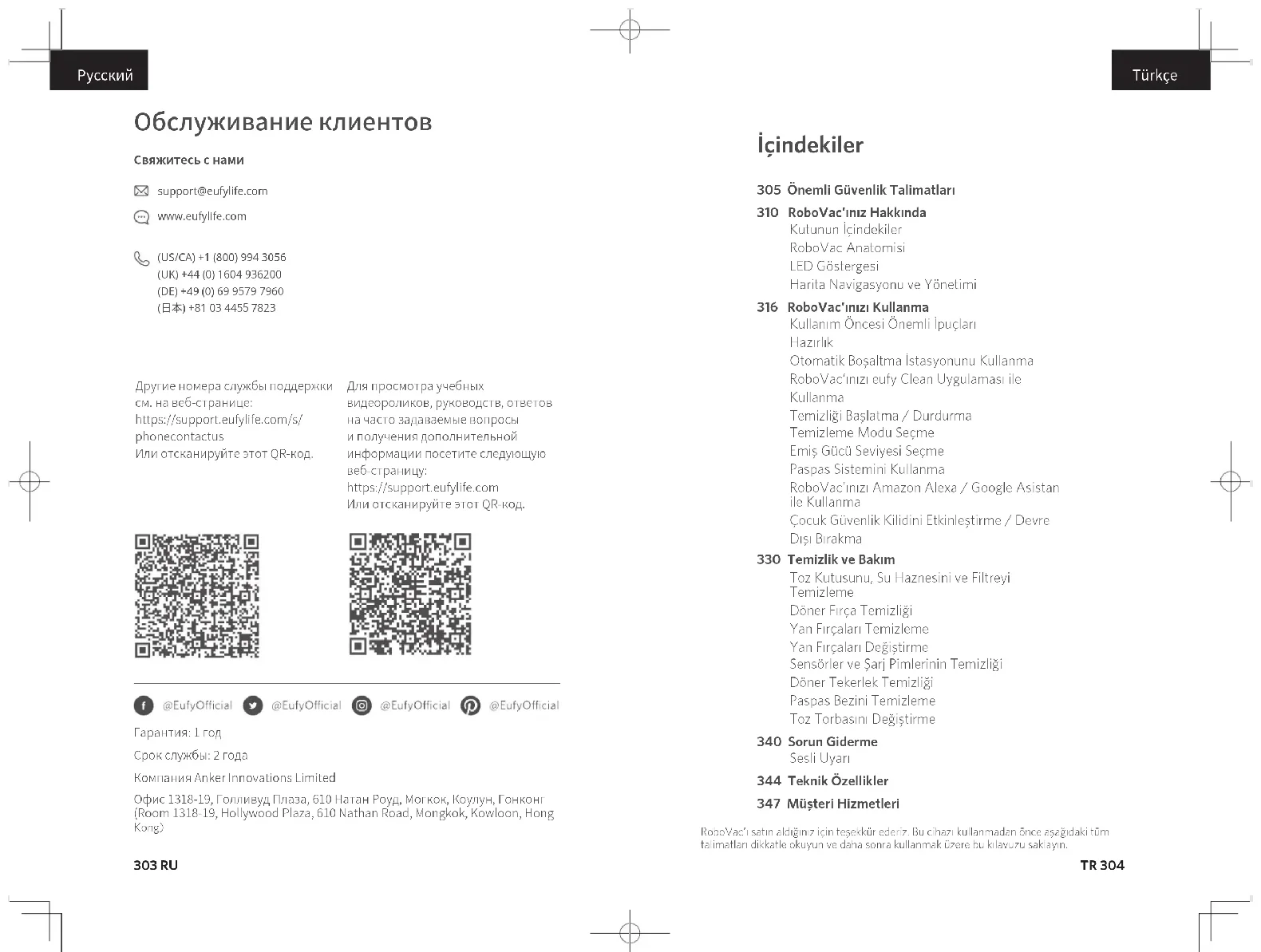 Bizimle İletişime Geçin (US/CA) +1 (800) 994 3056 (UK) +44 (0) 1604 936200 (DE) +49 (0) 69 9579 7960 (TR) +90 (850) 460 14 14 (日本) +81 03 4455 7823 support@eufylife.com www.eufylife.com Destekle ilgili diğer telefon numaraları için, lütfen web sayfamızı ziyaret edin: https://support.eufylife.com/s/ phonecontactus Veya aşağıdaki QR kodu taratın: Eğitim videoları, SSS'ler, kılavuzlar ve daha fazla bilgi için, lütfen web sayfamızı ziyaret edin: https://support.eufylife.com Veya aşağıdaki QR kodu taratın: