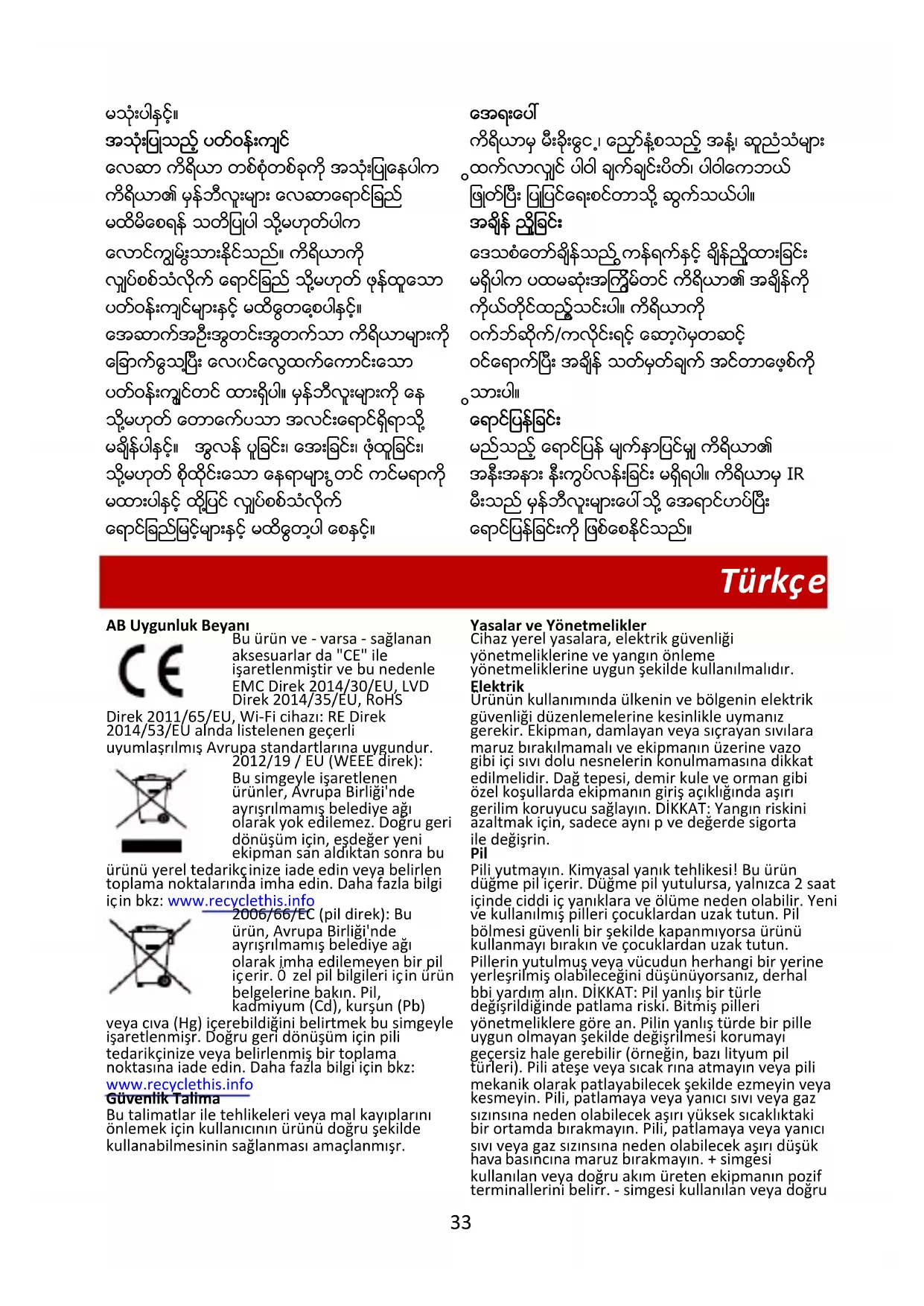 ေရာင္ျပန္ျခင္း မည္သည့္ ေရာင္ျပန္ မ်က္ႏွာျပင္မွ် ကိရိယာ၏ အနီးအနား နီးကပ္လြန္းျခင္း မရွိရပါ။ ကိရိယာမွ IR မီးသည္ မွန္ဘီလူးမ်ားေပၚသို႔ အေရာင္ဟပ္ၿပီး ေရာင္ျပန္ျခင္းကို ျဖစ္ေစႏိုင္သည္။ Türkçe AB Uygunluk Beyanı Bu ürün ve - varsa - sağlanan aksesuarlar da "CE" ile işaretlenmiştir ve bu nedenle EMC Direktifi 2014/30/EU, LVD Direktifi 2014/35/EU, RoHS Direktifi 2011/65/EU, Wi-Fi cihazı: RE Direktifi 2014/53/EU altında listelenen geçerli uyumlaştırılmış Avrupa standartlarına uygundur. 2012/19 / EU (WEEE direktifi): Bu simgeyle işaretlenen ürünler, Avrupa Birliği'nde ayrıştırılmamış belediye atığı olarak yok edilemez. Doğru geri dönüşüm için, eşdeğer yeni ekipman satın aldıktan sonra bu ürünü yerel tedarikçinize iade edin veya belirtilen toplama noktalarında imha edin. Daha fazla bilgi için bkz: www.recyclethis.info 2006/66/EC (pil direktifi): Bu ürün, Avrupa Birliği'nde ayrıştırılmamış belediye atığı olarak imha edilemeyen bir pil içerir. Ö zel pil bilgileri için ürün belgelerine bakın. Pil, kadmiyum (Cd), kurşun (Pb) veya cıva (Hg) içerebildiğini belirtmek bu simgeyle işaretlenmiştir. Doğru geri dönüşüm için pili tedarikçinize veya belirlenmiş bir toplama noktasına iade edin. Daha fazla bilgi için bkz: www.recyclethis.info Güvenlik Talimatı Bu talimatlar ile tehlikeleri veya mal kayıplarını önlemek için kullanıcının ürünü doğru şekilde kullanabilmesinin sağlanması amaçlanmıştır. Yasalar ve Yönetmelikler Cihaz yerel yasalara, elektrik güvenliği yönetmeliklerine ve yangın önleme yönetmeliklerine uygun şekilde kullanılmalıdır. Elektrik Ürünün kullanımında ülkenin ve bölgenin elektrik güvenliği düzenlemelerine kesinlikle uymanız gerekir. Ekipman, damlayan veya sıçrayan sıvılara maruz bırakılmamalı ve ekipmanın üzerine vazo gibi içi sıvı dolu nesnelerin konulmamasına dikkat edilmelidir. Dağ tepesi, demir kule ve orman gibi özel koşullarda ekipmanın giriş açıklığında aşırı gerilim koruyucu sağlayın. DİKKAT: Yangın riskini azaltmak için, sadece aynı tip ve değerde sigorta ile değiştirin. Pil Pili yutmayın. Kimyasal yanık tehlikesi! Bu ürün düğme pil içerir. Düğme pil yutulursa, yalnızca 2 saat içinde ciddi iç yanıklara ve ölüme neden olabilir. Yeni ve kullanılmış pilleri çocuklardan uzak tutun. Pil bölmesi güvenli bir şekilde kapanmıyorsa ürünü kullanmayı bırakın ve çocuklardan uzak tutun. Pillerin yutulmuş veya vücudun herhangi bir yerine yerleştirilmiş olabileceğini düşünüyorsanız, derhal tıbbi yardım alın. DİKKAT: Pil yanlış bir türle değiştirildiğinde patlama riski. Bitmiş pilleri yönetmeliklere göre atın. Pilin yanlış türde bir pille uygun olmayan şekilde değiştirilmesi korumayı geçersiz hale getirebilir (örneğin, bazı lityum pil türleri). Pili ateşe veya sıcak fırına atmayın veya pili mekanik olarak patlayabilecek şekilde ezmeyin veya kesmeyin. Pili, patlamaya veya yanıcı sıvı veya gaz sızıntısına neden olabilecek aşırı yüksek sıcaklıktaki bir ortamda bırakmayın. Pili, patlamaya veya yanıcı sıvı veya gaz sızıntısına neden olabilecek aşırı düşük hava basıncına maruz bırakmayın. + simgesi kullanılan veya doğru akım üreten ekipmanın pozitif terminallerini belirtir. - simgesi kullanılan veya doğru34 akım üreten ekipmanın negatif terminallerini belirtir. Yangın Önleme Ekipmanın üzerine yanan mum gibi açık alev kaynakları konulmamalıdır. Ekipmanın seri portu sadece hata ayıklama için kullanılır. Sıcak Yüzey Önleme DİKKAT: Sıcak parçalar! Parçaları tutuğunuzda parmaklarınız yanabilir. Kapattıktan sonra parçaları tutmadan önce bir buçuk saat bekleyin. Bu çıkartma, işaretli parçanın sıcak olabileceğini ve dikkat edilmeden dokunulmaması gerektiğini belirtmektedir. Bu çıkartmaya sahip cihaz için, bu cihaz sınırlı bir erişim konumuna kurulum için tasarlanmıştır, sadece servis personeli veya konuma uygulanan kısıtlamaların nedenleri ve alınması gereken önlemler hakkında bilgilendirilmiş kullanıcılar tarafından erişim sağlanabilir. Kurulum Ekipmanı bu kılavuzdaki talimatlara göre kurun. Yaralanmaları önlemek için bu ekipman kurulum talimatlarına göre zemine/duvara güvenli bir şekilde takılmalıdır. Ekipmanı asla sağlam olmayan bir yere yerleştirmeyin. Ekipmanın düşmesi ciddi kişisel yaralanmalara veya ölüme neden olabilir. Güç Kaynağı Çok Düşük Güvenlik Gerilimi (SELV) ile güç verilen cihaz: Güç kaynağı, IEC 60950-1 veya IEC 62368-1 standardına göre sınırlı güç kaynağı veya PS2 gereksinimlerini karşılamalıdır. AC şebeke kaynağı gerilimiyle güç verilen cihaz: Ekipman topraklı bir elektrik prizine takılmalıdır. Ekipmanın dışında, kolayca erişilebilen uygun bir bağlantı kesme cihazı bulunacaktır. Binanın teknik özelliklerini aşmayan uygun bir aşırı akım koruyucu cihaz, ekipmanın dışına eklenecektir. Binanın elektrik tesisatına tümü kutuplu bir şebeke anahtarı dâhil edilmelidir. AC şebeke kaynağına bağlantı için terminallerin doğru kablo tesisatına sahip olduğundan emin olun. Ekipman gerektiğinde BT güç dağıtım sistemine bağlanmak üzere değiştirilmiştir. Beyaz Işıklı Aydınlatıcı (Destekleniyorsa) Bu üründen muhtemel tehlikeli optik ışınım yayılabilir. Yanan ışık kaynağına doğrudan BAKMAYIN. Gözleriniz için zararlı olabilir. Uygun göz koruyucu kullanın veya kamerayı takarken, kurarken ya da kameraya bakım yaparken beyaz ışığı AÇMAYI