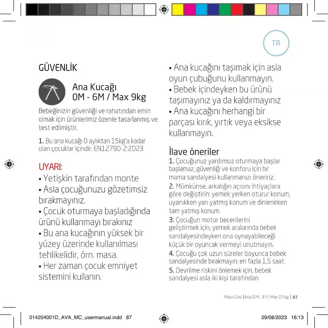 hakem heyetlerine yapabilirler. Arızalı veya kusurlu ürün durumunda ne yapılmalıdır: Sorun veya arızaların ortaya çıkması halinde, iletişime geçeceğiniz ilk nokta yetkili ithalatçı veya bizim onayladığımız bir perakende satıcıdır. Yetkili Bayi ve ithalatçımız 24 aylık garanti süresini sağlamaktadır (1) . Servis talebinden önceki 24 ay içinde ürünü satın aldığınızı gösteren belgeyi ve yetkili ithalatçı garanti belgesini ibraz etmelisiniz. Servis talebiniz için [marka] ithalatçı servisimizden ön onay almanız işleminizi kolaylaştıracaktır. Bu garanti kapsamında geçerli bir talepte bulunmanız durumunda, sizden ürününüzü yetkili ithalatçıya veya bizim onayladığımız bir perakende satıcıya teslim etmenizi ya da ürünü talimatlarımıza uygun şekilde bize göndermenizi isteyebiliriz. Tüm talimatlara uyulması şartıyla, kargo ücretleri tarafımızca karşılanacaktır. Garanti ve müşterinin yasal hakları kapsamında olmayan hasarlar ve kusurlar veya ürünlere, makul bir ücret karşılığında hizmet sağlanır. Tüketicinin hakları: Bir tüketicinin, ülkeden ülkeye farklılık gösteren geçerli tüketici yasasına göre yasal hakları vardır. Geçerli ulusal yasalara tabi olan tüketicinin hakları bu garantiden etkilenmez. Bu garanti Hollanda’da 17060920 şirket numarası ile kayıtlı Dorel Netherlands tarafından verilmektedir.Ticari adresimiz Korendijk 5, 5704 RD Helmond, Hollanda, ve psta adresimiz ET Helmond, Hollanda’dır. Dorel grubunun diğer bağlı kuruluşlarının isim ve adres bilgileri, bu kılavuzun en son sayfasında ve ilgili markayla ilgili web sitemizde bulunabilir. (1) Etiketleri veya tanımlama numaralarını kaldıran veya değiştiren tedarikçi veya bayilerden satın alınan ürünler onaysız olarak değerlendirilecektir.Yetkisiz tedarikçilerden alınan ürünler de onaysız olarak değerlendirilir. Bu ürünlerin orijinalliği doğrulanamadığı için garanti verilmemektedir. 014204001D_AVA_MC_usermanual.indd 91014204001D_AVA_MC_usermanual.indd 91 09/08/2023 16:1309/08/2023 16:1392 Ava 0 M -3 Y / Max 15 kg