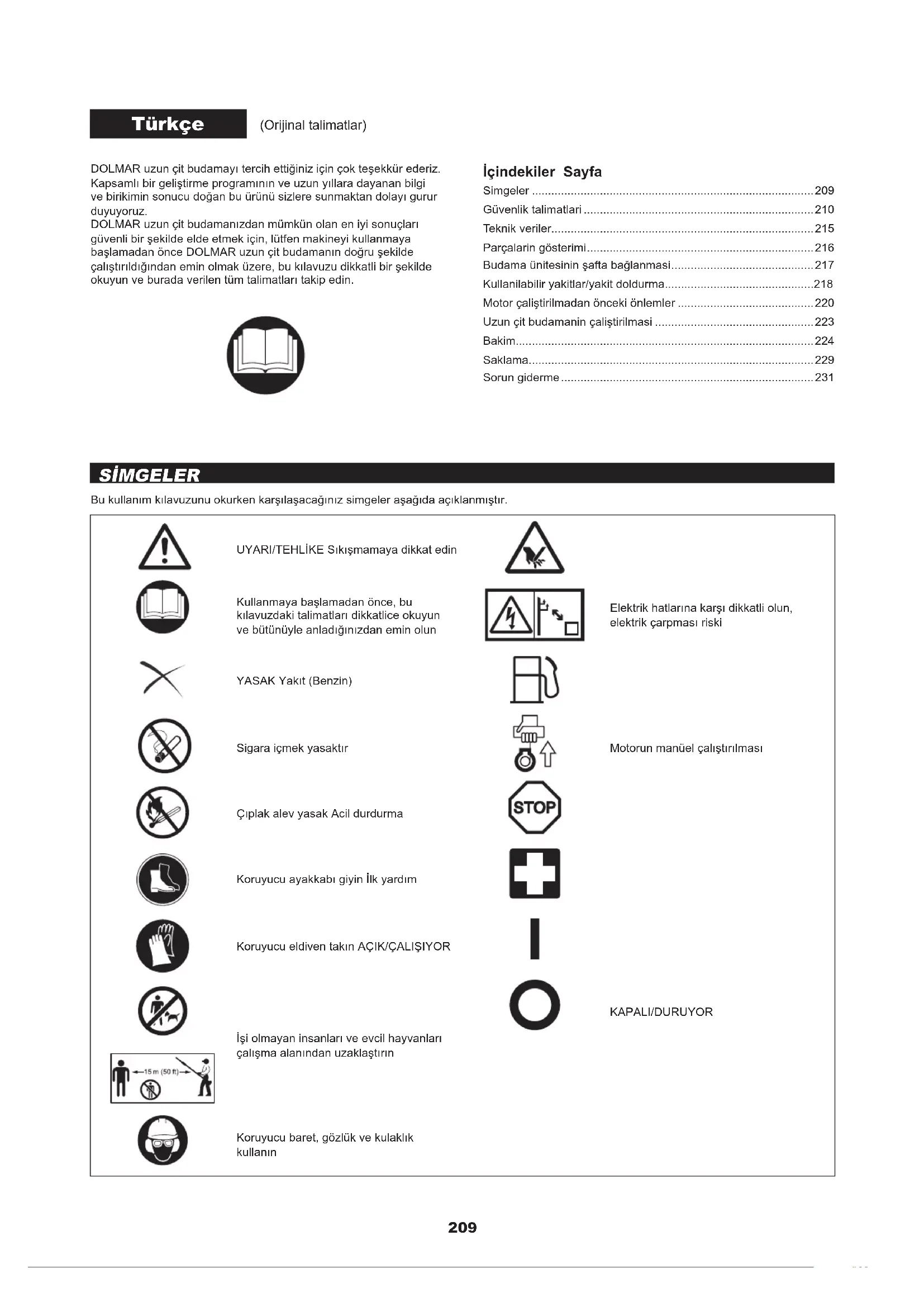 - Αποκολλημένος συνδετήρας Συνδέστε το καλά Μη φυσιολογικό ηλεκτρικό σύστημα Ζητήστε την επιθεώρηση και συντήρηση. Όταν ο κινητήρας δεν ξεκινά μετά τη λειτουργία προθέρμανσης: Εάν δεν υπάρχει καμιά ανωμαλία στα σημεία ελέγχου, ανοίξτε το γκάζι περίπου στο 1/3 και ξεκινήστε τον κινητήρα. ΕΠΙΛΥΣΗ ΠΡΟΒΛΗΜΑΤΩΝ209 DOLMAR uzun çit budamayı tercih ettiğiniz için çok teşekkür ederiz. Kapsamlı bir geliştirme programının ve uzun yıllara dayanan bilgi ve birikimin sonucu doğan bu ürünü sizlere sunmaktan dolayı gurur duyuyoruz. DOLMAR uzun çit budamanızdan mümkün olan en iyi sonuçları güvenli bir şekilde elde etmek için, lütfen makineyi kullanmaya başlamadan önce DOLMAR uzun çit budamanın doğru şekilde çalıştırıldığından emin olmak üzere, bu kılavuzu dikkatli bir şekilde okuyun ve burada verilen tüm talimatları takip edin. Türkçe (Orijinal talimatlar) İçindekiler Sayfa Simgeler p. 209