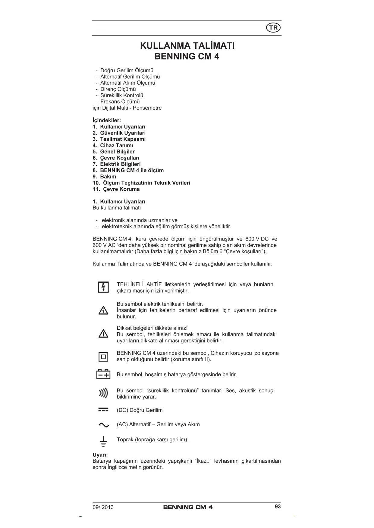 Toprak (toprağa karşı gerilim). Uyarı: Batarya kapağının üzerindeki yapışkanlı “İkaz..” levhasının çıkartılmasından sonra İngilizce metin görünür.09/ 2013 BENNING CM 4