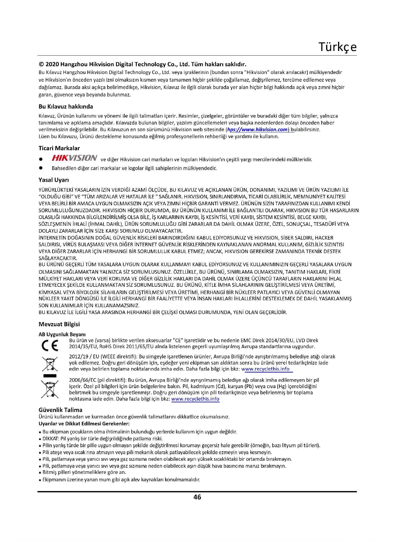 © 2020 Hangzhou Hikvision Digital Technology Co., Ltd. Tüm hakları saklıdır. Bu Kılavuz Hangzhou Hikvision Digital Technology Co., Ltd. veya iştiraklerinin (bundan sonra "Hikvision" olarak anılacaktır) mülkiyetindedir ve Hikvision'ın önceden yazılı izni olmaksızın kısmen veya tamamen hiçbir şekilde çoğaltılamaz, değiştirilemez, tercüme edilemez veya dağıtılamaz. Burada aksi açıkça belirtilmedikçe, Hikvision, Kılavuz ile ilgili olarak burada yer alan hiçbir bilgi hakkında açık veya zımni hiçbir garanti, güvence veya beyanda bulunmaz. Bu Kılavuz hakkında Kılavuz, Ürünün kullanımı ve yönetimi ile ilgili talimatları içerir. Resimler, çizelgeler, görüntüler ve buradaki diğer tüm bilgiler, yalnızca tanımlama ve açıklama amaçlıdır. Kılavuzda bulunan bilgiler, yazılım güncellemeleri veya başka nedenlerden dolayı önceden haber verilmeksizin değiştirilebilir. Bu Kılavuzun en son sürümünü Hikvision web sitesinde (https://www.hikvision.com) bulabilirsiniz. Lütfen bu Kılavuzu, Ürünü destekleme konusunda eğitilmiş profesyonellerin rehberliği ve yardımı ile kullanın. Ticari Markalar ve diğer Hikvision ticari markaları ve logoları Hikvision'ın çeşitli yargı mercilerindeki mülkleridir. Bahsedilen diğer ticari markalar ve logolar ilgili sahiplerinin mülkiyetindedir. Yasal Uyarı YÜRÜRLÜKTEKİ YASALARIN İZİN VERDİĞİ AZAMİ ÖLÇÜDE, BU KILAVUZ VE AÇIKLANAN ÜRÜN, DONANIMI, YAZILIMI VE ÜRÜN YAZILIMI İLE “OLDUĞU GİBİ” VE “TÜM ARIZALAR VE HATALAR İLE " SAĞLANIR. HIKVISION, SINIRLANDIRMA, TİCARİ OLABİLİRLİK, MEMNUNİYET KALİTESİ VEYA BELİRLİ BİR AMACA UYGUN OLMAKSIZIN AÇIK VEYA ZIMNİ HİÇBİR GARANTİ VERMEZ. ÜRÜNÜN SİZİN TARAFINIZDAN KULLANIMI KENDİ SORUMLULUĞUNUZDADIR. HIKVISION HİÇBİR DURUMDA, BU ÜRÜNÜN KULLANIMI İLE BAĞLANTILI OLARAK, HIKVISION BU TÜR HASARLARIN OLASILIĞI HAKKINDA BİLGİLENDİRİLMİŞ OLSA BİLE, İŞ KARLARININ KAYBI, İŞ KESİNTİSİ, VERİ KAYBI, SİSTEM KESİNTİSİ, BELGE KAYBI, SÖZLEŞMENİN İHLALİ (İHMAL DAHİL), ÜRÜN SORUMLULUĞU GİBİ ZARARLAR DA DAHİL OLMAK ÜZERE, ÖZEL, SONUÇSAL, TESADÜFİ VEYA DOLAYLI ZARARLAR İÇİN SİZE KARŞI SORUMLU OLMAYACAKTIR. İNTERNETİN DOĞASININ DOĞAL GÜVENLİK RİSKLERİ BARINDIRDIĞINI KABUL EDİYORSUNUZ VE HIKVISION, SİBER SALDIRI, HACKER SALDIRISI, VİRÜS BULAŞMASI VEYA DİĞER İNTERNET GÜVENLİK RİSKLERİNDEN KAYNAKLANAN ANORMAL KULLANIM, GİZLİLİK SIZINTISI VEYA DİĞER ZARARLAR İÇİN HERHANGİ BİR SORUMLULUK KABUL ETMEZ; ANCAK, HIKVISION GEREKİRSE ZAMANINDA TEKNİK DESTEK SAĞLAYACAKTIR. BU ÜRÜNÜ GEÇERLİ TÜM YASALARA UYGUN OLARAK KULLANMAYI KABUL EDİYORSUNUZ VE KULLANIMINIZIN GEÇERLİ YASALARA UYGUN OLMASINI SAĞLAMAKTAN YALNIZCA SİZ SORUMLUSUNUZ. ÖZELLİKLE, BU ÜRÜNÜ, SINIRLAMA OLMAKSIZIN, TANITIM HAKLARI, FİKRİ MÜLKİYET HAKLARI VEYA VERİ KORUMA VE DİĞER GİZLİLİK HAKLARI DA DAHİL OLMAK ÜZERE ÜÇÜNCÜ TARAFLARIN HAKLARINI İHLAL ETMEYECEK ŞEKİLDE KULLANMAKTAN SİZ SORUMLUSUNUZ. BU ÜRÜNÜ, KİTLE İMHA SİLAHLARININ GELİŞTİRİLMESİ VEYA ÜRETİMİ, KİMYASAL VEYA BİYOLOJİK SİLAHLARIN GELİŞTİRİLMESİ VEYA ÜRETİMİ, HERHANGİ BİR NÜKLEER PATLAYICI VEYA GÜVENLİ OLMAYAN NÜKLEER YAKIT DÖNGÜSÜ İLE İLGİLİ HERHANGİ BİR FAALİYETTE VEYA İNSAN HAKLARI İHLALLERİNİ DESTEKLEMEK DE DAHİL YASAKLANMIŞ SON KULLANIMLAR İÇİN KULLANAMAZSINIZ. BU KILAVUZ İLE İLGİLİ YASA ARASINDA HERHANGİ BİR ÇELİŞKİ OLMASI DURUMUNDA, YENİ OLAN GEÇERLİDİR. Mevzuat Bilgisi AB Uygunluk Beyanı
