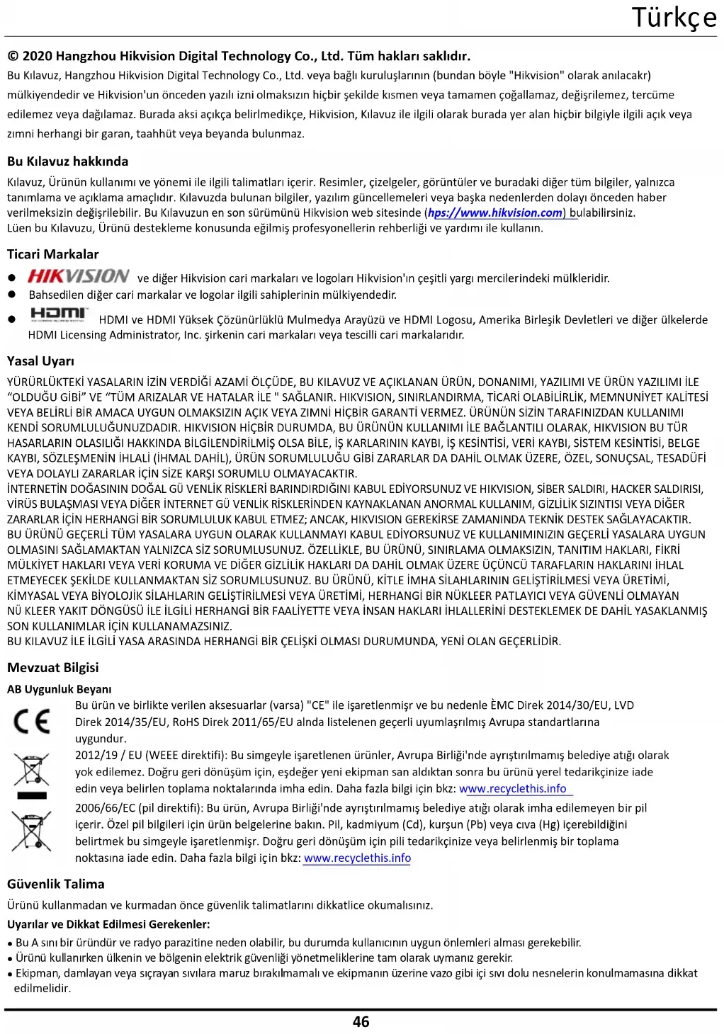 © 2020 Hangzhou Hikvision Digital Technology Co., Ltd. Tüm hakları saklıdır. Bu Kılavuz, Hangzhou Hikvision Digital Technology Co., Ltd. veya bağlı kuruluşlarının (bundan böyle "Hikvision" olarak anılacaktır) mülkiyetindedir ve Hikvision'un önceden yazılı izni olmaksızın hiçbir şekilde kısmen veya tamamen çoğaltılamaz, değiştirilemez, tercüme edilemez veya dağıtılamaz. Burada aksi açıkça belirtilmedikçe, Hikvision, Kılavuz ile ilgili olarak burada yer alan hiçbir bilgiyle ilgili açık veya zımni herhangi bir garanti, taahhüt veya beyanda bulunmaz. Bu Kılavuz hakkında Kılavuz, Ürünün kullanımı ve yönetimi ile ilgili talimatları içerir. Resimler, çizelgeler, görüntüler ve buradaki diğer tüm bilgiler, yalnızca tanımlama ve açıklama amaçlıdır. Kılavuzda bulunan bilgiler, yazılım güncellemeleri veya başka nedenlerden dolayı önceden haber verilmeksizin değiştirilebilir. Bu Kılavuzun en son sürümünü Hikvision web sitesinde (https://www.hikvision.com ) bulabilirsiniz. Lütfen bu Kılavuzu, Ürünü destekleme konusunda eğitilmiş profesyonellerin rehberliği ve yardımı ile kullanın. Ticari Markalar ve diğer Hikvision ticari markaları ve logoları Hikvision'ın çeşitli yargı mercilerindeki mülkleridir. Bahsedilen diğer ticari markalar ve logolar ilgili sahiplerinin mülkiyetindedir. HDMI ve HDMI Yüksek Çözünürlüklü Multimedya Arayüzü ve HDMI Logosu, Amerika Birleşik Devletleri ve diğer ülkelerde HDMI Licensing Administrator, Inc. şirketinin ticari markaları veya tescilli ticari markalarıdır. Yasal Uyarı YÜRÜRLÜKTEKİ YASALARIN İZİN VERDİĞİ AZAMİ ÖLÇÜDE, BU KILAVUZ VE AÇIKLANAN ÜRÜN, DONANIMI, YAZILIMI VE ÜRÜN YAZILIMI İLE “OLDUĞU GİBİ” VE “TÜM ARIZALAR VE HATALAR İLE " SAĞLANIR. HIKVISION, SINIRLANDIRMA, TİCARİ OLABİLİRLİK, MEMNUNİYET KALİTESİ VEYA BELİRLİ BİR AMACA UYGUN OLMAKSIZIN AÇIK VEYA ZIMNİ HİÇBİR GARANTİ VERMEZ. ÜRÜNÜN SİZİN TARAFINIZDAN KULLANIMI KENDİ SORUMLULUĞUNUZDADIR. HIKVISION HİÇBİR DURUMDA, BU ÜRÜNÜN KULLANIMI İLE BAĞLANTILI OLARAK, HIKVISION BU TÜR HASARLARIN OLASILIĞI HAKKINDA BİLGİLENDİRİLMİŞ OLSA BİLE, İŞ KARLARININ KAYBI, İŞ KESİNTİSİ, VERİ KAYBI, SİSTEM KESİNTİSİ, BELGE KAYBI, SÖZLEŞMENİN İHLALİ (İHMAL DAHİL), ÜRÜN SORUMLULUĞU GİBİ ZARARLAR DA DAHİL OLMAK ÜZERE, ÖZEL, SONUÇSAL, TESADÜFİ VEYA DOLAYLI ZARARLAR İÇİN SİZE KARŞI SORUMLU OLMAYACAKTIR. İNTERNETİN DOĞASININ DOĞAL GÜVENLİK RİSKLERİ BARINDIRDIĞINI KABUL EDİYORSUNUZ VE HIKVISION, SİBER SALDIRI, HACKER SALDIRISI, VİRÜS BULAŞMASI VEYA DİĞER İNTERNET GÜVENLİK RİSKLERİNDEN KAYNAKLANAN ANORMAL KULLANIM, GİZLİLİK SIZINTISI VEYA DİĞER ZARARLAR İÇİN HERHANGİ BİR SORUMLULUK KABUL ETMEZ; ANCAK, HIKVISION GEREKİRSE ZAMANINDA TEKNİK DESTEK SAĞLAYACAKTIR. BU ÜRÜNÜ GEÇERLİ TÜM YASALARA UYGUN OLARAK KULLANMAYI KABUL EDİYORSUNUZ VE KULLANIMINIZIN GEÇERLİ YASALARA UYGUN OLMASINI SAĞLAMAKTAN YALNIZCA SİZ SORUMLUSUNUZ. ÖZELLİKLE, BU ÜRÜNÜ, SINIRLAMA OLMAKSIZIN, TANITIM HAKLARI, FİKRİ MÜLKİYET HAKLARI VEYA VERİ KORUMA VE DİĞER GİZLİLİK HAKLARI DA DAHİL OLMAK ÜZERE ÜÇÜNCÜ TARAFLARIN HAKLARINI İHLAL ETMEYECEK ŞEKİLDE KULLANMAKTAN SİZ SORUMLUSUNUZ. BU ÜRÜNÜ, KİTLE İMHA SİLAHLARININ GELİŞTİRİLMESİ VEYA ÜRETİMİ, KİMYASAL VEYA BİYOLOJİK SİLAHLARIN GELİŞTİRİLMESİ VEYA ÜRETİMİ, HERHANGİ BİR NÜKLEER PATLAYICI VEYA GÜVENLİ OLMAYAN NÜKLEER YAKIT DÖNGÜSÜ İLE İLGİLİ HERHANGİ BİR FAALİYETTE VEYA İNSAN HAKLARI İHLALLERİNİ DESTEKLEMEK DE DAHİL YASAKLANMIŞ SON KULLANIMLAR İÇİN KULLANAMAZSINIZ. BU KILAVUZ İLE İLGİLİ YASA ARASINDA HERHANGİ BİR ÇELİŞKİ OLMASI DURUMUNDA, YENİ OLAN GEÇERLİDİR. Mevzuat Bilgisi AB Uygunluk Beyanı