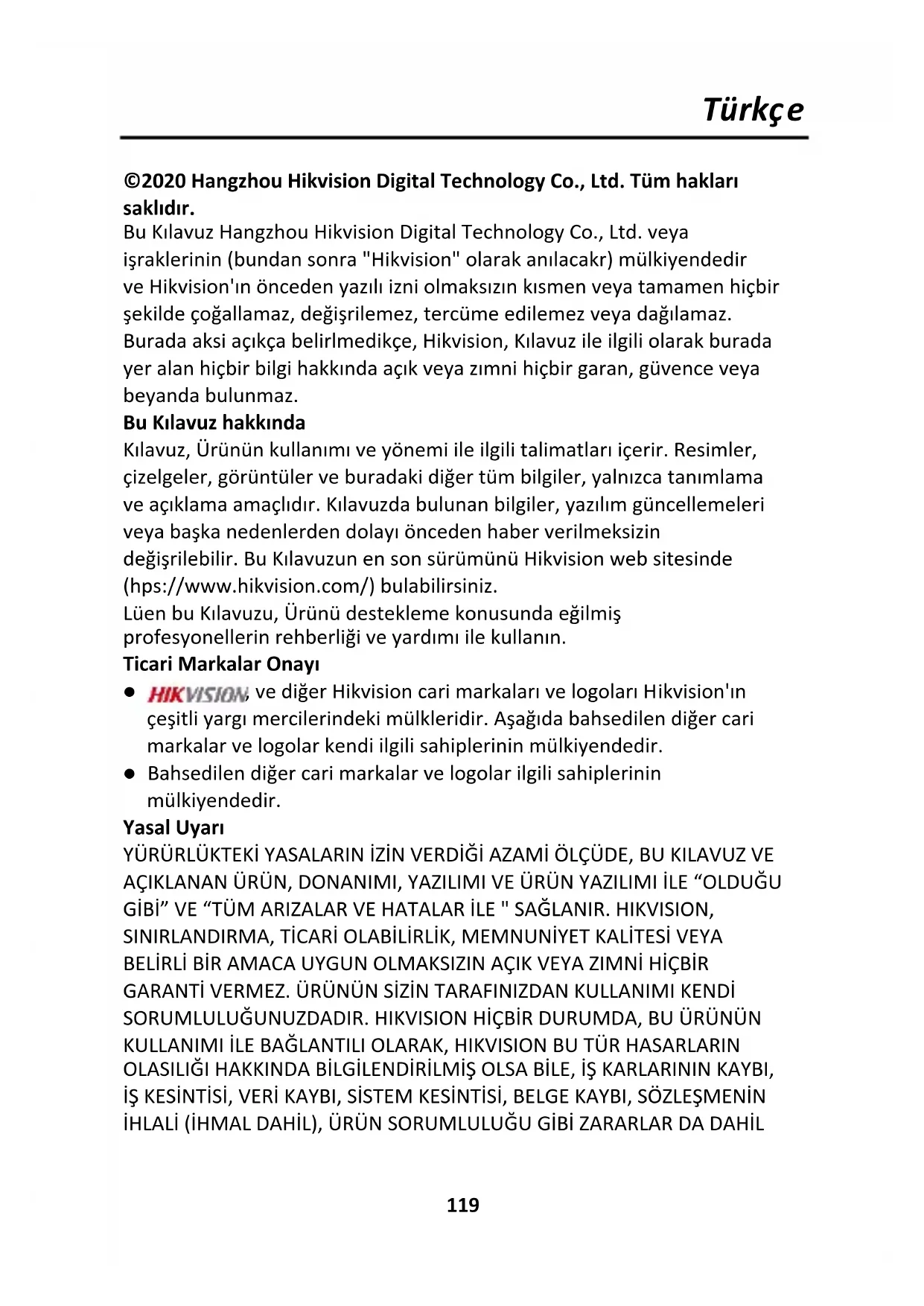 ©2020 Hangzhou Hikvision Digital Technology Co., Ltd. Tüm hakları saklıdır. Bu Kılavuz Hangzhou Hikvision Digital Technology Co., Ltd. veya iştiraklerinin (bundan sonra "Hikvision" olarak anılacaktır) mülkiyetindedir ve Hikvision'ın önceden yazılı izni olmaksızın kısmen veya tamamen hiçbir şekilde çoğaltılamaz, değiştirilemez, tercüme edilemez veya dağıtılamaz. Burada aksi açıkça belirtilmedikçe, Hikvision, Kılavuz ile ilgili olarak burada yer alan hiçbir bilgi hakkında açık veya zımni hiçbir garanti, güvence veya beyanda bulunmaz. Bu Kılavuz hakkında Kılavuz, Ürünün kullanımı ve yönetimi ile ilgili talimatları içerir. Resimler, çizelgeler, görüntüler ve buradaki diğer tüm bilgiler, yalnızca tanımlama ve açıklama amaçlıdır. Kılavuzda bulunan bilgiler, yazılım güncellemeleri veya başka nedenlerden dolayı önceden haber verilmeksizin değiştirilebilir. Bu Kılavuzun en son sürümünü Hikvision web sitesinde (https://www.hikvision.com/) bulabilirsiniz. Lütfen bu Kılavuzu, Ürünü destekleme konusunda eğitilmiş profesyonellerin rehberliği ve yardımı ile kullanın. Ticari Markalar Onayı , ve diğer Hikvision ticari markaları ve logoları Hikvision'ın çeşitli yargı mercilerindeki mülkleridir. Aşağıda bahsedilen diğer ticari markalar ve logolar kendi ilgili sahiplerinin mülkiyetindedir. Bahsedilen diğer ticari markalar ve logolar ilgili sahiplerinin mülkiyetindedir. Yasal Uyarı YÜRÜRLÜKTEKİ YASALARIN İZİN VERDİĞİ AZAMİ ÖLÇÜDE, BU KILAVUZ VE AÇIKLANAN ÜRÜN, DONANIMI, YAZILIMI VE ÜRÜN YAZILIMI İLE “OLDUĞU GİBİ” VE “TÜM ARIZALAR VE HATALAR İLE " SAĞLANIR. HIKVISION, SINIRLANDIRMA, TİCARİ OLABİLİRLİK, MEMNUNİYET KALİTESİ VEYA BELİRLİ BİR AMACA UYGUN OLMAKSIZIN AÇIK VEYA ZIMNİ HİÇBİR GARANTİ VERMEZ. ÜRÜNÜN SİZİN TARAFINIZDAN KULLANIMI KENDİ SORUMLULUĞUNUZDADIR. HIKVISION HİÇBİR DURUMDA, BU ÜRÜNÜN KULLANIMI İLE BAĞLANTILI OLARAK, HIKVISION BU TÜR HASARLARIN OLASILIĞI HAKKINDA BİLGİLENDİRİLMİŞ OLSA BİLE, İŞ KARLARININ KAYBI, İŞ KESİNTİSİ, VERİ KAYBI, SİSTEM KESİNTİSİ, BELGE KAYBI, SÖZLEŞMENİN İHLALİ (İHMAL DAHİL), ÜRÜN SORUMLULUĞU GİBİ ZARARLAR DA DAHİLTürkçe
