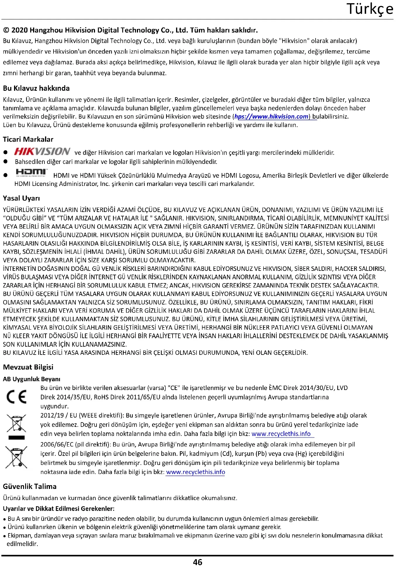 © 2020 Hangzhou Hikvision Digital Technology Co., Ltd. Tüm hakları saklıdır. Bu Kılavuz, Hangzhou Hikvision Digital Technology Co., Ltd. veya bağlı kuruluşlarının (bundan böyle "Hikvision" olarak anılacaktır) mülkiyetindedir ve Hikvision'un önceden yazılı izni olmaksızın hiçbir şekilde kısmen veya tamamen çoğaltılamaz, değiştirilemez, tercüme edilemez veya dağıtılamaz. Burada aksi açıkça belirtilmedikçe, Hikvision, Kılavuz ile ilgili olarak burada yer alan hiçbir bilgiyle ilgili açık veya zımni herhangi bir garanti, taahhüt veya beyanda bulunmaz. Bu Kılavuz hakkında Kılavuz, Ürünün kullanımı ve yönetimi ile ilgili talimatları içerir. Resimler, çizelgeler, görüntüler ve buradaki diğer tüm bilgiler, yalnızca tanımlama ve açıklama amaçlıdır. Kılavuzda bulunan bilgiler, yazılım güncellemeleri veya başka nedenlerden dolayı önceden haber verilmeksizin değiştirilebilir. Bu Kılavuzun en son sürümünü Hikvision web sitesinde (https://www.hikvision.com ) bulabilirsiniz. Lütfen bu Kılavuzu, Ürünü destekleme konusunda eğitilmiş profesyonellerin rehberliği ve yardımı ile kullanın. Ticari Markalar ve diğer Hikvision ticari markaları ve logoları Hikvision'ın çeşitli yargı mercilerindeki mülkleridir. Bahsedilen diğer ticari markalar ve logolar ilgili sahiplerinin mülkiyetindedir. HDMI ve HDMI Yüksek Çözünürlüklü Multimedya Arayüzü ve HDMI Logosu, Amerika Birleşik Devletleri ve diğer ülkelerde HDMI Licensing Administrator, Inc. şirketinin ticari markaları veya tescilli ticari markalarıdır. Yasal Uyarı YÜRÜRLÜKTEKİ YASALARIN İZİN VERDİĞİ AZAMİ ÖLÇÜDE, BU KILAVUZ VE AÇIKLANAN ÜRÜN, DONANIMI, YAZILIMI VE ÜRÜN YAZILIMI İLE “OLDUĞU GİBİ” VE “TÜM ARIZALAR VE HATALAR İLE " SAĞLANIR. HIKVISION, SINIRLANDIRMA, TİCARİ OLABİLİRLİK, MEMNUNİYET KALİTESİ VEYA BELİRLİ BİR AMACA UYGUN OLMAKSIZIN AÇIK VEYA ZIMNİ HİÇBİR GARANTİ VERMEZ. ÜRÜNÜN SİZİN TARAFINIZDAN KULLANIMI KENDİ SORUMLULUĞUNUZDADIR. HIKVISION HİÇBİR DURUMDA, BU ÜRÜNÜN KULLANIMI İLE BAĞLANTILI OLARAK, HIKVISION BU TÜR HASARLARIN OLASILIĞI HAKKINDA BİLGİLENDİRİLMİŞ OLSA BİLE, İŞ KARLARININ KAYBI, İŞ KESİNTİSİ, VERİ KAYBI, SİSTEM KESİNTİSİ, BELGE KAYBI, SÖZLEŞMENİN İHLALİ (İHMAL DAHİL), ÜRÜN SORUMLULUĞU GİBİ ZARARLAR DA DAHİL OLMAK ÜZERE, ÖZEL, SONUÇSAL, TESADÜFİ VEYA DOLAYLI ZARARLAR İÇİN SİZE KARŞI SORUMLU OLMAYACAKTIR. İNTERNETİN DOĞASININ DOĞAL GÜVENLİK RİSKLERİ BARINDIRDIĞINI KABUL EDİYORSUNUZ VE HIKVISION, SİBER SALDIRI, HACKER SALDIRISI, VİRÜS BULAŞMASI VEYA DİĞER İNTERNET GÜVENLİK RİSKLERİNDEN KAYNAKLANAN ANORMAL KULLANIM, GİZLİLİK SIZINTISI VEYA DİĞER ZARARLAR İÇİN HERHANGİ BİR SORUMLULUK KABUL ETMEZ; ANCAK, HIKVISION GEREKİRSE ZAMANINDA TEKNİK DESTEK SAĞLAYACAKTIR. BU ÜRÜNÜ GEÇERLİ TÜM YASALARA UYGUN OLARAK KULLANMAYI KABUL EDİYORSUNUZ VE KULLANIMINIZIN GEÇERLİ YASALARA UYGUN OLMASINI SAĞLAMAKTAN YALNIZCA SİZ SORUMLUSUNUZ. ÖZELLİKLE, BU ÜRÜNÜ, SINIRLAMA OLMAKSIZIN, TANITIM HAKLARI, FİKRİ MÜLKİYET HAKLARI VEYA VERİ KORUMA VE DİĞER GİZLİLİK HAKLARI DA DAHİL OLMAK ÜZERE ÜÇÜNCÜ TARAFLARIN HAKLARINI İHLAL ETMEYECEK ŞEKİLDE KULLANMAKTAN SİZ SORUMLUSUNUZ. BU ÜRÜNÜ, KİTLE İMHA SİLAHLARININ GELİŞTİRİLMESİ VEYA ÜRETİMİ, KİMYASAL VEYA BİYOLOJİK SİLAHLARIN GELİŞTİRİLMESİ VEYA ÜRETİMİ, HERHANGİ BİR NÜKLEER PATLAYICI VEYA GÜVENLİ OLMAYAN NÜKLEER YAKIT DÖNGÜSÜ İLE İLGİLİ HERHANGİ BİR FAALİYETTE VEYA İNSAN HAKLARI İHLALLERİNİ DESTEKLEMEK DE DAHİL YASAKLANMIŞ SON KULLANIMLAR İÇİN KULLANAMAZSINIZ. BU KILAVUZ İLE İLGİLİ YASA ARASINDA HERHANGİ BİR ÇELİŞKİ OLMASI DURUMUNDA, YENİ OLAN GEÇERLİDİR. Mevzuat Bilgisi AB Uygunluk Beyanı