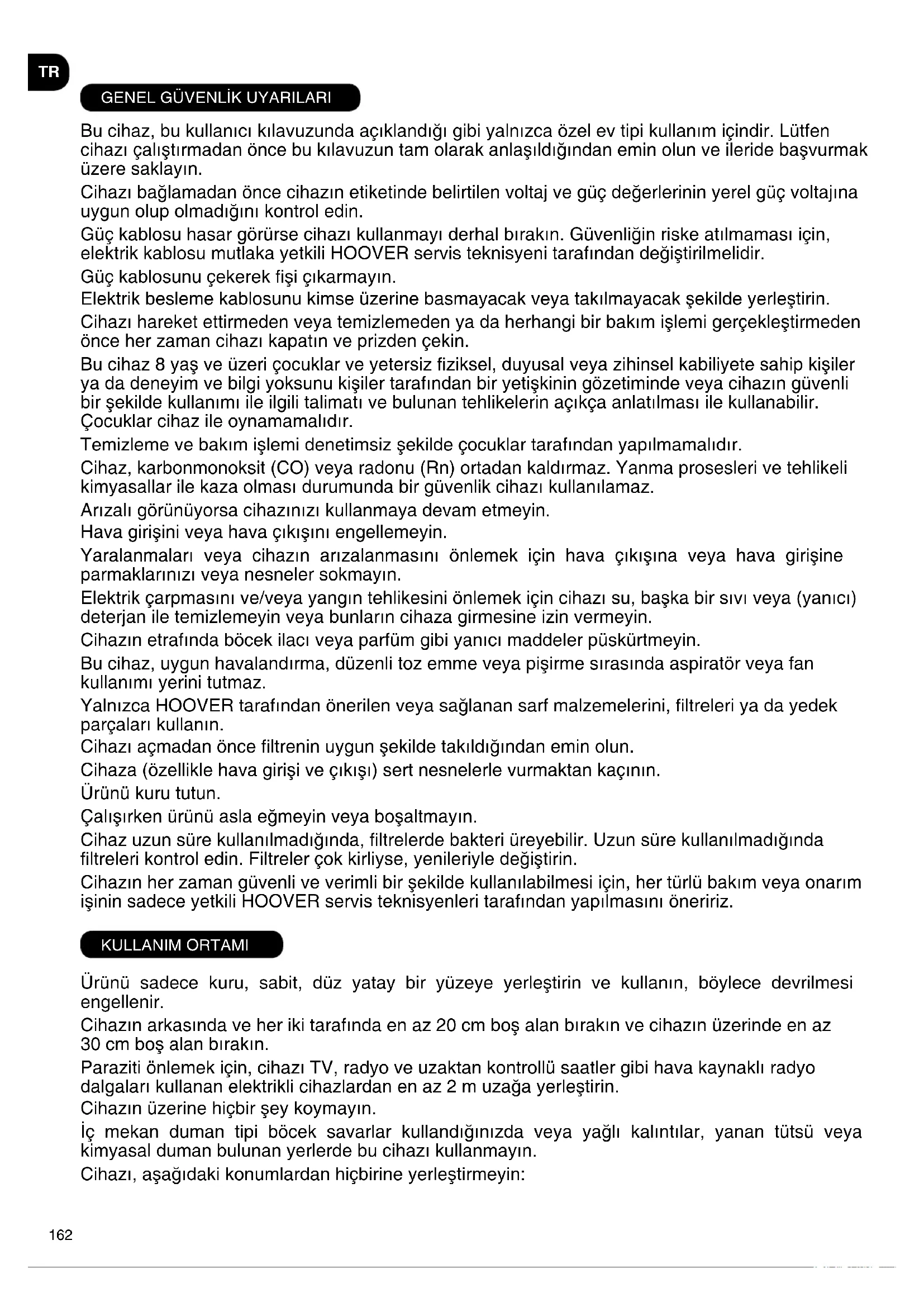 Bu cihaz, bu kullanıcı kılavuzunda açıklandığı gibi yalnızca özel ev tipi kullanım içindir. Lütfen cihazı çalıştırmadan önce bu kılavuzun tam olarak anlaşıldığından emin olun ve ileride başvurmak üzere saklayın. Cihazı bağlamadan önce cihazın etiketinde belirtilen voltaj ve güç değerlerinin yerel güç voltajına uygun olup olmadığını kontrol edin. Güç kablosu hasar görürse cihazı kullanmayı derhal bırakın. Güvenliğin riske atılmaması için, elektrik kablosu mutlaka yetkili HOOVER servis teknisyeni tarafından değiştirilmelidir. Güç kablosunu çekerek şi çıkarmayın. Elektrik besleme kablosunu kimse üzerine basmayacak veya takılmayacak şekilde yerleştirin. Cihazı hareket ettirmeden veya temizlemeden ya da herhangi bir bakım işlemi gerçekleştirmeden önce her zaman cihazı kapatın ve prizden çekin. Bu cihaz 8 yaş ve üzeri çocuklar ve yetersiz ziksel, duyusal veya zihinsel kabiliyete sahip kişiler ya da deneyim ve bilgi yoksunu kişiler tarafından bir yetişkinin gözetiminde veya cihazın güvenli bir şekilde kullanımı ile ilgili talimatı ve bulunan tehlikelerin açıkça anlatılması ile kullanabilir. Çocuklar cihaz ile oynamamalıdır. Temizleme ve bakım işlemi denetimsiz şekilde çocuklar tarafından yapılmamalıdır. Cihaz, karbonmonoksit (CO) veya radonu (Rn) ortadan kaldırmaz. Yanma prosesleri ve tehlikeli kimyasallar ile kaza olması durumunda bir güvenlik cihazı kullanılamaz. Arızalı görünüyorsa cihazınızı kullanmaya devam etmeyin. Hava girişini veya hava çıkışını engellemeyin. Yaralanmaları veya cihazın arızalanmasını önlemek için hava çıkışına veya hava girişine parmaklarınızı veya nesneler sokmayın. Elektrik çarpmasını ve/veya yangın tehlikesini önlemek için cihazı su, başka bir sıvı veya (yanıcı) deterjan ile temizlemeyin veya bunların cihaza girmesine izin vermeyin. Cihazın etrafında böcek ilacı veya parfüm gibi yanıcı maddeler püskürtmeyin. Bu cihaz, uygun havalandırma, düzenli toz emme veya pişirme sırasında aspiratör veya fan kullanımı yerini tutmaz. Yalnızca HOOVER tarafından önerilen veya sağlanan sarf malzemelerini, ltreleri ya da yedek parçaları kullanın. Cihazı açmadan önce ltrenin uygun şekilde takıldığından emin olun. Cihaza (özellikle hava girişi ve çıkışı) sert nesnelerle vurmaktan kaçının. Ürünü kuru tutun. Çalışırken ürünü asla eğmeyin veya boşaltmayın. Cihaz uzun süre kullanılmadığında, ltrelerde bakteri üreyebilir. Uzun süre kullanılmadığında ltreleri kontrol edin. Filtreler çok kirliyse, yenileriyle değiştirin. Cihazın her zaman güvenli ve verimli bir şekilde kullanılabilmesi için, her türlü bakım veya onarım işinin sadece yetkili HOOVER servis teknisyenleri tarafından yapılmasını öneririz. KULLANIM ORTAMI Ürünü sadece kuru, sabit, düz yatay bir yüzeye yerleştirin ve kullanın, böylece devrilmesi engellenir. Cihazın arkasında ve her iki tarafında en az 20 cm boş alan bırakın ve cihazın üzerinde en az 30 cm boş alan bırakın. Paraziti önlemek için, cihazı TV, radyo ve uzaktan kontrollü saatler gibi hava kaynaklı radyo dalgaları kullanan elektrikli cihazlardan en az 2 m uzağa yerleştirin. Cihazın üzerine hiçbir şey koymayın. İç mekan duman tipi böcek savarlar kullandığınızda veya yağlı kalıntılar, yanan tütsü veya kimyasal duman bulunan yerlerde bu cihazı kullanmayın. Cihazı, aşağıdaki konumlardan hiçbirine yerleştirmeyin:163