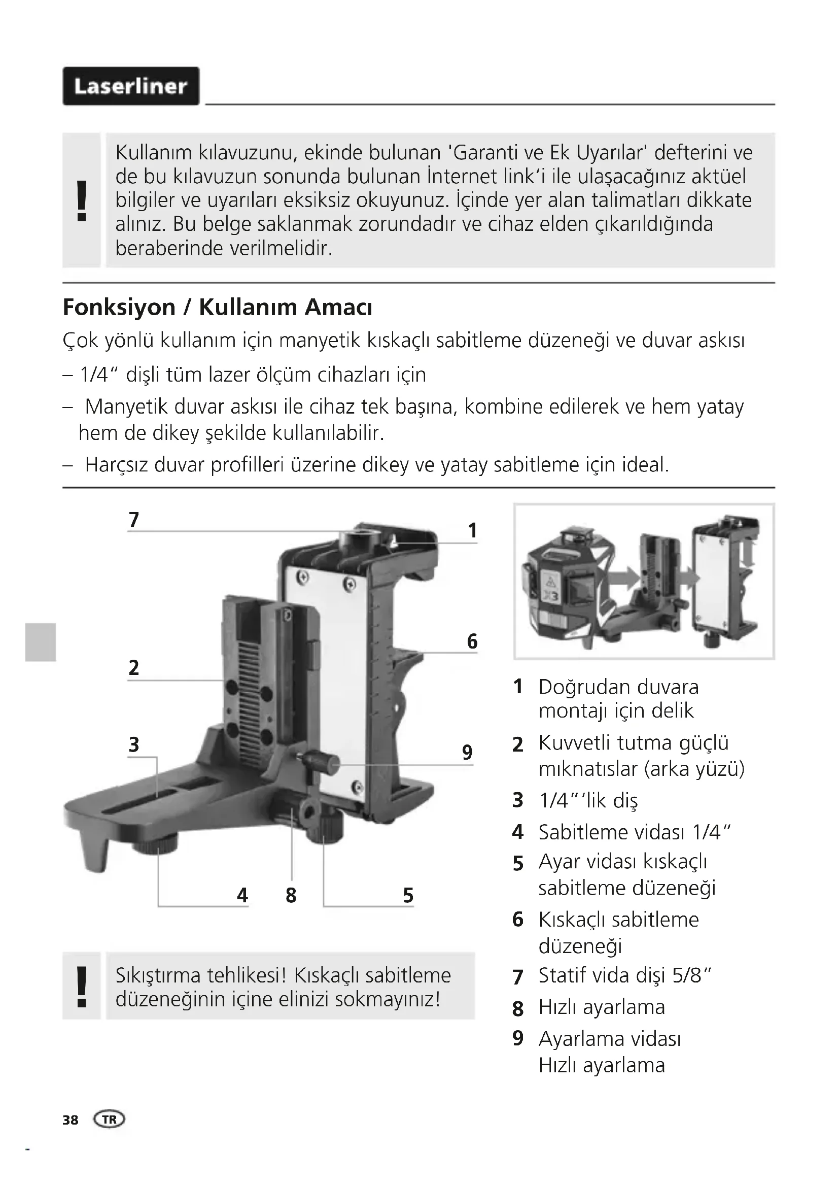Fonksiyon / Kullanım Amacı Çok yönlü kullanım için manyetik kıskaçlı sabitleme düzeneği ve duvar askısı – 1/4“ dişli tüm lazer ölçüm cihazları için – Manyetik duvar askısı ile cihaz tek başına, kombine edilerek ve hem yatay hem de dikey şekilde kullanılabilir. – Harçsız duvar prolleri üzerine dikey ve yatay sabitleme için ideal. Kullanım kılavuzunu, ekinde bulunan 'Garanti ve Ek Uyarılar' defterini ve de bu kılavuzun sonunda bulunan İnternet link‘i ile ulaşacağınız aktüel bilgiler ve uyarıları eksiksiz okuyunuz. İçinde yer alan talimatları dikkate alınız. Bu belge saklanmak zorundadır ve cihaz elden çıkarıldığında beraberinde verilmelidir.