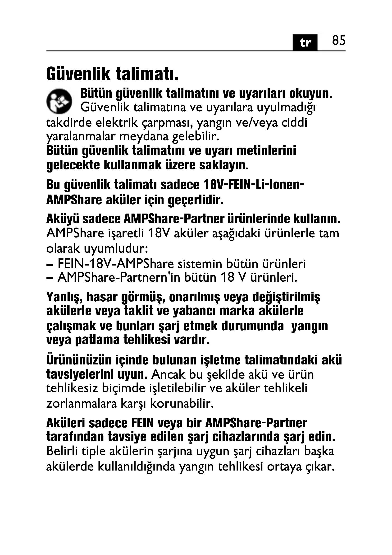 Güvenlik talimatı. Bütün güvenlik talimatını ve uyarıları okuyun. Güvenlik talimatına ve uyarılara uyulmadığı takdirde elektrik çarpması, yangın ve/veya ciddi yaralanmalar meydana gelebilir. Bütün güvenlik talimatını ve uyarı metinlerini gelecekte kullanmak üzere saklayın. Bu güvenlik talimatı sadece 18V-FEIN-Li-Ionen- AMPShare aküler için geçerlidir. Aküyü sadece AMPShare-Partner ürünlerinde kullanın. AMPShare işaretli 18V aküler aşağıdaki ürünlerle tam olarak uyumludur: – FEIN-18V-AMPShare sistemin bütün ürünleri – AMPShare-Partnern'in bütün 18 V ürünleri. Yanlış, hasar görmüş, onarılmış veya değiştirilmiş akülerle veya taklit ve yabancı marka akülerle çalışmak ve bunları şarj etmek durumunda yangın veya patlama tehlikesi vardır. Ürününüzün içinde bulunan işletme talimatındaki akü tavsiyelerini uyun. Ancak bu şekilde akü ve ürün tehlikesiz biçimde işletilebilir ve aküler tehlikeli zorlanmalara karşı korunabilir. Aküleri sadece FEIN veya bir AMPShare-Partner tarafından tavsiye edilen şarj cihazlarında şarj edin. Belirli tiple akülerin şarjına uygun şarj cihazları başka akülerde kullanıldığında yangın tehlikesi ortaya çıkar.86