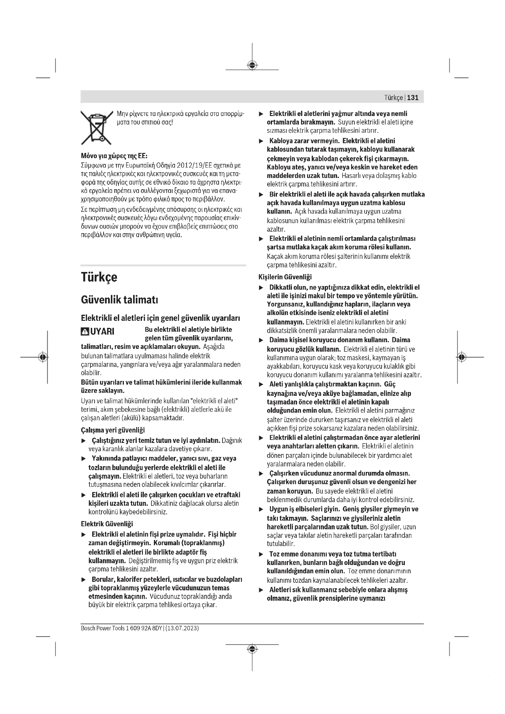 1 609 92A 8DY | (13.07.2023) Bosch Power ToolsTürkçe | 131 Μην ρίχνετε τα ηλεκτρικά εργαλεία στα απορρίμ- ματα του σπιτιού σας! Μόνο για χώρες τηςΕΕ: Σύμφωνα με την Ευρωπαϊκή Οδηγία 2012/19/ΕΕ σχετικά με τις παλιές ηλεκτρικές και ηλεκτρονικές συσκευές και τη μετα- φορά της οδηγίας αυτής σε εθνικό δίκαιο τα άχρηστα ηλεκτρι- κά εργαλεία πρέπει να συλλέγονται ξεχωριστά για να επανα- χρησιμοποιηθούν με τρόπο φιλικό προς το περιβάλλον. Σε περίπτωση μη ενδεδειγμένης απόσυρσης οι ηλεκτρικές και ηλεκτρονικές συσκευές λόγω ενδεχομένης παρουσίας επικίν- δυνων ουσιών μπορούν να έχουν επιβλαβείς επιπτώσεις στο περιβάλλον και στην ανθρώπινη υγεία. Türkçe Güvenlik talimatı Elektrikli el aletleri için genel güvenlik uyarıları UYARI Bu elektrikli el aletiyle birlikte gelen tüm güvenlik uyarılarını, talimatları, resim ve açıklamaları okuyun. Aşağıda bulunan talimatlara uyulmaması halinde elektrik çarpmalarına, yangınlara ve/veya ağır yaralanmalara neden olabilir. Bütün uyarıları ve talimat hükümlerini ileride kullanmak üzere saklayın. Uyarı ve talimat hükümlerinde kullanılan "elektrikli el aleti" terimi, akım şebekesine bağlı (elektrikli) aletlerle akü ile çalışan aletleri (akülü) kapsamaktadır. Çalışma yeri güvenliği u Çalıştığınız yeri temiz tutun ve iyi aydınlatın. Dağınık veya karanlık alanlar kazalara davetiye çıkarır. u Yakınında patlayıcı maddeler, yanıcı sıvı, gaz veya tozların bulunduğu yerlerde elektrikli el aleti ile çalışmayın. Elektrikli el aletleri, toz veya buharların tutuşmasına neden olabilecek kıvılcımlar çıkarırlar. u Elektrikli el aleti ile çalışırken çocukları ve etraftaki kişileri uzakta tutun. Dikkatiniz dağılacak olursa aletin kontrolünü kaybedebilirsiniz. Elektrik Güvenliği u Elektrikli el aletinin fişi prize uymalıdır. Fişi hiçbir zaman değiştirmeyin. Korumalı (topraklanmış) elektrikli el aletleri ile birlikte adaptör fiş kullanmayın. Değiştirilmemiş fiş ve uygun priz elektrik çarpma tehlikesini azaltır. u Borular, kalorifer petekleri, ısıtıcılar ve buzdolapları gibi topraklanmış yüzeylerle vücudunuzun temas etmesinden kaçının. Vücudunuz topraklandığı anda büyük bir elektrik çarpma tehlikesi ortaya çıkar. u Elektrikli el aletlerini yağmur altında veya nemli ortamlarda bırakmayın. Suyun elektrikli el aleti içine sızması elektrik çarpma tehlikesini artırır. u Kabloya zarar vermeyin. Elektrikli el aletini kablosundan tutarak taşımayın, kabloyu kullanarak çekmeyin veya kablodan çekerek fişi çıkarmayın. Kabloyu ateş, yanıcı ve/veya keskin ve hareket eden maddelerden uzak tutun. Hasarlı veya dolaşmış kablo elektrik çarpma tehlikesini artırır. u Bir elektrikli el aleti ile açık havada çalışırken mutlaka açık havada kullanılmaya uygun uzatma kablosu kullanın. Açık havada kullanılmaya uygun uzatma kablosunun kullanılması elektrik çarpma tehlikesini azaltır. u Elektrikli el aletinin nemli ortamlarda çalıştırılması şartsa mutlaka kaçak akım koruma rölesi kullanın. Kaçak akım koruma rölesi şalterinin kullanımı elektrik çarpma tehlikesini azaltır. Kişilerin Güvenliği u Dikkatli olun, ne yaptığınıza dikkat edin, elektrikli el aleti ile işinizi makul bir tempo ve yöntemle yürütün. Yorgunsanız, kullandığınız hapların, ilaçların veya alkolün etkisinde iseniz elektrikli el aletini kullanmayın. Elektrikli el aletini kullanırken bir anki dikkatsizlik önemli yaralanmalara neden olabilir. u Daima kişisel koruyucu donanım kullanın. Daima koruyucu gözlük kullanın. Elektrikli el aletinin türü ve kullanımına uygun olarak; toz maskesi, kaymayan iş ayakkabıları, koruyucu kask veya koruyucu kulaklık gibi koruyucu donanım kullanımı yaralanma tehlikesini azaltır. u Aleti yanlışlıkla çalıştırmaktan kaçının. Güç kaynağına ve/veya aküye bağlamadan, elinize alıp taşımadan önce elektrikli el aletinin kapalı olduğundan emin olun. Elektrikli el aletini parmağınız şalter üzerinde dururken taşırsanız ve elektrikli el aleti açıkken fişi prize sokarsanız kazalara neden olabilirsiniz. u Elektrikli el aletini çalıştırmadan önce ayar aletlerini veya anahtarları aletten çıkarın. Elektrikli el aletinin dönen parçaları içinde bulunabilecek bir yardımcı alet yaralanmalara neden olabilir. u Çalışırken vücudunuz anormal durumda olmasın. Çalışırken duruşunuz güvenli olsun ve dengenizi her zaman koruyun. Bu sayede elektrikli el aletini beklenmedik durumlarda daha iyi kontrol edebilirsiniz. u Uygun iş elbiseleri giyin. Geniş giysiler giymeyin ve takı takmayın. Saçlarınızı ve giysileriniz aletin hareketli parçalarından uzak tutun. Bol giysiler, uzun saçlar veya takılar aletin hareketli parçaları tarafından tutulabilir. u Toz emme donanımı veya toz tutma tertibatı kullanırken, bunların bağlı olduğundan ve doğru kullanıldığından emin olun. Toz emme donanımının kullanımı tozdan kaynalanabilecek tehlikeleri azaltır. u Aletleri sık kullanmanız sebebiyle onlara alışmış olmanız, güvenlik prensiplerine uymanızı Bosch Power Tools 1 609 92A 8DY | (13.07.2023)132 | Türkçe önlememelidir. Dikkatsiz bir hareket, bir anda ciddi yaralanmalara yol açabilir. Elektrikli el aletlerinin kullanımı ve bakımı u Elektrikli el aletini aşırı ölçüde zorlamayın. Yaptığınız işe uygun elektrikli el aletleri kullanın.
