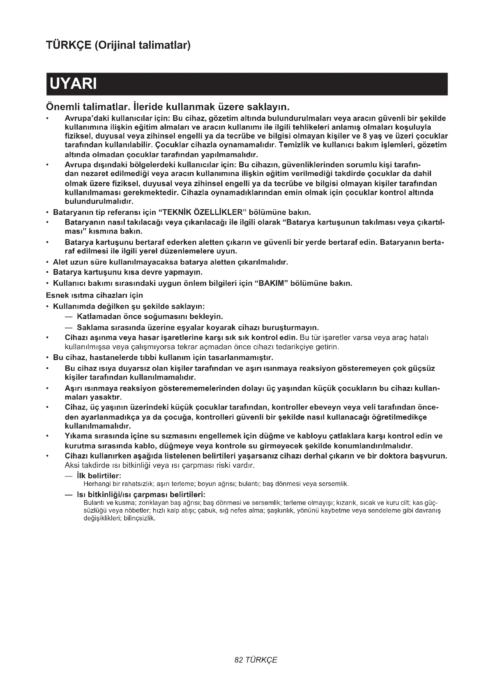TÜRKÇE (Orijinal talimatlar) UYARI Önemli talimatlar. İleride kullanmak üzere saklayın.