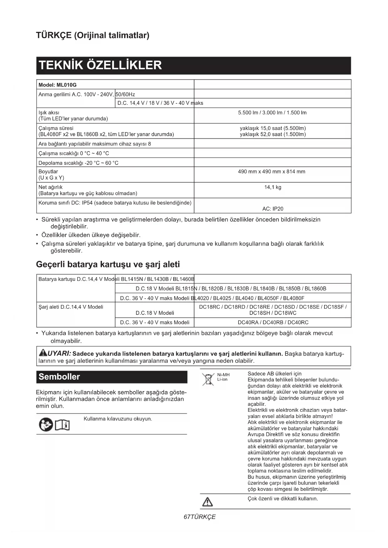 - Yukarıda listelenen batarya kartuşlarının ve şarj aletlerinin bazıları yaşadığınız bölgeye bağlı olarak mevcut olmayabilir. UYARI: Sadece yukarıda listelenen batarya kartuşlarını ve şarj aletlerini kullanın. Başka batarya kartuş- larının ve şarj aletlerinin kullanılması yaralanma ve/veya yangına neden olabilir. Semboller Ekipmanı için kullanılabilecek semboller aşağıda göste- rilmiştir. Kullanmadan önce anlamlarını anladığınızdan emin olun. Kullanma kılavuzunu okuyun. Ni-MH Li-ion Sadece AB ülkeleri için Ekipmanda tehlikeli bileşenler bulundu- ğundan dolayı atık elektrikli ve elektronik ekipmanlar, aküler ve bataryalar çevre ve insan sağlığı üzerinde olumsuz etkiye yol açabilir. Elektrikli ve elektronik cihazları veya batar- yaları evsel atıklarla birlikte atmayın! Atık elektrikli ve elektronik ekipmanlar ile akümülatörler ve bataryalar hakkındaki Avrupa Direktifi ve söz konusu direktifin ulusal yasalara uyarlanması gereğince atık elektrikli ekipmanlar, bataryalar ve akümülatörler ayrı olarak depolanmalı ve çevre koruma hakkındaki mevzuata uygun olarak faaliyet gösteren ayrı bir kentsel atık toplama noktasına teslim edilmelidir. Bu husus, ekipmanın üzerine yerleştirilmiş üzerinde çarpı işareti bulunan tekerlekli çöp kovası simgesi ile belirtilmiştir. Çok özenli ve dikkatli kullanın.68 TÜRKÇE Optik Işınım (UV ve IR).Gözlerin ve cildin maruz kalmasını en alt düzeye indirin.Çalışan lambaya bakmayın.Uygun siper veya göz koruması kullanın.Cihazı AC güç ile kullanırken yağmurda, karda, nemli veya ıslak koşullarda kullanmayın.Şalter yeniden başlatma düğmesi. Not Bu ürün, enerji verimlilik sınıfı <C> ve <D> olan ışık kaynakları içerir. Güç beslemesi Aletin sadece tip plakasında belirtilenle aynı gerilime sahip bir güç kaynağına bağlanması gerekmekte olup sadece tek faz AC besleme ile çalıştırılabilir. Operatörü elektrik çarpmasına karşı korumak için bu alet kullanım sırasında topraklanmalıdır. Sadece üç uçlu topraklı tip fişleri ve aletin fişinin takılabileceği üç kutuplu prizleri olan üç damarlı uzatma kabloları kullanın.