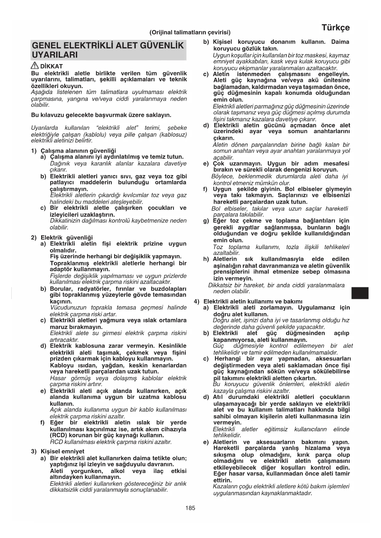 a) Elektrikli aleti zorlamayın. Uygulamanız için doğru alet kullanın. Doğru alet, işinizi daha iyi ve tasarlanmış olduğu hız değerinde daha güvenli şekilde yapacaktır. b) Elektrikli alet güç düğmesinden açılıp kapanmıyorsa, aleti kullanmayın. Güç düğmesiyle kontrol edilemeyen bir alet tehlikelidir ve tamir edilmeden kullanılmamalıdır. c) Herhangi bir ayar yapmadan, aksesuarları değiştirmeden veya aleti saklamadan önce fi şi güç kaynağından sökün ve/veya sökülebilirse pil takımını elektrikli aletten çıkartın. Bu koruyucu güvenlik önlemleri, elektrikli aletin kazayla çalışma riskini azaltır. d) Atı l durumdaki elektrikli aletleri çocukların ulaşamayacağı bir yerde saklayın ve elektrikli alet ve bu kullanım talimatları hakkında bilgi sahibi olmayan kişilerin aleti kullanmasına izin vermeyin. Elektrikli aletler eğitimsiz kullanıcıların elinde tehlikelidir. e) Aletlerin ve aksesuarların bakımını yapın. Hareketli parçalarda yanlış hizalama veya sıkışma olup olmadığını, kırık parça olup olmadığını ve elektrikli aletin çalışmasını etkileyebilecek diğer koşulları kontrol edin. Eğer hasar varsa, kullanmadan önce aleti tamir ettirin. Kazaların çoğu elektrikli aletlere kötü bakım işlemleri uygulanması ndan kaynaklanmaktadır. GENEL ELEKTRİKLİ ALET GÜVENLİK UYARILARI DİKKAT Bu elektrikli aletle birlikte verilen tüm güvenlik uyarılarını, talimatları, şekilli açıklamaları ve teknik özellikleri okuyun. Aşağıda listelenen tüm talimatlara uyulmaması elektrik çarpmasına, yangına ve/veya ciddi yaralanmaya neden olabilir. Bu kılavuzu gelecekte başvurmak üzere saklayın. Uyarılarda kullanılan “elektrikli alet” terimi, şebeke elektriğiyle çalışan (kablolu) veya pille çalışan (kablosuz) elektrikli aletinizi belirtir.