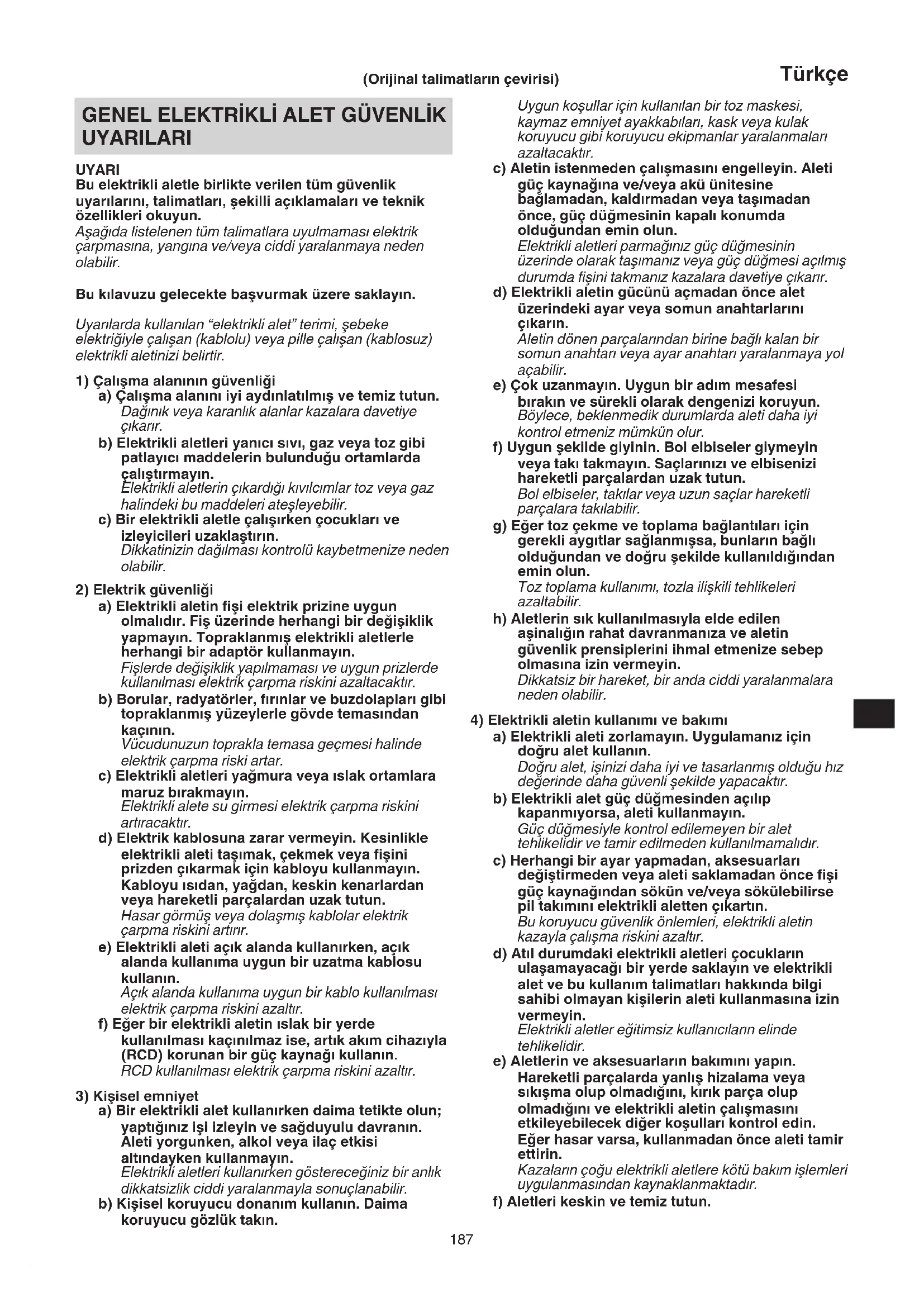 GENEL ELEKTRİKLİ ALET GÜVENLİK UYARILARI UYARI Bu elektrikli aletle birlikte verilen tüm güvenlik uyarılarını, talimatları, şekilli açıklamaları ve teknik özellikleri okuyun. Aşağıda listelenen tüm talimatlara uyulmaması elektrik çarpmasına, yangına ve/veya ciddi yaralanmaya neden olabilir. Bu kılavuzu gelecekte başvurmak üzere saklayın. Uyarılarda kullanılan “elektrikli alet” terimi, şebeke elektriğiyle çalışan (kablolu) veya pille çalışan (kablosuz) elektrikli aletinizi belirtir.