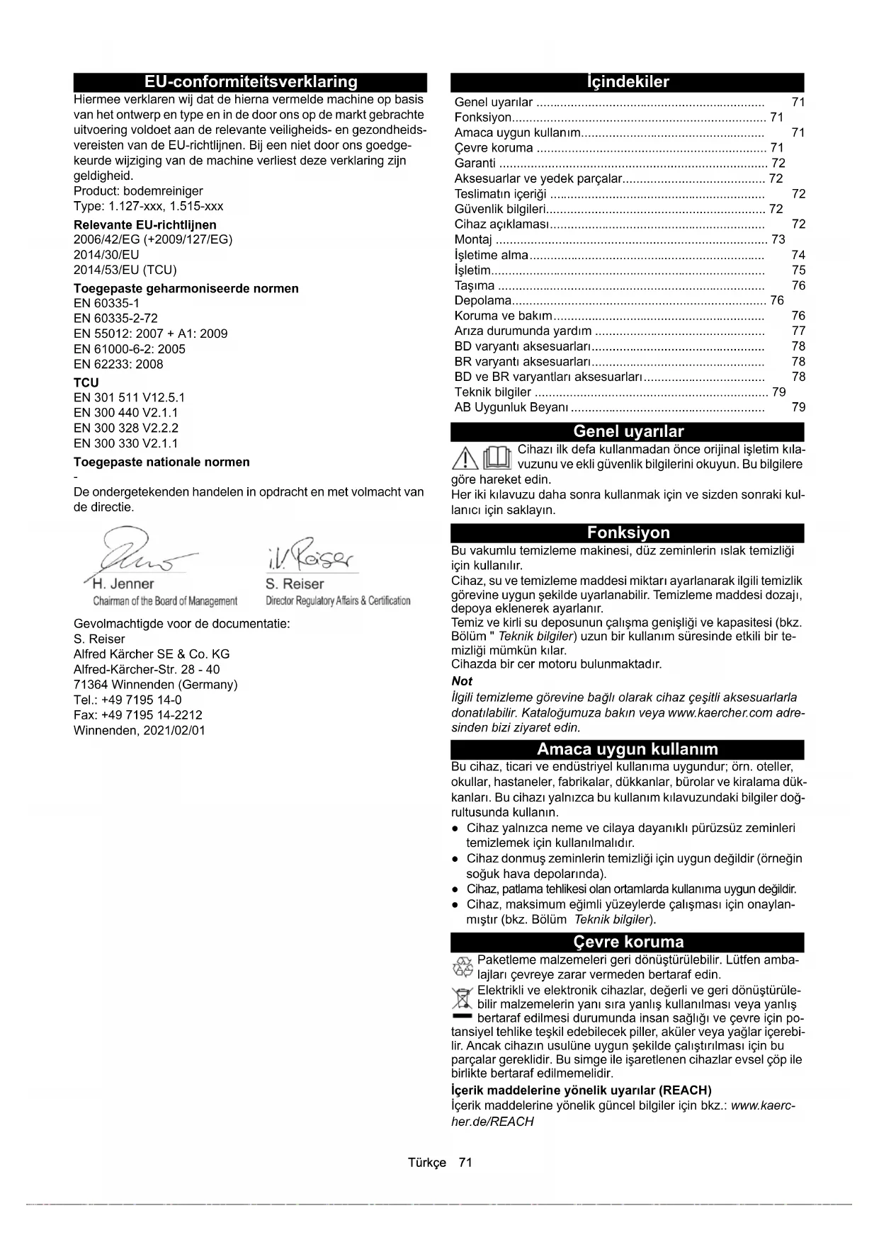 • De ondergetekenden handelen in opdracht en met volmacht van de directie. Gevolmachtigde voor de documentatie: S. Reiser Alfred Kärcher SE & Co. KG Alfred-Kärcher-Str. 28 - 40 71364 Winnenden (Germany) Tel.: +49 7195 14-0 Fax: +49 7195 14-2212 Winnenden, 2021/02/01 İçindekiler Genel uyarılar Cihazı ilk defa kullanmadan önce orijinal işletim kıla- vuzunu ve ekli güvenlik bilgilerini okuyun. Bu bilgilere göre hareket edin. Her iki kılavuzu daha sonra kullanmak için ve sizden sonraki kul- lanıcı için saklayın. Fonksiyon Bu vakumlu temizleme makinesi, düz zeminlerin ıslak temizliği için kullanılır. Cihaz, su ve temizleme maddesi miktarı ayarlanarak ilgili temizlik görevine uygun şekilde uyarlanabilir. Temizleme maddesi dozajı, depoya eklenerek ayarlanır. Temiz ve kirli su deposunun çalışma genişliği ve kapasitesi (bkz. Bölüm " Teknik bilgiler) uzun bir kullanım süresinde etkili bir te- mizliği mümkün kılar. Cihazda bir cer motoru bulunmaktadır. Not İlgili temizleme görevine bağlı olarak cihaz çeşitli aksesuarlarla donatılabilir. Kataloğumuza bakın veya www.kaercher.com adre- sinden bizi ziyaret edin. Amaca uygun kullanım Bu cihaz, ticari ve endüstriyel kullanıma uygundur; örn. oteller, okullar, hastaneler, fabrikalar, dükkanlar, bürolar ve kiralama dük- kanları. Bu cihazı yalnızca bu kullanım kılavuzundaki bilgiler doğ- rultusunda kullanın. ● Cihaz yalnızca neme ve cilaya dayanıklı pürüzsüz zeminleri temizlemek için kullanılmalıdır. ● Cihaz donmuş zeminlerin temizliği için uygun değildir (örneğin soğuk hava depolarında). ● Cihaz, patlama tehlikesi olan ortamlarda kullanıma uygun değildir. ● Cihaz, maksimum eğimli yüzeylerde çalışması için onaylan- mıştır (bkz. Bölüm Teknik bilgiler). Çevre koruma Paketleme malzemeleri geri dönüştürülebilir. Lütfen amba- lajları çevreye zarar vermeden bertaraf edin. Elektrikli ve elektronik cihazlar, değerli ve geri dönüştürüle- bilir malzemelerin yanı sıra yanlış kullanılması veya yanlış bertaraf edilmesi durumunda insan sağlığı ve çevre için po- tansiyel tehlike teşkil edebilecek piller, aküler veya yağlar içerebi- lir. Ancak cihazın usulüne uygun şekilde çalıştırılması için bu parçalar gereklidir. Bu simge ile işaretlenen cihazlar evsel çöp ile birlikte bertaraf edilmemelidir. İçerik maddelerine yönelik uyarılar (REACH) İçerik maddelerine yönelik güncel bilgiler için bkz.: www.kaerc- her.de/REACH Genel uyarılar p. 71