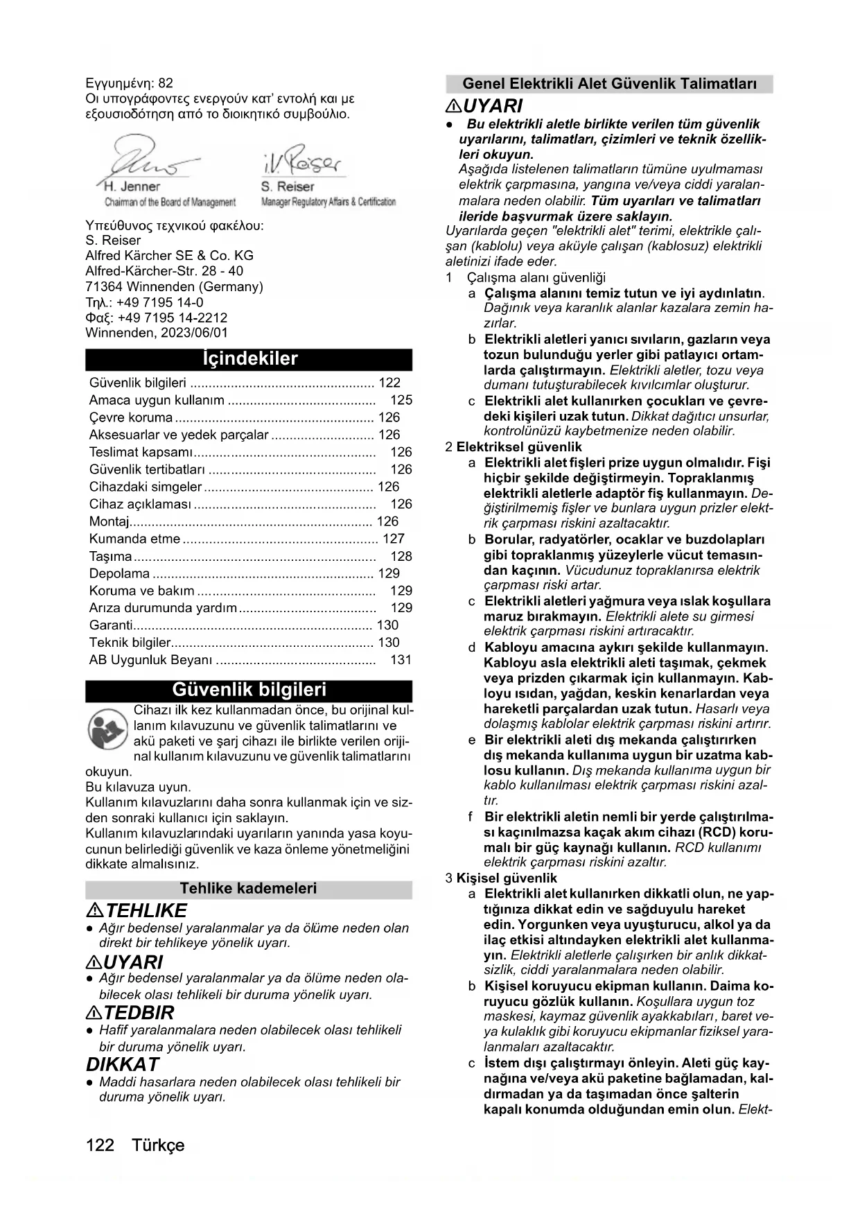 • dB(A) 82 Διαστάσεις και βάρη Βάρος με ψαλίδι γκαζόν kg 0,58 Βάρος με ψαλίδι μπορντούρας kg 0,63 Μήκος x πλάτος x ύψος (με ψαλίδι γκαζόν, χωρίς μπαταρία, χωρίς προστατευτικό λεπίδας) mm 306 x 83 x 132 Μήκος x πλάτος x ύψος (με ψαλίδι μπορντούρας, χωρίς μπαταρία, χωρίς προστατευτικό λεπίδας) mm 392 x 81 x 132122 Türkçe Εγγυημένη: 82 Οι υπογράφοντες ενεργούν κατ’ εντολή και με εξουσιοδότηση από το διοικητικό συμβούλιο. Υπεύθυνος τεχνικού φακέλου: S. Reiser Alfred Kärcher SE & Co. KG Alfred-Kärcher-Str. 28 - 40 71364 Winnenden (Germany) Τηλ.: +49 7195 14-0 Φαξ: +49 7195 14-2212 Winnenden, 2023/06/01 İçindekiler Güvenlik bilgileri Cihazı ilk kez kullanmadan önce, bu orijinal kul- lanım kılavuzunu ve güvenlik talimatlarını ve akü paketi ve şarj cihazı ile birlikte verilen oriji- nal kullanım kılavuzunu ve güvenlik talimatlarını okuyun. Bu kılavuza uyun. Kullanım kılavuzlarını daha sonra kullanmak için ve siz- den sonraki kullanıcı için saklayın. Kullanım kılavuzlarındaki uyarıların yanında yasa koyu- cunun belirlediği güvenlik ve kaza önleme yönetmeliğini dikkate almalısınız. Tehlike kademeleri TEHLIKE ● Ağır bedensel yaralanmalar ya da ölüme neden olan direkt bir tehlikeye yönelik uyarı. 몇 UYARI ● Ağır bedensel yaralanmalar ya da ölüme neden ola- bilecek olası tehlikeli bir duruma yönelik uyarı. 몇 TEDBIR ● Hafif yaralanmalara neden olabilecek olası tehlikeli bir duruma yönelik uyarı. DIKKAT ● Maddi hasarlara neden olabilecek olası tehlikeli bir duruma yönelik uyarı. Genel Elektrikli Alet Güvenlik Talimatları 몇 UYARI ● Bu elektrikli aletle birlikte verilen tüm güvenlik uyarılarını, talimatları, çizimleri ve teknik özellik- leri okuyun. Aşağıda listelenen talimatların tümüne uyulmaması elektrik çarpmasına, yangına ve/veya ciddi yaralan- malara neden olabilir. Tüm uyarıları ve talimatları ileride başvurmak üzere saklayın. Uyarılarda geçen "elektrikli alet" terimi, elektrikle çalı- şan (kablolu) veya aküyle çalışan (kablosuz) elektrikli aletinizi ifade eder. 1Çalışma alanı güvenliği a Çalışma alanını temiz tutun ve iyi aydınlatın. Dağınık veya karanlık alanlar kazalara zemin ha- zırlar. b Elektrikli aletleri yanıcı sıvıların, gazların veya tozun bulunduğu yerler gibi patlay ıcı ortam- larda çalıştırmayın. Elektrikli aletler, tozu veya dumanı tutuşturabilecek kıvılcımlar oluşturur. c Elektrikli alet kullanırken çocukları ve çevre- deki kişileri uzak tutun. Dikkat dağıtıcı unsurlar, kontrolünüzü kaybetmenize neden olabilir. 2 Elektriksel güvenlik a Elektrikli alet fişleri prize uygun olmalıdır. Fişi hiçbir şekilde değiştirmeyin. Topraklanmış elektrikli aletlerle adaptör fiş kullanmayın. De- ğiştirilmemiş fişler ve bunlara uygun prizler elekt- rik çarpması riskini azaltacaktır. b Borular, radyatörler, ocaklar ve buzdolapları gibi topraklanmış yüzeylerle vücut temasın- dan kaçın ın. Vücudunuz topraklanırsa elektrik çarpması riski artar. c Elektrikli aletleri yağmura veya ıslak koşullara maruz bırakmayın. Elektrikli alete su girmesi elektrik çarpması riskini artıracaktır. d Kabloyu amacına aykırı şekilde kullanmayın. Kabloyu asla elektrikli aleti taşımak, çekmek veya prizden çıkarmak için kullanmayın. Kab- loyu ısıdan, yağdan, keskin kenarlardan veya hareketli parçalardan uzak tutun. Hasarlı veya dolaşmış kablolar elektrik çarpması riskini artırır. e Bir elektrikli aleti dış mekanda çalıştırırken dış mekanda kullanıma uygun bir uzatma kab- losu kullanın. Dış mekanda kullan ıma uygun bir kablo kullanılması elektrik çarpması riskini azal- tır. f Bir elektrikli aletin nemli bir yerde çalıştırılma- sı kaçınılmazsa kaçak akım cihazı (RCD) koru- malı bir güç kaynağı kullanın. RCD kullanımı elektrik çarpması riskini azaltır. 3 Kişisel güvenlik a Elektrikli alet kullanırken dikkatli olun, ne yap- tığınıza dikkat edin ve sağduyulu hareket edin. Yorgunken veya uyuşturucu, alkol ya da ilaç etkisi altındayken elektrikli alet kullanma- yın. Elektrikli aletlerle çalışırken bir anlık dikkat- sizlik, ciddi yaralanmalara neden olabilir. b Kişisel koruyucu ekipman kullanın. Daima ko- ruyucu gözlük kullanın. Koşullara uygun toz maskesi, kaymaz güvenlik ayakkabıları , baret ve- ya kulaklık gibi koruyucu ekipmanlar fiziksel yara- lanmaları azaltacaktır. c İstem dışı çalıştırmayı önleyin. Aleti güç kay- nağına ve/veya akü paketine bağlamadan, kal- dırmadan ya da taşımadan önce şalterin kapalı konumda olduğundan emin olun. Elekt- Güvenlik bilgileri p. 122