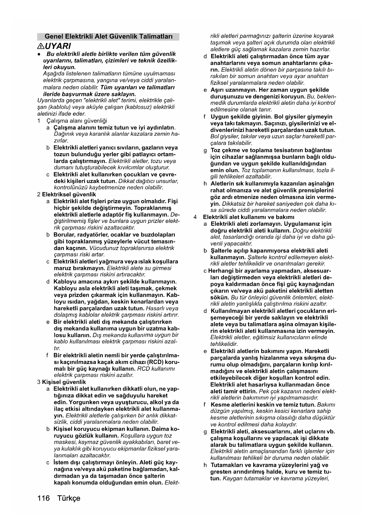 - AB Uygunluk Beyanı 16 Türkçe Genel Elektrikli Alet Güvenlik Talimatları 몇 UYARI ● Bu elektrikli aletle birlikte verilen tüm güvenlik uyarılarını, talimatları, çizimleri ve teknik özellik- leri okuyun. Aşağıda listelenen talimatların tümüne uyulmaması elektrik çarpmasına, yangına ve/veya ciddi yaralan- malara neden olabilir. Tüm uyarıları ve talimatları ileride başvurmak üzere saklayın. Uyarılarda geçen "elektrikli alet" terimi, elektrikle çalı- şan (kablolu) veya aküyle çalışan (kablosuz) elektrikli aletinizi ifade eder. 1Çalışma alanı güvenliği a Çalışma alanını temiz tutun ve iyi aydınlatın. Dağınık veya karanlık alanlar kazalara zemin ha- zırlar. b Elektrikli aletleri yanıcı sıvıların, gazların veya tozun bulunduğu yerler gibi patlay ıcı ortam- larda çalıştırmayın. Elektrikli aletler, tozu veya dumanı tutuşturabilecek kıvılcımlar oluşturur. c Elektrikli alet kullanırken çocukları ve çevre- deki kişileri uzak tutun. Dikkat dağıtıcı unsurlar, kontrolünüzü kaybetmenize neden olabilir. 2 Elektriksel güvenlik a Elektrikli alet fişleri prize uygun olmalıdır. Fişi hiçbir şekilde değiştirmeyin. Topraklanmış elektrikli aletlerle adaptör fiş kullanmayın. De- ğiştirilmemiş fişler ve bunlara uygun prizler elekt- rik çarpması riskini azaltacaktır. b Borular, radyatörler, ocaklar ve buzdolapları gibi topraklanmış yüzeylerle vücut temasın- dan kaçın ın. Vücudunuz topraklanırsa elektrik çarpması riski artar. c Elektrikli aletleri yağmura veya ıslak koşullara maruz bırakmayın. Elektrikli alete su girmesi elektrik çarpması riskini artıracaktır. d Kabloyu amacına aykırı şekilde kullanmayın. Kabloyu asla elektrikli aleti taşımak, çekmek veya prizden çıkarmak için kullanmayın. Kab- loyu ısıdan, yağdan, keskin kenarlardan veya hareketli parçalardan uzak tutun. Hasarlı veya dolaşmış kablolar elektrik çarpması riskini artırır. e Bir elektrikli aleti dış mekanda çalıştırırken dış mekanda kullanıma uygun bir uzatma kab- losu kullanın. Dış mekanda kullan ıma uygun bir kablo kullanılması elektrik çarpması riskini azal- tır. f Bir elektrikli aletin nemli bir yerde çalıştırılma- sı kaçınılmazsa kaçak akım cihazı (RCD) koru- malı bir güç kaynağı kullanın. RCD kullanımı elektrik çarpması riskini azaltır. 3 Kişisel güvenlik a Elektrikli alet kullanırken dikkatli olun, ne yap- tığınıza dikkat edin ve sağduyulu hareket edin. Yorgunken veya uyuşturucu, alkol ya da ilaç etkisi altındayken elektrikli alet kullanma- yın. Elektrikli aletlerle çalışırken bir anlık dikkat- sizlik, ciddi yaralanmalara neden olabilir. b Kişisel koruyucu ekipman kullanın. Daima ko- ruyucu gözlük kullanın. Koşullara uygun toz maskesi, kaymaz güvenlik ayakkabıları, baret ve- ya kulaklık gibi koruyucu ekipmanlar fiziksel yara- lanmaları azaltacaktır. c İstem dışı çalıştırmayı önleyin. Aleti güç kay- nağına ve/veya akü paketine bağlamadan, kal- dırmadan ya da taşımadan önce şalterin kapalı konumda olduğundan emin olun. Elekt- rikli aletleri parmağınızı şalterin üzerine koyarak taşımak veya şalteri açık durumda olan elektrikli aletlere güç sağlamak kazalara zemin hazırlar. d Elektrikli aleti çalıştırmadan önce tüm ayar anahtarlarını veya somun anahtarlarını çıka- rın. Elektrikli aletin dönen bir parçasına takılı bı- rakılan bir somun anahtarı veya ayar anahtarı fiziksel yaralanmalara neden olabilir. e Aşırı uzanmayın. Her zaman uygun şekilde duruşunuzu ve dengenizi koruyun. Bu, beklen- medik durumlarda elektrikli aletin daha iyi kontrol edilmesine olanak tanır. f Uygun şekilde giyinin. Bol giysiler giymeyin veya takı takmayın. Saçınızı, giysilerinizi ve el- divenlerinizi hareketli parçalardan uzak tutun. Bol giysiler, takılar veya uzun saçlar hareketli par- çalara takılabilir. g Toz çekme ve toplama tesisatının bağlantısı için cihazlar sağlanmışsa bunların bağlı oldu- ğundan ve uygun şekilde kullanıldığından emin olun. Toz toplamanın kullanılması, tozla il- gili tehlikeleri azaltabilir. h Aletlerin sık kullanımıyla kazanılan aşinalığ p. 1241