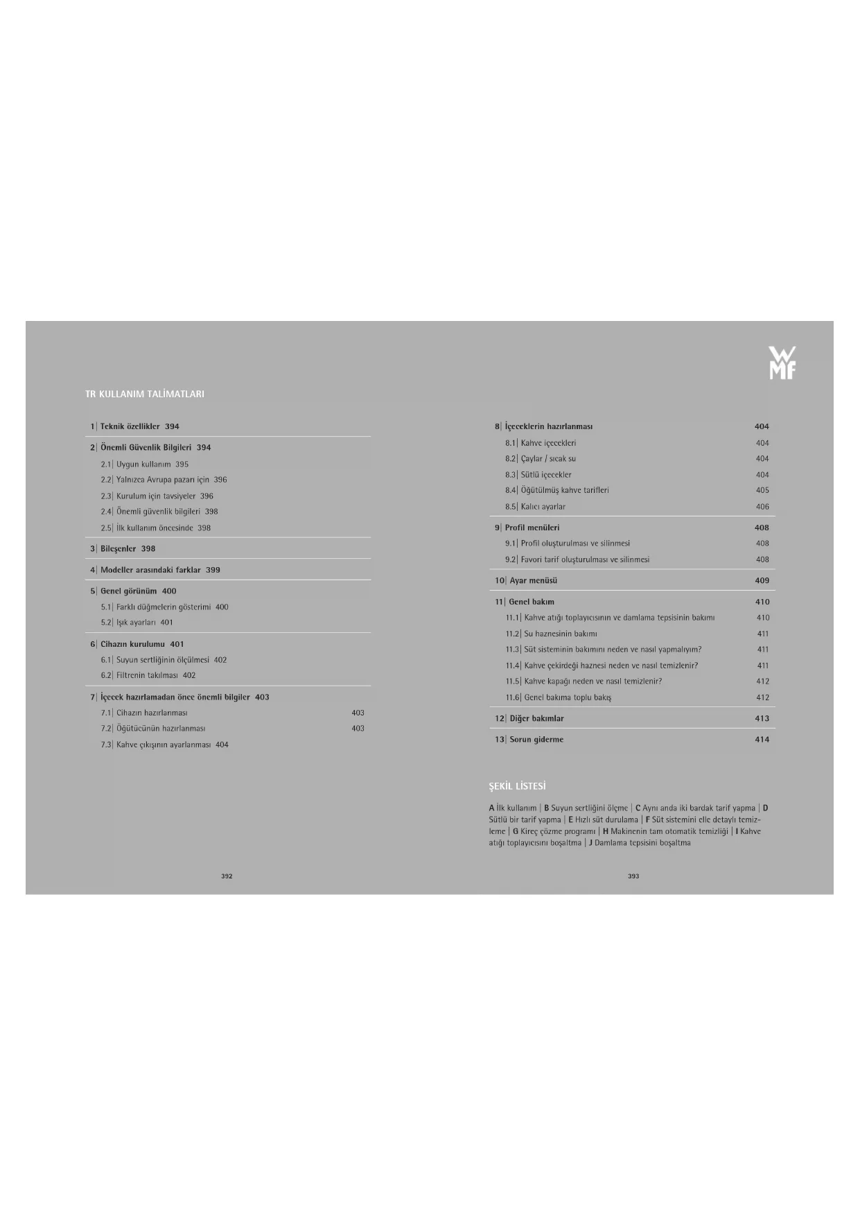 TR SV RU RO PT PL NO NL FI DA CS IT ES FR EN DETR KULLANIM TALİMATLARI 1|Teknik özellikler 394 2|Önemli Güvenlik Bilgileri 394 2.1|Uygun kullanım 395 2.2|Yalnızca Avrupa pazarı için 396 2.3|Kurulum için tavsiyeler 396 2.4|Önemli güvenlik bilgileri 398 2.5|İlk kullanım öncesinde 398 3|Bileşenler 398 4|Modeller arasındaki farklar 399 5|Genel görünüm 400 5.1|Farklı düğmelerin gösterimi 400 5.2|Işık ayarları 401 6|Cihazın kurulumu 401 6.1|Suyun sertliğinin ölçülmesi 402 6.2|Filtrenin takılması 402 7|İçecek hazırlamadan önce önemli bilgiler 403 7.1|Cihazın hazırlanması 403 7.2|Öğütücünün hazırlanması 403 7.3|Kahve çıkışının ayarlanması 404 8|İçeceklerin hazırlanması 404 8.1|Kahve içecekleri 404 8.2|Çaylar / sıcak su 404 8.3|Sütlü içecekler 404 8.4|Öğütülmüş kahve tarifleri 405 8.5|Kalıcı ayarlar 406 9|Profil menüleri 408 9.1|Profil oluşturulması ve silinmesi 408 9.2|Favori tarif oluşturulması ve silinmesi 408 10|Ayar menüsü 409 11|Genel bakım 410 11.1|Kahve atığı toplayıcısının ve damlama tepsisinin bakımı 410 11.2|Su haznesinin bakımı 411 11.3|Süt sisteminin bakımını neden ve nasıl yapmalıyım? 411 11.4|Kahve çekirdeği haznesi neden ve nasıl temizlenir? 411 11.5|Kahve kapağı neden ve nasıl temizlenir? 412 11.6|Genel bakıma toplu bakış 412 12|Diğer bakımlar 413 13|Sorun giderme 414