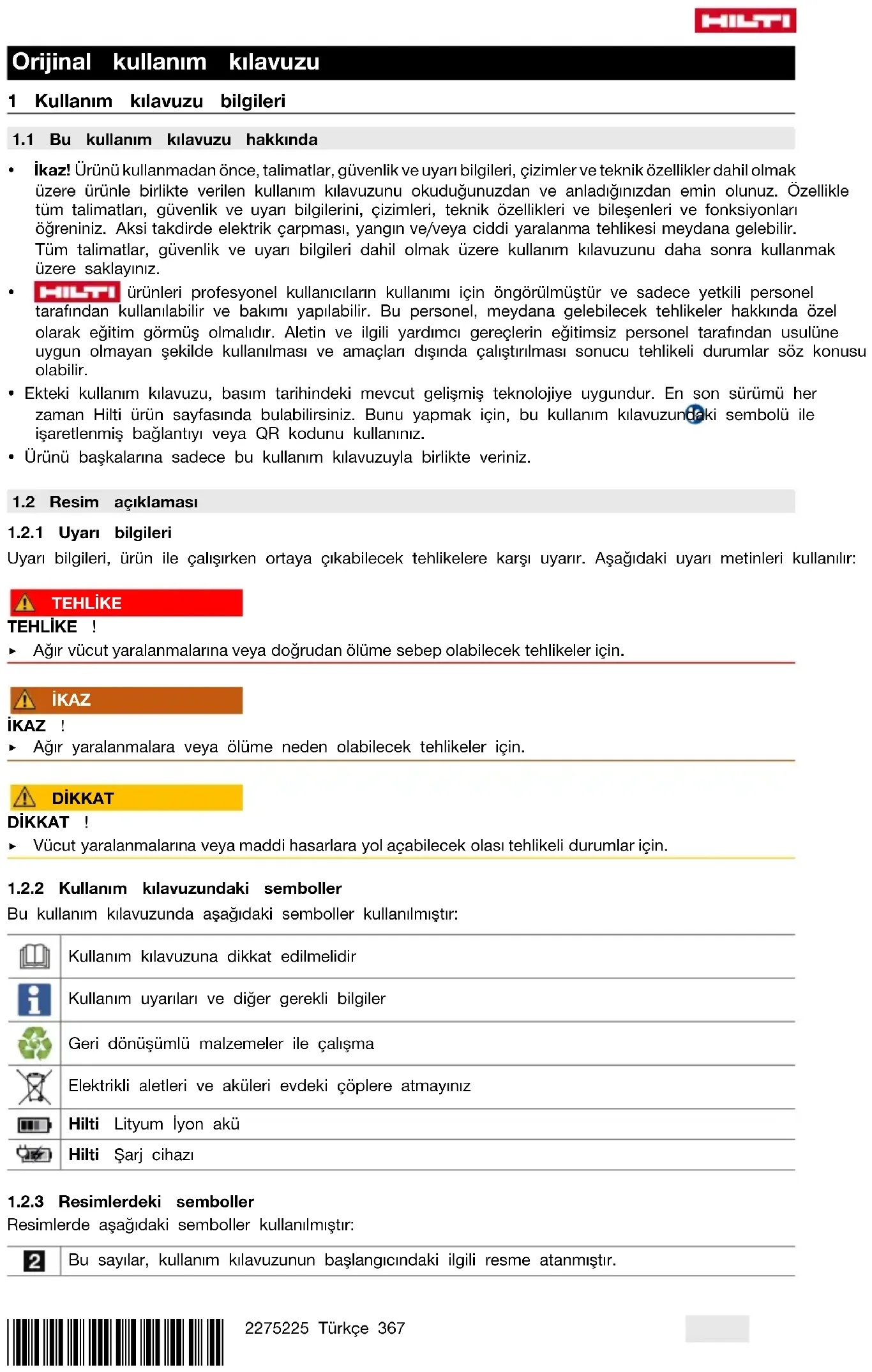 Bu kullanım kılavuzunda aşağıdaki semboller kullanılmıştır: Kullanım kılavuzuna dikkat edilmelidir Kullanım uyarıları ve diğer gerekli bilgiler Geri dönüşümlü malzemeler ile çalışma Elektrikli aletleri ve aküleri evdeki çöplere atmayınız Hilti Lityum İyon akü Hilti Şarj cihazı