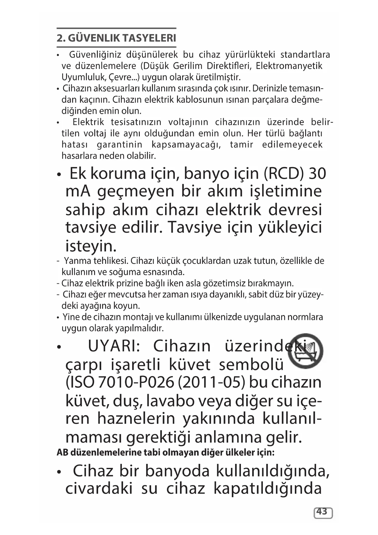 - UYARI: Cihazın üzerindeki çarpı işaretli küvet sembolü (ISO 7010-P026 (2011-05) bu cihazın küvet, duş, lavabo veya diğer su içe- ren haznelerin yakınında kullanıl- maması gerektiği anlamına gelir. AB düzenlemelerine tabi olmayan diğer ülkeler için: