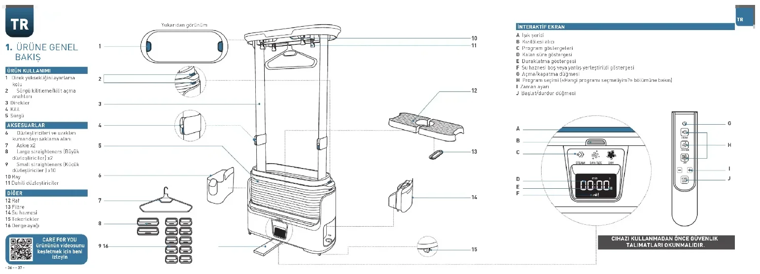1 Direk yüksekliğini ayarlama kolu 2 Sürgü kilitleme/kilit açma anahtarı 3 Direkler 4 Kilit 5 Sürgü AKSESUARLAR 6 Düzleştiricileri ve uzaktan kumandayı saklama alanı 7 Askıe x2 8 Large straighteners (Büyük düzleştiriciler) x2 9 Small straighteners (Küçük düzleştiriciler ) x10 10 Ray 11 Dahili düzleştiriciler DİĞER 12 Raf 13 Filtre 14 Su haznesi 15 Tekerlekler 16 Denge ayağı Yukarıdan görünüm