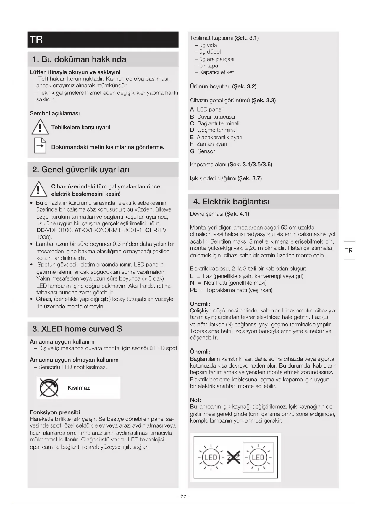 Tehlikelere karşı uyarı! Dokümandaki metin kısımlarına gönderme 2 Genel güvenlik uyarıları Cihaz üzerindeki tüm çalışmalardan önce, elektrik beslemesini kesin! • Bu cihazların kurulumu sırasında, elektrik şebekesinin üzerinde bir çalışma söz konusudur; bu yüzden, ülkeye özgü kurulum talimatları ve bağlantı koşulları uyarınca, usulüne uygun bir çalışma gerçekleştirilmelidir (örn. DE-VDE 0100, AT-ÖVE/ÖNORM E 8001-1, CH-SEV 1000).• Lamba, uzun bir süre boyunca 0,3m'den daha yakın bir mesafeden içine bakma olasılığının olmayacağı şekilde konumlandırılmalıdır.• Spotun gövdesi, işletim sırasında ısınır. LED panelini çevirme işlemi, ancak soğuduktan sonra yapılmalıdır. Yakın mesafeden veya uzun süre boyunca (> 5dak) LED lambanın içine doğru bakmayın. Aksi halde, retina tabakası bundan zarar görebilir.• Cihazı, (genellikle yapıldığı gibi) kolay tutuşabilen yüzeyle-rin üzerinde monte etmeyin. 3 XLED home curved S Amacına uygun kullanım – Dış ve iç mekanda duvara montaj için sensörlü LED spotAmacına uygun olmayan kullanım – Sensörlü LED spot kısılmaz.KısılmazFonksiyon prensibiHareketle birlikte ışık çalışır. Serbestçe dönebilen panel sa-yesinde spot, özel sektörde ev veya arazi aydınlatması veya ticari alanlarda örn. firma arazisinin aydınlatılması amacıyla mükemmel kullanılır. Olağanüstü verimli LED teknolojisi, opal cam ile bağlantılı olarak yüzeysel ışık sağlar.