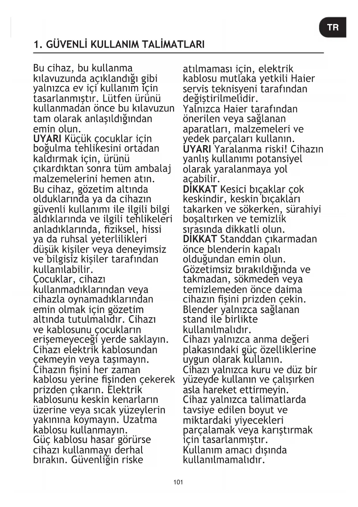 - Netrápte sa, ak tekutina prenikne do vnútra hlavného tela, vnútri sa nachádza odtekací zásobník. SK101 Bu cihaz, bu kullanma kılavuzunda açıklandığı gibi yalnızca ev içi kullanım için tasarlanmıştır. Lütfen ürünü kullanmadan önce bu kılavuzun tam olarak anlaşıldığından emin olun. UYARI Küçük çocuklar için boğulma tehlikesini ortadan kaldırmak için, ürünü çıkardıktan sonra tüm ambalaj malzemelerini hemen atın. Bu cihaz, gözetim altında olduklarında ya da cihazın güvenli kullanımı ile ilgili bilgi aldıklarında ve ilgili tehlikeleri anladıklarında, ziksel, hissi ya da ruhsal yeterlilikleri düşük kişiler veya deneyimsiz ve bilgisiz kişiler tarafından kullanılabilir. Çocuklar, cihazı kullanmadıklarından veya cihazla oynamadıklarından emin olmak için gözetim altında tutulmalıdır. Cihazı ve kablosunu çocukların erişemeyeceği yerde saklayın. Cihazı elektrik kablosundan çekmeyin veya taşımayın. Cihazın şini her zaman kablosu yerine şinden çekerek prizden çıkarın. Elektrik kablosunu keskin kenarların üzerine veya sıcak yüzeylerin yakınına koymayın. Uzatma kablosu kullanmayın. Güç kablosu hasar görürse cihazı kullanmayı derhal bırakın. Güvenliğin riske atılmaması için, elektrik kablosu mutlaka yetkili Haier servis teknisyeni tarafından değiştirilmelidir. Yalnızca Haier tarafından önerilen veya sağlanan aparatları, malzemeleri ve yedek parçaları kullanın. UYARI Yaralanma riski! Cihazın yanlış kullanımı potansiyel olarak yaralanmaya yol açabilir. DİKKAT Kesici bıçaklar çok keskindir, keskin bıçakları takarken ve sökerken, sürahiyi boşaltırken ve temizlik sırasında dikkatli olun. DİKKAT Standdan çıkarmadan önce blenderin kapalı olduğundan emin olun. Gözetimsiz bırakıldığında ve takmadan, sökmeden veya temizlemeden önce daima cihazın şini prizden çekin. Blender yalnızca sağlanan stand ile birlikte kullanılmalıdır. Cihazı yalnızca anma değeri plakasındaki güç özelliklerine uygun olarak kullanın. Cihazı yalnızca kuru ve düz bir yüzeyde kullanın ve çalışırken asla hareket ettirmeyin. Cihaz yalnızca talimatlarda tavsiye edilen boyut ve miktardaki yiyecekleri parçalamak veya karıştırmak için tasarlanmıştır. Kullanım amacı dışında kullanılmamalıdır.