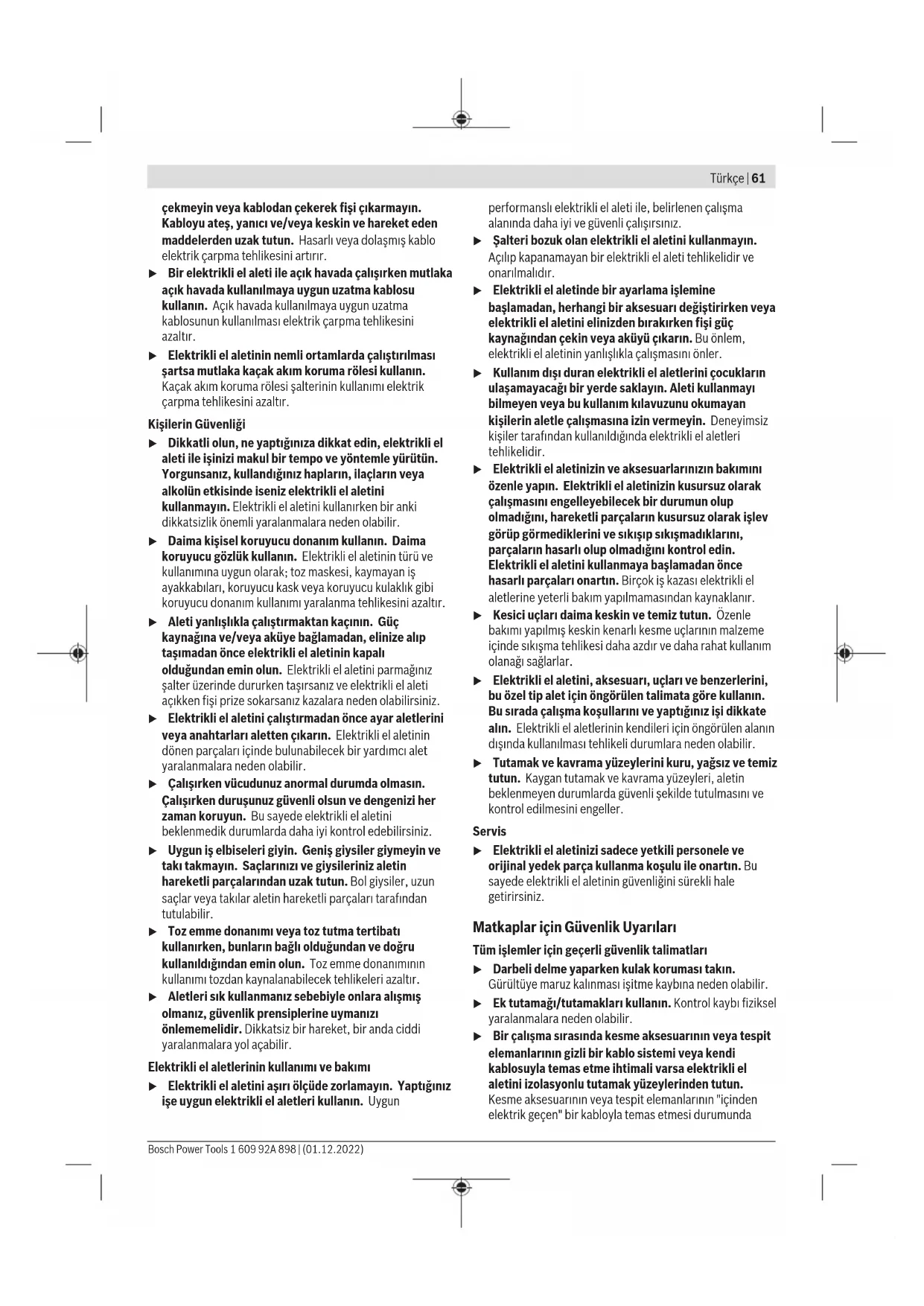 Μην ρίχνετε τα ηλεκτρικά εργαλεία στα απορρίμ- ματα του σπιτιού σας! Μόνο για χώρες τηςΕΕ: Σύμφωνα με την Ευρωπαϊκή Οδηγία 2012/19/ΕΕ σχετικά με τις παλιές ηλεκτρικές και ηλεκτρονικές συσκευές και τη μετα- φορά της οδηγίας αυτής σε εθνικό δίκαιο τα άχρηστα ηλεκτρι- κά εργαλεία πρέπει να συλλέγονται ξεχωριστά για να επανα- χρησιμοποιηθούν με τρόπο φιλικό προς το περιβάλλον. Σε περίπτωση μη ενδεδειγμένης απόσυρσης οι ηλεκτρικές και ηλεκτρονικές συσκευές λόγω ενδεχομένης παρουσίας επικίν- δυνων ουσιών μπορούν να έχουν επιβλαβείς επιπτώσεις στο περιβάλλον και στην ανθρώπινη υγεία. Türkçe Güvenlik talimatı Elektrikli el aletleri için genel güvenlik uyarıları UYARI Bu elektrikli el aletiyle birlikte gelen tüm güvenlik uyarılarını, talimatları, resim ve açıklamaları okuyun. Aşağıda bulunan talimatlara uyulmaması halinde elektrik çarpmalarına, yangınlara ve/veya ağır yaralanmalara neden olabilir. Bütün uyarıları ve talimat hükümlerini ileride kullanmak üzere saklayın. Uyarı ve talimat hükümlerinde kullanılan "elektrikli el aleti" terimi, akım şebekesine bağlı (elektrikli) aletlerle akü ile çalışan aletleri (akülü) kapsamaktadır. Çalışma yeri güvenliği u Çalıştığınız yeri temiz tutun ve iyi aydınlatın. Dağınık veya karanlık alanlar kazalara davetiye çıkarır. u Yakınında patlayıcı maddeler, yanıcı sıvı, gaz veya tozların bulunduğu yerlerde elektrikli el aleti ile çalışmayın. Elektrikli el aletleri, toz veya buharların tutuşmasına neden olabilecek kıvılcımlar çıkarırlar. u Elektrikli el aleti ile çalışırken çocukları ve etraftaki kişileri uzakta tutun. Dikkatiniz dağılacak olursa aletin kontrolünü kaybedebilirsiniz. Elektrik güvenliği u Elektrikli el aletinin fişi prize uymalıdır. Fişi hiçbir zaman değiştirmeyin. Korumalı (topraklanmış) elektrikli el aletleri ile birlikte adaptör fiş kullanmayın. Değiştirilmemiş fiş ve uygun priz elektrik çarpma tehlikesini azaltır. u Borular, kalorifer petekleri, ısıtıcılar ve buzdolapları gibi topraklanmış yüzeylerle vücudunuzun temas etmesinden kaçının. Vücudunuz topraklandığı anda büyük bir elektrik çarpma tehlikesi ortaya çıkar. u Elektrikli el aletlerini yağmur altında veya nemli ortamlarda bırakmayın. Suyun elektrikli el aleti içine sızması elektrik çarpma tehlikesini artırır. u Kabloya zarar vermeyin. Elektrikli el aletini kablosundan tutarak taşımayın, kabloyu kullanarak 1 609 92A 898 | (01.12.2022) Bosch Power ToolsTürkçe | 61 çekmeyin veya kablodan çekerek fişi çıkarmayın. Kabloyu ateş, yanıcı ve/veya keskin ve hareket eden maddelerden uzak tutun. Hasarlı veya dolaşmış kablo elektrik çarpma tehlikesini artırır. u Bir elektrikli el aleti ile açık havada çalışırken mutlaka açık havada kullanılmaya uygun uzatma kablosu kullanın. Açık havada kullanılmaya uygun uzatma kablosunun kullanılması elektrik çarpma tehlikesini azaltır. u Elektrikli el aletinin nemli ortamlarda çalıştırılması şartsa mutlaka kaçak akım koruma rölesi kullanın. Kaçak akım koruma rölesi şalterinin kullanımı elektrik çarpma tehlikesini azaltır. Kişilerin Güvenliği u Dikkatli olun, ne yaptığınıza dikkat edin, elektrikli el aleti ile işinizi makul bir tempo ve yöntemle yürütün. Yorgunsanız, kullandığınız hapların, ilaçların veya alkolün etkisinde iseniz elektrikli el aletini kullanmayın. Elektrikli el aletini kullanırken bir anki dikkatsizlik önemli yaralanmalara neden olabilir. u Daima kişisel koruyucu donanım kullanın. Daima koruyucu gözlük kullanın. Elektrikli el aletinin türü ve kullanımına uygun olarak; toz maskesi, kaymayan iş ayakkabıları, koruyucu kask veya koruyucu kulaklık gibi koruyucu donanım kullanımı yaralanma tehlikesini azaltır. u Aleti yanlışlıkla çalıştırmaktan kaçının. Güç kaynağına ve/veya aküye bağlamadan, elinize alıp taşımadan önce elektrikli el aletinin kapalı olduğundan emin olun. Elektrikli el aletini parmağınız şalter üzerinde dururken taşırsanız ve elektrikli el aleti açıkken fişi prize sokarsanız kazalara neden olabilirsiniz. u Elektrikli el aletini çalıştırmadan önce ayar aletlerini veya anahtarları aletten çıkarın. Elektrikli el aletinin dönen parçaları içinde bulunabilecek bir yardımcı alet yaralanmalara neden olabilir. u Çalışırken vücudunuz anormal durumda olmasın. Çalışırken duruşunuz güvenli olsun ve dengenizi her zaman koruyun. Bu sayede elektrikli el aletini beklenmedik durumlarda daha iyi kontrol edebilirsiniz. u Uygun iş elbiseleri giyin. Geniş giysiler giymeyin ve takı takmayın. Saçlarınızı ve giysileriniz aletin hareketli parçalarından uzak tutun. Bol giysiler, uzun saçlar veya takılar aletin hareketli parçaları tarafından tutulabilir. u Toz emme donanımı veya toz tutma tertibatı kullanırken, bunların bağlı olduğundan ve doğru kullanıldığından emin olun. Toz emme donanımının kullanımı tozdan kaynalanabilecek tehlikeleri azaltır. u Aletleri sık kullanmanız sebebiyle onlara alışmış olmanız, güvenlik prensiplerine uymanızı önlememelidir. Dikkatsiz bir hareket, bir anda ciddi yaralanmalara yol açabilir. Elektrikli el aletlerinin kullanımı ve bakımı u Elektrikli el aletini aşırı ölçüde zorlamayın. Yaptığınız işe uygun elektrikli el aletleri kullanın. Uygun performanslı elektrikli el aleti ile, belirlenen çal