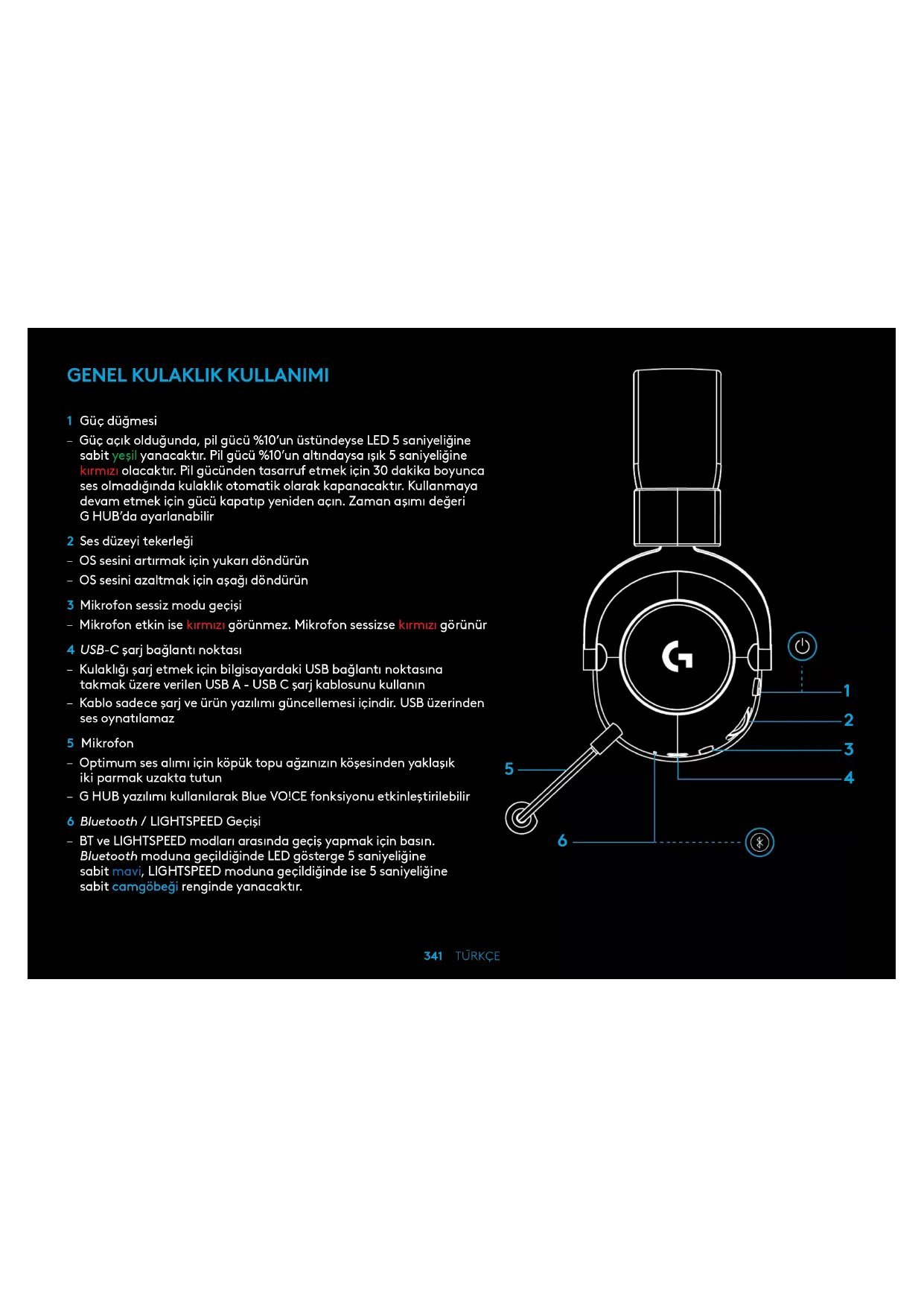 1 Güç düğmesi – Güç açık olduğunda, pil gücü %10’un üstündeyse LED 5 saniyeliğine sabit yeşil yanacaktır. Pil gücü %10’un altındaysa ışık 5 saniyeliğine kırmızı olacaktır. Pil gücünden tasarruf etmek için 30 dakika boyunca ses olmadığında kulaklık otomatik olarak kapanacaktır. Kullanmaya devam etmek için gücü kapatıp yeniden açın. Zaman aşımı değeri GHUB’da ayarlanabilir 2 Ses düzeyi tekerleği – OS sesini artırmak için yukarı döndürün – OS sesini azaltmak için aşağı döndürün 3 Mikrofon sessiz modu geçişi – Mikrofon etkin ise kırmızı görünmez. Mikrofon sessizse kırmızı görünür 4 USB-C şarj bağlantı noktası – Kulaklığı şarj etmek için bilgisayardaki USB bağlantı noktasına takmak üzere verilen USB A - USB C şarj kablosunu kullanın – Kablo sadece şarj ve ürün yazılımı güncellemesi içindir. USB üzerinden ses oynatılamaz 5 Mikrofon – Optimum ses alımı için köpük topu ağzınızın köşesinden yaklaşık ikiparmak uzakta tutun – G HUB yazılımı kullanılarak Blue VO!CE fonksiyonu etkinleştirilebilir 6 Bluetooth / LIGHTSPEED Geçişi – BT ve LIGHTSPEED modları arasında geçiş yapmak için basın. Bluetooth moduna geçildiğinde LED gösterge 5 saniyeliğine sabitmavi, LIGHTSPEED moduna geçildiğinde ise 5 saniyeliğine sabitcamgöbeği renginde yanacaktır.