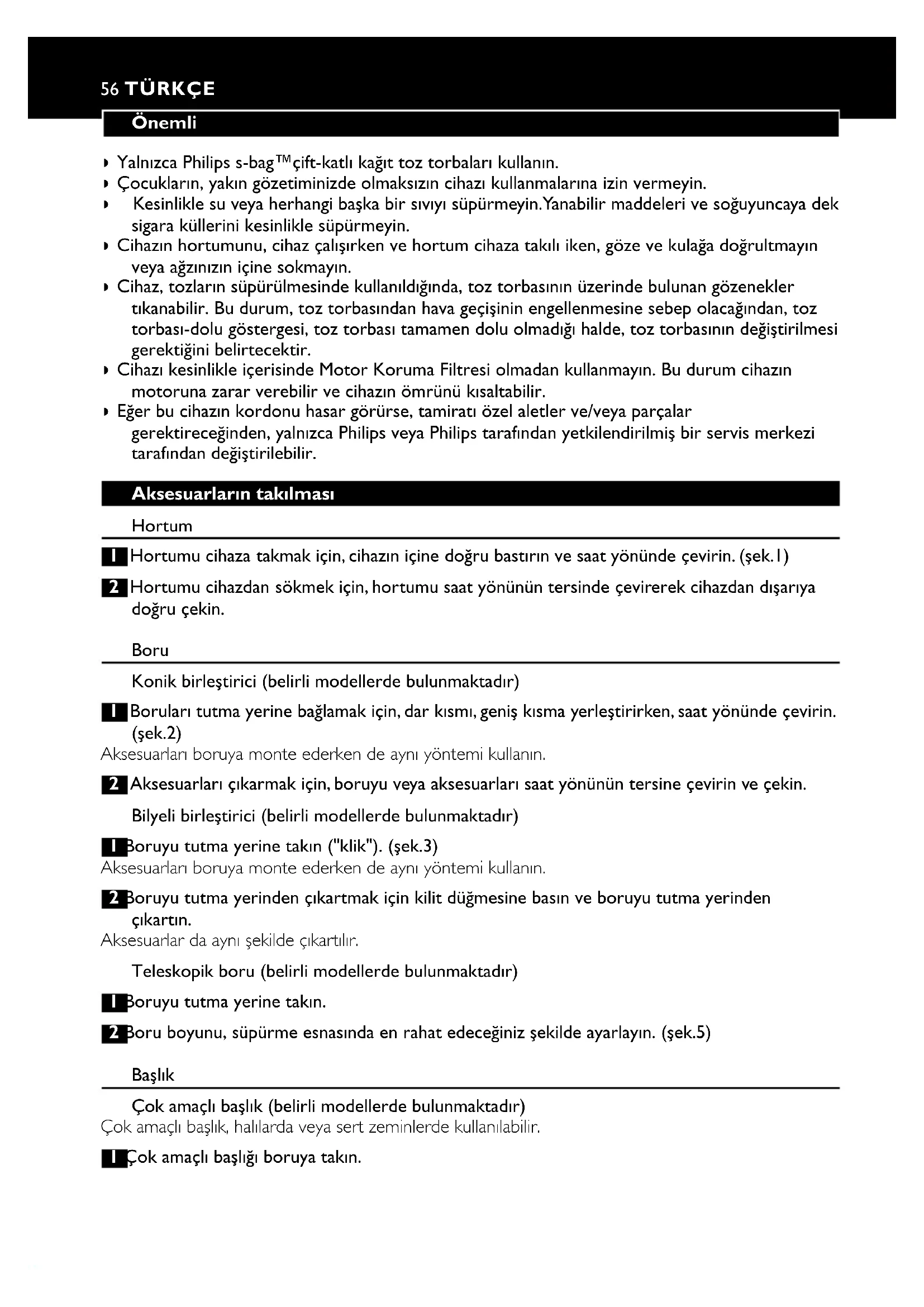 Philips.56 TÜRKÇE Önemli ◗ Yalnızca Philips s-bag™çift-katlı kağıt toz torbaları kullanın. ◗ Çocukların, yakın gözetiminizde olmaksızın cihazı kullanmalarına izin vermeyin. ◗ Kesinlikle su veya herhangi başka bir sıvıyı süpürmeyin.Yanabilir maddeleri ve soğuyuncaya dek sigara küllerini kesinlikle süpürmeyin. ◗ Cihazın hortumunu, cihaz çalışırken ve hortum cihaza takılı iken, göze ve kulağa doğrultmayın veya ağzınızın içine sokmayın. ◗ Cihaz, tozların süpürülmesinde kullanıldığında, toz torbasının üzerinde bulunan gözenekler tıkanabilir. Bu durum, toz torbasından hava geçişinin engellenmesine sebep olacağından, toz torbası-dolu göstergesi, toz torbası tamamen dolu olmadığı halde, toz torbasının değiştirilmesi gerektiğini belirtecektir. ◗ Cihazı kesinlikle içerisinde Motor Koruma Filtresi olmadan kullanmayın. Bu durum cihazın motoruna zarar verebilir ve cihazın ömrünü kısaltabilir. ◗ Eğer bu cihazın kordonu hasar görürse, tamiratı özel aletler ve/veya parçalar gerektireceğinden, yalnızca Philips veya Philips tarafından yetkilendirilmiş bir servis merkezi tarafından değiştirilebilir. Aksesuarların takılması Hortum 1 Hortumu cihaza takmak için, cihazın içine doğru bastırın ve saat yönünde çevirin. (şek.1) 2 Hortumu cihazdan sökmek için, hortumu saat yönünün tersinde çevirerek cihazdan dışarıya doğru çekin. Boru Konik birleştirici (belirli modellerde bulunmaktadır) 1 Boruları tutma yerine bağlamak için, dar kısmı, geniş kısma yerleştirirken, saat yönünde çevirin. (şek.2) Aksesuarları boruya monte ederken de aynı yöntemi kullanın. 2 Aksesuarları çıkarmak için, boruyu veya aksesuarları saat yönünün tersine çevirin ve çekin. Bilyeli birleştirici (belirli modellerde bulunmaktadır) 1 Boruyu tutma yerine takın ("klik"). (şek.3) Aksesuarları boruya monte ederken de aynı yöntemi kullanın. 2 Boruyu tutma yerinden çıkartmak için kilit düğmesine basın ve boruyu tutma yerinden çıkartın. Aksesuarlar da aynı şekilde çıkartılır. Teleskopik boru (belirli modellerde bulunmaktadır) 1 Boruyu tutma yerine takın. 2 Boru boyunu, süpürme esnasında en rahat edeceğiniz şekilde ayarlayın. (şek.5) Başlık Çok amaçlı başlık (belirli modellerde bulunmaktadır) Çok amaçlı başlık, halılarda veya sert zeminlerde kullanılabilir. 1 Çok amaçlı başlığı boruya takın.57TÜRKÇE 2 Çok amaçlı başlığın üzerindeki pedala ayağınızla basarak, sert zeminleri temizlemekte kullanılan fırça şeridini, başlık yuvasının içinden çıkartın. (şek.6) 3 Fırça şeridini, çok amaçlı başlık yuvasının içine geri sokmak için pedala tekrar basın. (şek.7) 360 Derece dönebilen temizleme başlığı (belirli modellerde bulunmaktadır) ◗ 360 derece dönebilen temizleme başlığı halılar veya sert zeminlerde kullanılabilir. Başlık, erişilmesi güç yerleri kolayca süpürebilmeniz için 4 farklı konuma, 360 derece döndürülebilir.Başlık yatay konumdayken, emiş gücü başlığın ön kısmında yoğunlaşır. (şek.8) ◗ Başlığı temizlenecek yüzey ve alan tipine göre ayarlamak için, ayağınızı belirtilen noktaya koyun ve başlık istediğiniz konuma gelene kadar, boruyu döndürün. (şek.9) 1 Başlık dikey konumdayken, ve fırça şeridi dışarıdayken, geniş sert zeminleri temizleyebilirsiniz. Fırça şeridi başlık yuvasından çıkıp, başlık dikey konumda olana kadar boruyu döndürün. (şek.10) 2 Başlık yatay konumdayken ve fırça şeridi dışarıdayken, küçük sert yüzeyleri süpürebilirsiniz. Boruyu, yatay konuma gelip fırça şeridi halen başlık yuvası dışında kalacak hale getirmek için, 90 derece saat yönünün tersine çevirin. (şek.11) 3 Başlık dikey konumdayken ve fırça şeridi içerideyken, geniş ve yumuşak yüzeyleri süpürebilirsiniz. Başlığı tekrar dikey konuma getirmek ve fırça şeridini yoketmek için, boruyu saat yönünün tersine çevirin. (şek.12) 4 Başlık yatay konumdayken ve fırça şeridi içerideyken, küçük ve yumuşak yüzeyleri süpürebilirsiniz. Boruyu, yatay konuma gelip fırça şeridi halen başlık yuvası içinde kalacak hale getirmek için, 90 derece saat yönünün tersine çevirin. (şek.13) Yarık parça, küçük başlık ve küçük fırça (belirli modellerde bulunmaktadır) 1 Yarık parça, küçük başlık veya küçük fırçayı doğrudan tutamağa veya boruya bağlayın. Yarık parça, dar köşelerin veya ulaşılması zor alanların temizliğinde kullanılabilir. Küçük başlık, sandalye ve sofa yastıkları gibi küçük alanların süpürülmesinde kullanılabilir. Küçük fırça, bilgisayar, kitaplık v.s. temizliğinde kullanılabilir. Aksesuar kulpu (belirli modellerde bulunmakadır) ◗ Aksesuar kulpu, kolaylıkla borunun üzerine yerleştirilebilir. ◗ Yarık parça ve küçük başlık kolaylıkla kulp üzerine oturtulabilir. (şek.14) Süpürme 1 Kordonu cihazdan dışarı çekin ve fişi prize takın (şek.15) 2 Cihazın üst kısmında bulunan açma/kapama düğmesine ayağınız ile basarak cihazı çalıştırın. 3 Cihazı iki şekilde taşıyabilirsiniz: ◗ Cihazı ön kısmından tutarak dikey olarak taşıma (şek.16) ◗ Cihazı üstünde bulunan saptan tutarak yatay olarak taşıma Emiş gücünün ayarlanması Süpürme esnasında emiş gücünü ayarlayabilirsiniz. 1 Emiş gücünü, elektronik emiş gücü kontrolü vasıtasıyla ayarlayın (şek.17) 2 Maksimum emiş gücü için, düğmeyi MAX ayarına getirin. Maksimum emiş gücünü çok kirli halıların ve sert zeminlerin temizliği için kullanın.58 TÜRKÇE 3 Minimal emiş gücü için, düğmeyi MIN ayarına getirin. Minimum emiş gücünü, perdelerin, masa örtülerinin v.s. süpürülmesinde kullanın. Süpürgeyi saklama 1 Cihazı kapatın ve fişi prizden çekin. 2 Kordon geri sarma düğmesine