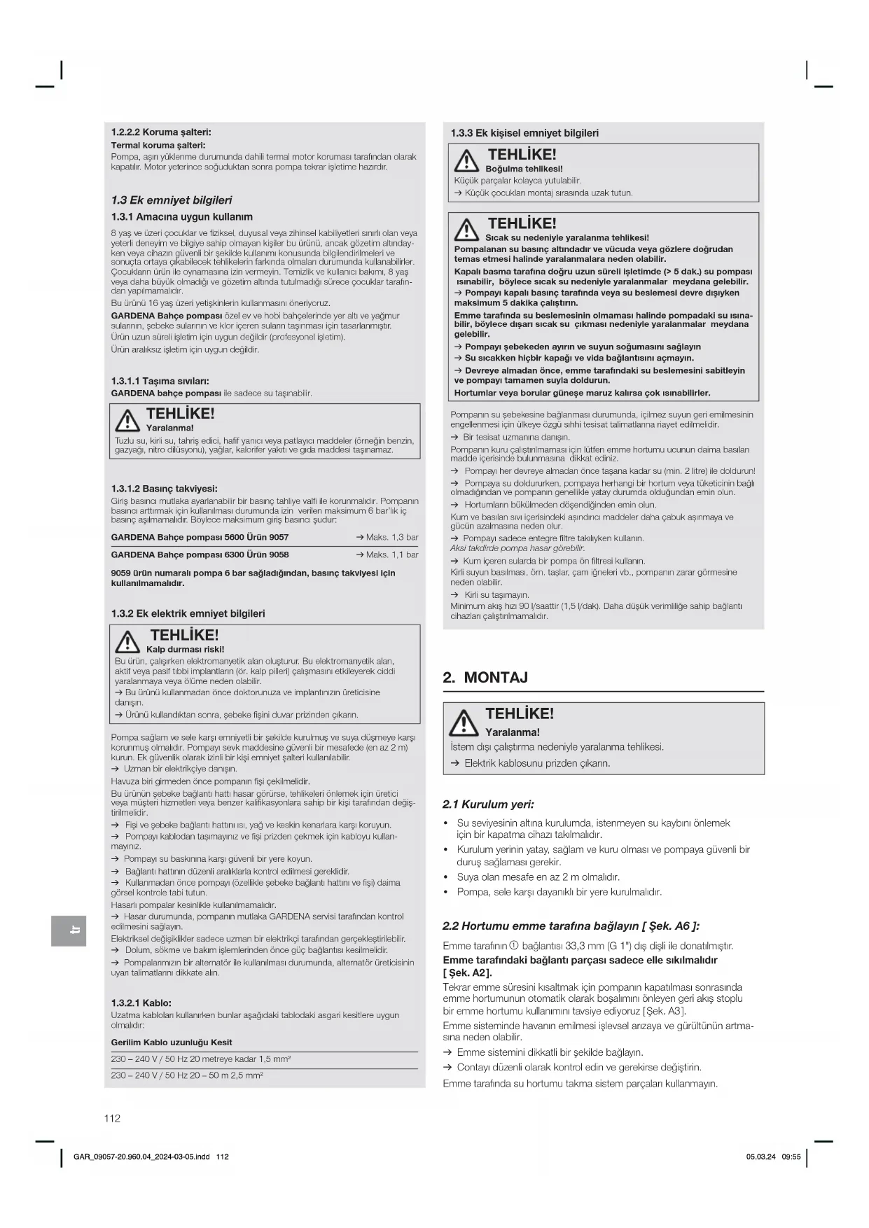 TEHLİKE! Kalp durması riski! Bu ürün, çalışırken elektromanyetik alan oluşturur. Bu elektromanyetik alan, aktif veya pasif tıbbi implantların (ör. kalp pilleri) çalışmasını etkileyerek ciddi yaralanmaya veya ölüme neden olabilir.v Bu ürünü kullanmadan önce doktorunuza ve implantınızın üreticisine danışın. v Ürünü kullandıktan sonra, şebeke fişini duvar prizinden çıkarın. Pompa sağlam ve sele karşı emniyetli bir şekilde kurulmuş ve suya düşmeye karşı korunmuş olmalıdır. Pompayı sevk maddesine güvenli bir mesafede (en az 2m) kurun. Ek güvenlik olarak izinli bir kişi emniyet şalteri kullanılabilir. v Uzman bir elektrikçiye danışın.Havuza biri girmeden önce pompanın fişi çekilmelidir. Bu ürünün şebeke bağlantı hattı hasar görürse, tehlikeleri önlemek için üretici veya müşteri hizmetleri veya benzer kalifikasyonlara sahip bir kişi tarafından değiş- tirilmelidir. v Fişi ve şebeke bağlantı hattını ısı, yağ ve keskin kenarlara karşı koruyun. v Pompayı kablodan tașımayınız ve fiși prizden çekmek için kabloyu kullan- mayınız.v Pompayı su baskınına karşı güvenli bir yere koyun. v Bağlantı hattının düzenli aralıklarla kontrol edilmesi gereklidir. v Kullanmadan önce pompayı (özellikle şebeke bağlantı hattını ve fişi) daima görsel kontrole tabi tutun.Hasarlı pompalar kesinlikle kullanılmamalıdır.v Hasar durumunda, pompanın mutlaka GARDENA servisi tarafından kontrol edilmesini sağlayın. Elektriksel değişiklikler sadece uzman bir elektrikçi tarafından gerçekleştirilebilir. v Dolum, sökme ve bakım işlemlerinden önce güç bağlantısı kesilmelidir. v Pompalarımızın bir alternatör ile kullanılması durumunda, alternatör üreticisinin uyarı talimatlarını dikkate alın.1.3.2.1 Kablo: Uzatma kabloları kullanırken bunlar aşağıdaki tablodaki asgari kesitlere uygun olmalıdır:Gerilim Kablo uzunluğu Kesit230 – 240 V / 50 Hz 20 metreye kadar 1,5 mm²230 – 240 V / 50 Hz 20 – 50 m 2,5 mm²