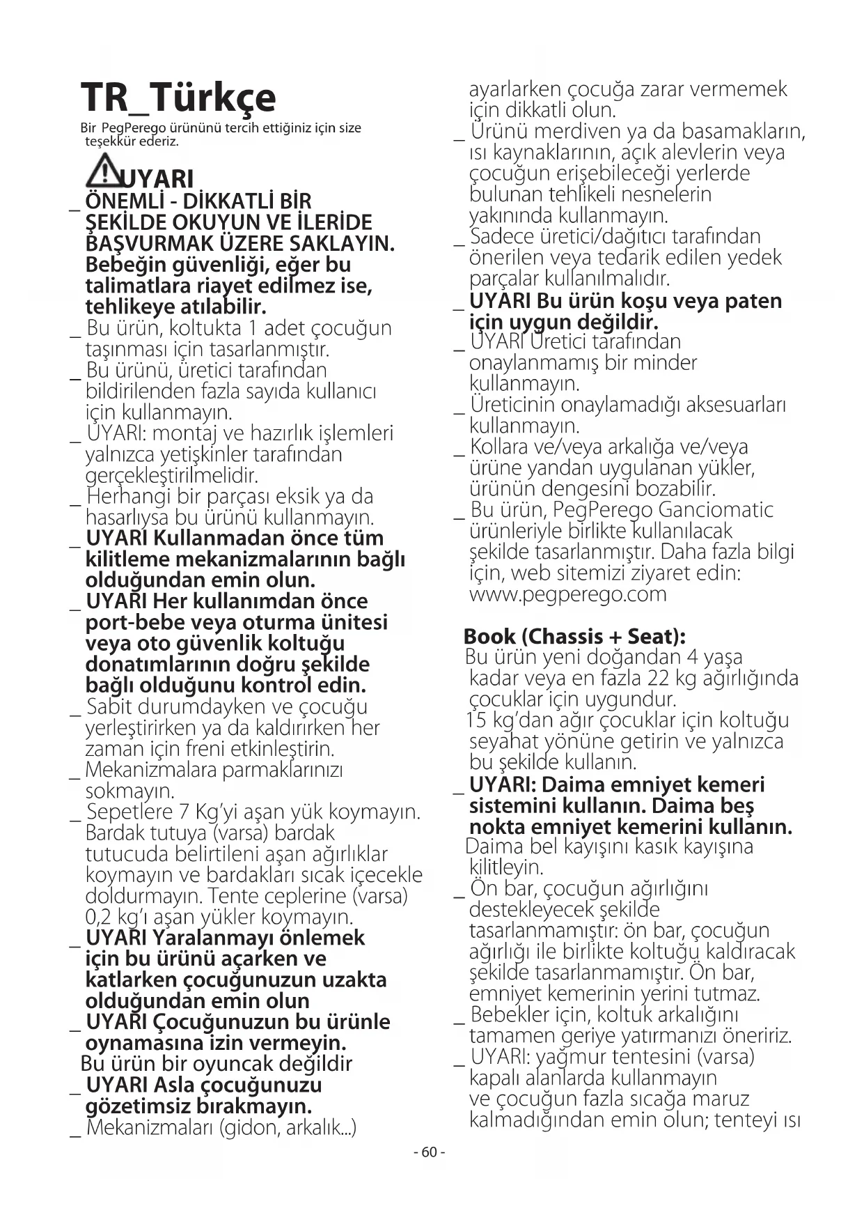 BAŞVURMAK ÜZERE SAKLAYIN. Bebeğin güvenliği, eğer bu talimatlara riayet edilmez ise, tehlikeye atılabilir. _ Bu ürün, koltukta 1 adet çocuğun taşınması için tasarlanmıştır. _ Bu ürünü, üretici tarafından bildirilenden fazla sayıda kullanıcı için kullanmayın. _ UYARI: montaj ve hazırlık işlemleri yalnızca yetişkinler tarafından gerçekleştirilmelidir. _ Herhangi bir parçası eksik ya da hasarlıysa bu ürünü kullanmayın. _ UYARI Kullanmadan önce tüm kilitleme mekanizmalarının bağlı olduğundan emin olun. _ UYARI Her kullanımdan önce port-bebe veya oturma ünitesi veya oto güvenlik koltuğu donatımlarının doğru şekilde bağlı olduğunu kontrol edin. _ Sabit durumdayken ve çocuğu yerleştirirken ya da kaldırırken her zaman için freni etkinleştirin. _ Mekanizmalara parmaklarınızı sokmayın. _ Sepetlere 7 Kg’yi aşan yük koymayın. Bardak tutuya (varsa) bardak tutucuda belirtileni aşan ağırlıklar koymayın ve bardakları sıcak içecekle doldurmayın. Tente ceplerine (varsa) 0,2 kg’ı aşan yükler koymayın. _ UYARI Yaralanmayı önlemek için bu ürünü açarken ve katlarken çocuğunuzun uzakta olduğundan emin olun _ UYARI Çocuğunuzun bu ürünle oynamasına izin vermeyin. Bu ürün bir oyuncak değildir _ UYARI Asla çocuğunuzu gözetimsiz bırakmayın. _ Mekanizmaları (gidon, arkalık...) ayarlarken çocuğa zarar vermemek için dikkatli olun. _ Ürünü merdiven ya da basamakların, ısı kaynaklarının, açık alevlerin veya çocuğun erişebileceği yerlerde bulunan tehlikeli nesnelerin yakınında kullanmayın. _ Sadece üretici/dağıtıcı tarafından önerilen veya tedarik edilen yedek parçalar kullanılmalıdır. _ UYARI Bu ürün koşu veya paten için uygun değildir. _ UYARI Üretici tarafından onaylanmamış bir minder kullanmayın. _ Üreticinin onaylamadığı aksesuarları kullanmayın. _ Kollara ve/veya arkalığa ve/veya ürüne yandan uygulanan yükler, ürünün dengesini bozabilir. _ Bu ürün, PegPerego Ganciomatic ürünleriyle birlikte kullanılacak şekilde tasarlanmıştır. Daha fazla bilgi için, web sitemizi ziyaret edin: www.pegperego.com Book (Chassis + Seat): Bu ürün yeni doğandan 4 yaşa kadar veya en fazla 22 kg ağırlığında çocuklar için uygundur. 15 kg’dan ağır çocuklar için koltuğu seyahat yönüne getirin ve yalnızca bu şekilde kullanın. _ UYARI: Daima emniyet kemeri sistemini kullanın. Daima beş nokta emniyet kemerini kullanın. Daima bel kayışını kasık kayışına kilitleyin. _ Ön bar, çocuğun ağırlığını destekleyecek şekilde tasarlanmamıştır: ön bar, çocuğun ağırlığı ile birlikte koltuğu kaldıracak şekilde tasarlanmamıştır. Ön bar, emniyet kemerinin yerini tutmaz. _ Bebekler için, koltuk arkalığını tamamen geriye yatırmanızı öneririz. _ UYARI: yağmur tentesini (varsa) kapalı alanlarda kullanmayın ve çocuğun fazla sıcağa maruz kalmadığından emin olun; tenteyi ısı- 61 - kaynaklarının yakınında bırakmayın ve sigaralardan uzak tutun. Yağmur tentesi, bağlanabileceği bir tente ya da güneşlik olmadan çocuk arabası üzerinde kullanılmamalıdır. Yağmur tentesini sadece yetişkin gözetiminde kullanın. Yağmur tentesinin iskelet veya çocuk arabasının herhangi bir hareketli mekanizmasını engellemediğinden emin olun. İskelet veya çocuk arabasını katlamadan önce yağmur tentesini çıkarın. Book Chassis + Araba Koltuğu: yeni doğmuş bebeklerden 13 kg ağırlığa ulaşmış çocuklara kadar bir aralık için onaylanmıştır. Araç koltuğu ile birlikte kullanıldığında bu araç bebek beşiğinin veya yatağının yerine geçmez. Bebeğinizin uyuması gerekirse bebek uygun bir bebek arabasının, bebek beşiğinin veya yatağın içine yerleştirilmelidir. Book Chassis + Port-bebe: yeni doğmuş bebeklerden 9 kg ağırlığa ulaşmış çocuklara kadar bir aralık için onaylanmıştır. Port-bebe ile birlikte kullanıldığında: bu ürün, kendi başına oturamayan, devrilen veya elleri ve dizleri üzerine kalkamayan çocuklar için uygundur. Maksimum çocuk ağırlığı: 9 kg. Taşıma kolu (varsa) kullanım sırasında port-bebenin dışında ve çocuğun erişemeyeceği bir noktada bırakılmalıdır. Kumaş detaylarına ait resimler satın alınan koleksiyondan farklı olabilir. Daha fazla bilgi için, web sitemizi ziyaret edin:www.pegperego.com KULLANIM KILAVUZU BOOK CHASSIS 1 AÇILIŞ: İskeleti açmadan önce, her türlü özel kesim kartonu (bıçak kullanmadan) sökün. UYARI: _ TOKAYI SINIRININ ÖTESİNE ÇEKMEYİN YA DA ZORLAMAYIN. _ TOKAYI TAŞIYICI KOL OLARAK YA DA AĞIRLIK TAŞIMAK İÇİN KULLANMAYIN. BU DONANIMA ÇANTA VEYA BAŞKA BİR AKSESUAR ASMAYIN. Yan mandalı aşağıya doğru bastırın, tutamağı üst kısmından tutun ve iskelet tam olarak açılana kadar kendinize doğru döndürün (şek_a). İskeleti açın (şek_b). Taban üzerindeki bağlantı ataşmanı şekilde gösterildiği gibi yerine oturduğunda iskelet uygun şekilde açılır. UYARI: Koltuğu iskelete yerleştirirken, tabana sağlam bir şekilde bağlanmasını sağlamak için koltuğu aşağıya doğru bastırın. 2 TEKERLEKLERİN MONTAJI: Arka tekerlek milini, doğru yönde olmasına dikkat ederek desteklerin üzerine geçiriniz (şek_a), son olarak arka tekerlekleri klik sesi gelene kadar geçirip takınız (şek_b). Ön tekerlekleri takmak için, yerlerine kilitlenene kadar dik şasilere oturtun (şek_c). 3 ANA KOLU TAKMA: kol borusu yukarı doğru bakarsa, bebek arabasıyla hizalayın (şek_a). Kolu şekilde (şek_b) gösterildiği gibi çerçeveye sabitleyin. İşlemi tamamlamak için, koldaki (şek_c) iki yan düğmeye yerine kilitlenene kadar basarak kolun tamamen itilmesini sağlayın (şek_d). 4 SEPETİN MONTAJI: İndirilmiş haldeyse, sepet borusunu yatay konuma kaldırın. Bebek arabasının arkasında bulunan metal sepet borusunun altındaki gümüş renk düğmelere (
