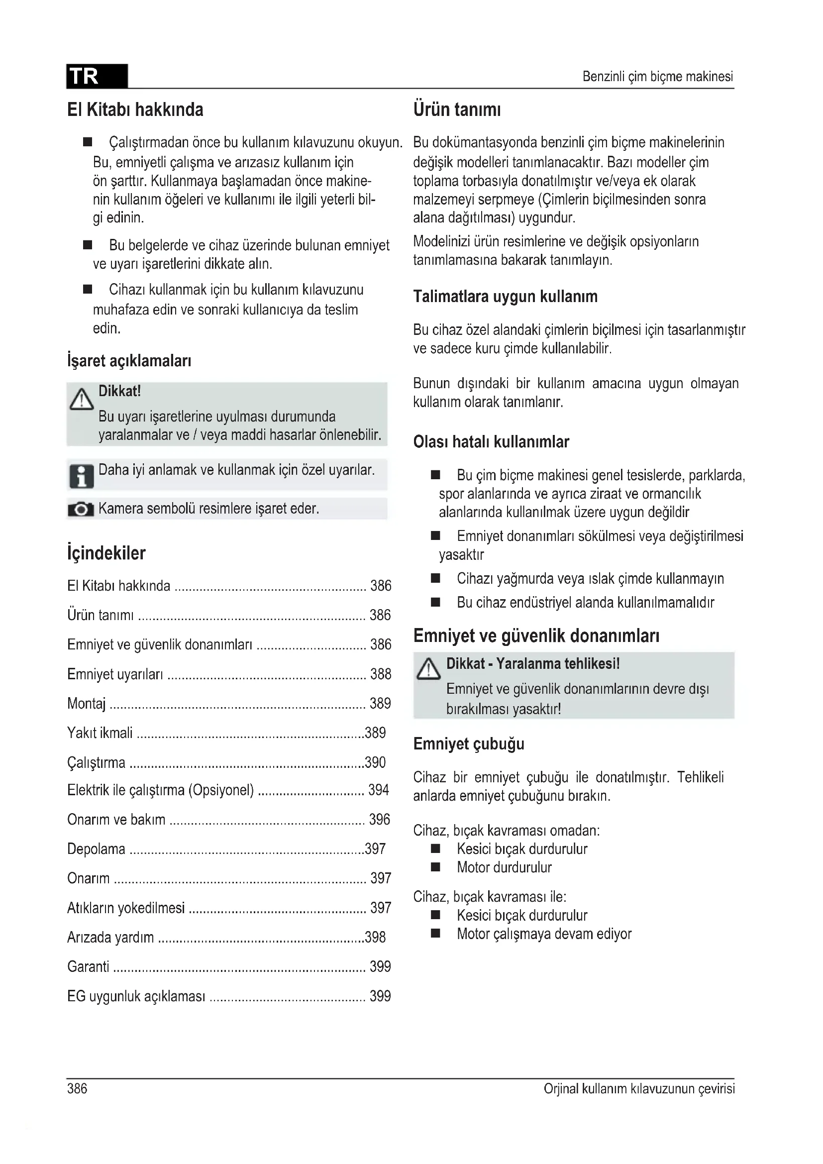 - EG uygunluk açıklaması El Kitabı hakkında Çalıştırmadan önce bu kullanım kılavuzunu okuyun. Bu, emniyetli çalışma ve arızasız kullanım için ön şarttır. Kullanmaya başlamadan önce makine- nin kullanım öğeleri ve kullanımı ile ilgili yeterli bil- gi edinin. Bu belgelerde ve cihaz üzerinde bulunan emniyet ve uyarı işaretlerini dikkate alın. Cihazı kullanmak için bu kullanım kılavuzunu muhafaza edin ve sonraki kullanıcıya da teslim edin. İşaret açıklamaları Dikkat! Bu uyarı işaretlerine uyulması durumunda yaralanmalar ve / veya maddi hasarlar önlenebilir. Daha iyi anlamak ve kullanmak için özel uyarılar. Kamera sembolü resimlere işaret eder. Ürün tanımı Bu dokümantasyonda benzinli çim biçme makinelerinin değişik modelleri tanımlanacaktır. Bazı modeller çim toplama torbasıyla donatılmıştır ve/veya ek olarak malzemeyi serpmeye (Çimlerin biçilmesinden sonra alana dağıtılması) uygundur. Modelinizi ürün resimlerine ve değişik opsiyonların tanımlamasına bakarak tanımlayın. Talimatlara uygun kullanım Bu cihaz özel alandaki çimlerin biçilmesi için tasarlanmıştır ve sadece kuru çimde kullanılabilir. Bunun dışındaki bir kullanım amacına uygun olmayan kullanım olarak tanımlanır. Olası hatalı kullanımlar Bu çim biçme makinesi genel tesislerde, parklarda, spor alanlarında ve ayrıca ziraat ve ormancılık alanlarında kullanılmak üzere uygun değildir Emniyet donanımları sökülmesi veya değiştirilmesi yasaktır Cihazı yağmurda veya ıslak çimde kullanmayın Bu cihaz endüstriyel alanda kullanılmamalıdır Emniyet ve güvenlik donanımları Dikkat - Yaralanma tehlikesi! Emniyet ve güvenlik donanımlarının devre dışı bırakılması yasaktır! Emniyet çubuğu Cihaz bir emniyet çubuğu ile donatılmıştır. Tehlikeli anlarda emniyet çubuğunu bırakın. Cihaz, bıçak kavraması omadan: Kesici bıçak durdurulur Motor durdurulur Cihaz, bıçak kavraması ile: Kesici bıçak durdurulur Motor çalışmaya devam ediyorTR 387470 591_c 1 Çalıştırma ipi 9 Kesme yüksekliği ayarı* 2 Start, Stop* 10 Bıçak kavraması* 3 Tekerlek tahriki* 11 Vario tahriki* 4 Emniyet çubuğu 12 Kullanım kılavuzu 5 Ergonomik yükseklik ayarı* 13 Dışarı atma parçası* 6 Dolum seviyesi göstergesi* 14 Kapak* 7 Engelleyici kapak* 15 Serpme kiti* 8 Çim toplama torbası* * Modele göre Cihazdaki semboller Dikkat! Kullanırken çok dikkatli olun. Kesme ünitesinde çalışma yapmadan önce buji soketini çıkarın. Çalıştırmadan önce kullanım kılavuzunu okuyun! Motor frenini açma. Üçüncü şahısları tehlikeli bölgeden uzaklaştırın! Tekerlek tahrikini çalıştırma. Ellerinizi ve ayaklarınızı kesme ünitesinden uzak tutun! p. 399