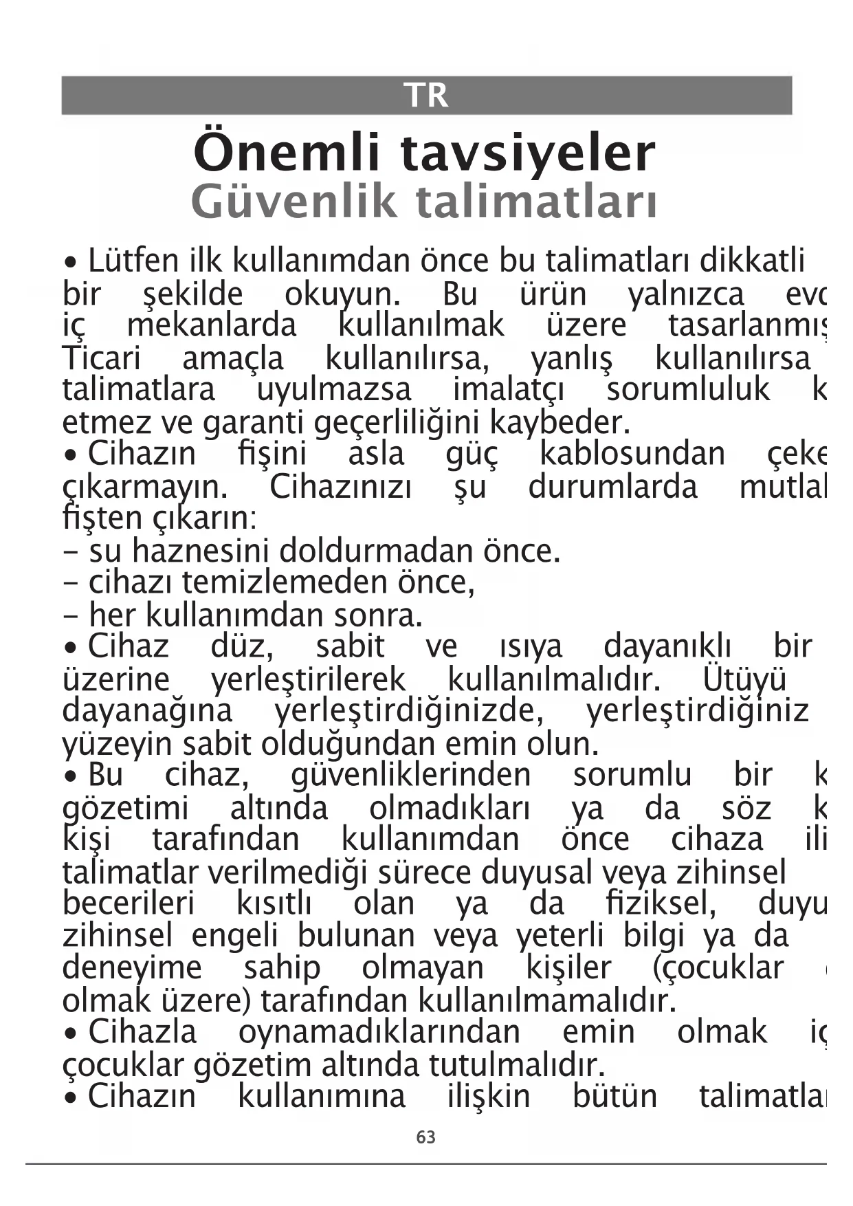 - Lütfenilkkullanımdanöncebutalimatlarıdikkatli bir şekilde okuyun. Bu ürün yalnızca evde ve iç mekanlarda kullanılmak üzere tasarlanmıştır. Ticari amaçla kullanılırsa, yanlış kullanılırsa ve talimatlara uyulmazsa imalatçı sorumluluk kabul etmezvegarantigeçerliliğinikaybeder.