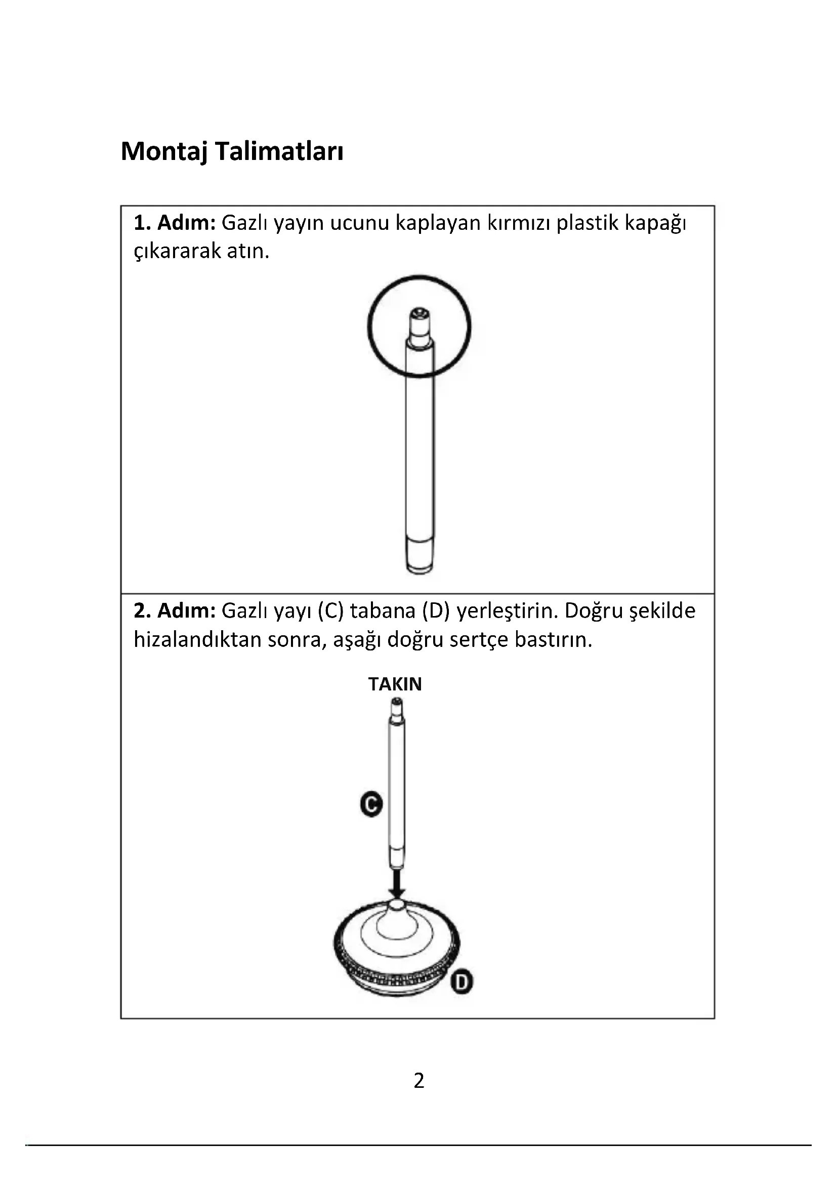 2. Adım: Gazlı yayı (C) tabana (D) yerleştirin. Doğru şekilde