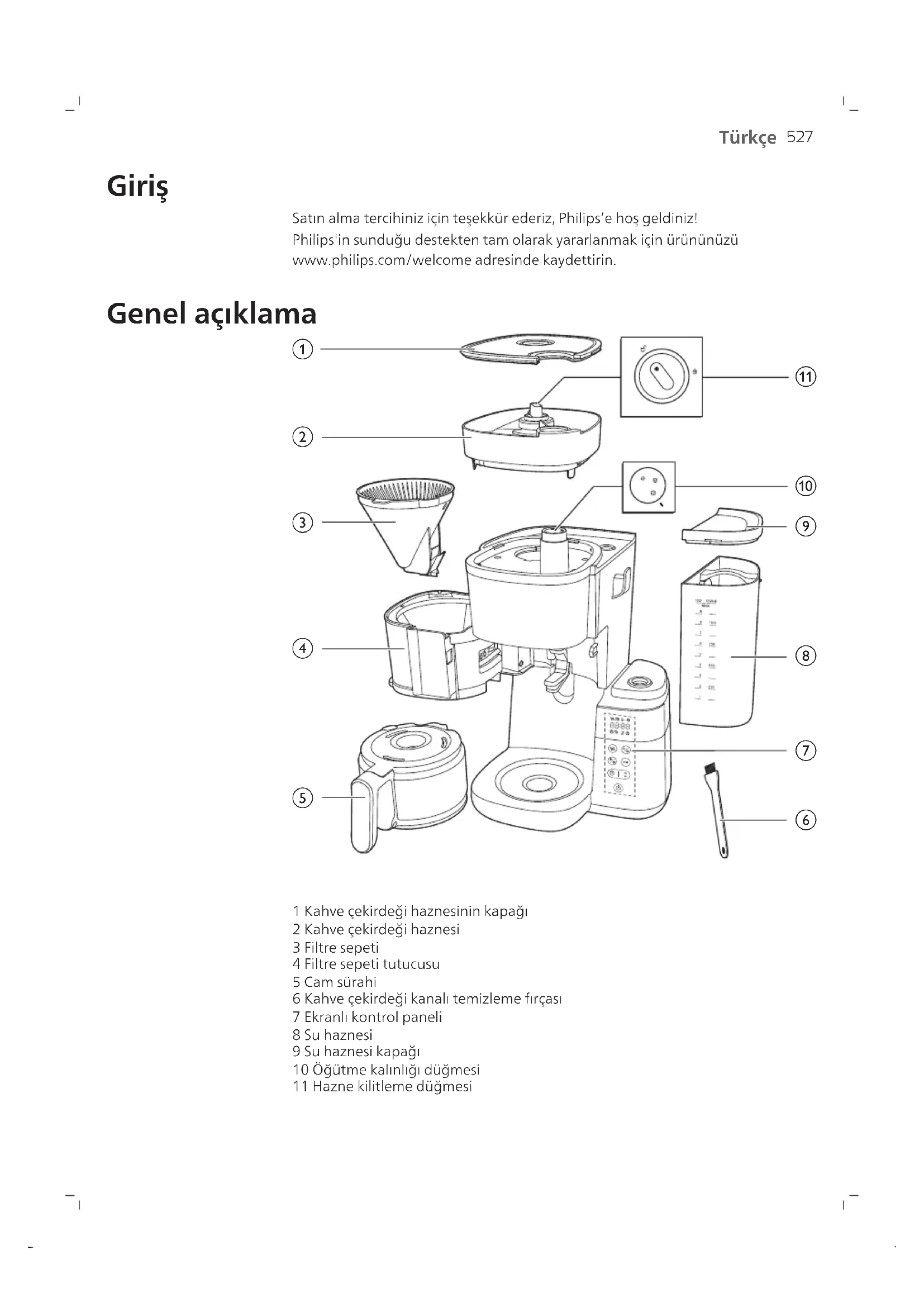 1 Kahve çekirdeği haznesinin kapağı 2 Kahve çekirdeği haznesi 3 Filtre sepeti 4 Filtre sepeti tutucusu 5 Cam sürahi 6 Kahve çekirdeği kanalı temizleme fırçası 7 Ekranlı kontrol paneli 8 Su haznesi 9 Su haznesi kapağı 10 Öğütme kalınlığı düğmesi 11 Hazne kilitleme düğmesi528 Türkçe Kontrol paneli Güç düğmesi Zaman ayarı için zamanlayıcı düğmesi ve ok düğmesi Başlat/duraklat düğmesi Temizleme düğmesi Ön öğütme ve kahve sertliği düğmesi Fincan seçim düğmesi Ekran simgesi Fincan sayısı Sıcak tutma modu Önceden öğütülmüş kahve Kahve sertliği Kirecin temizlenmesi Manuel temizleme uyarısı Düşük su miktarı Zamanlayıcı529 Türkçe Zaman göstergesi İlk iki hane saati, son iki hane ise dakikayı temsil eder. Düğmeyi kilit açma konumuna çevirin, ardından kahve çekirdeği haznesini cihazdan çıkarabilirsiniz. Bu düğme kahvenin öğütülme kalınlığını seçer. Daha büyük boyut, daha kalın öğütme işlemini belirtir. Sürahi modu Damlama önleme işlevi, sürahi modunda mevcuttur. Not: Sürahiyi çıkardığınızda kahve demleme işlemi durmaz. Sürahiyi 20 saniye içinde cihaza geri koymazsanız filtre sepeti taşar. Fincan modu Kahve demleme işlemi bittikten sonra damlamayı önlemek için düğmeyi fincan modundan sürahi moduna manuel olarak geçirerek damlama önleyiciyi açın Not: Soğuk seramik kupa, kendisini ısıtırken kahvenin ısısını çalar. Lütfen fincanı sıcak suyla önceden ısıtın. Önemli Uyarı