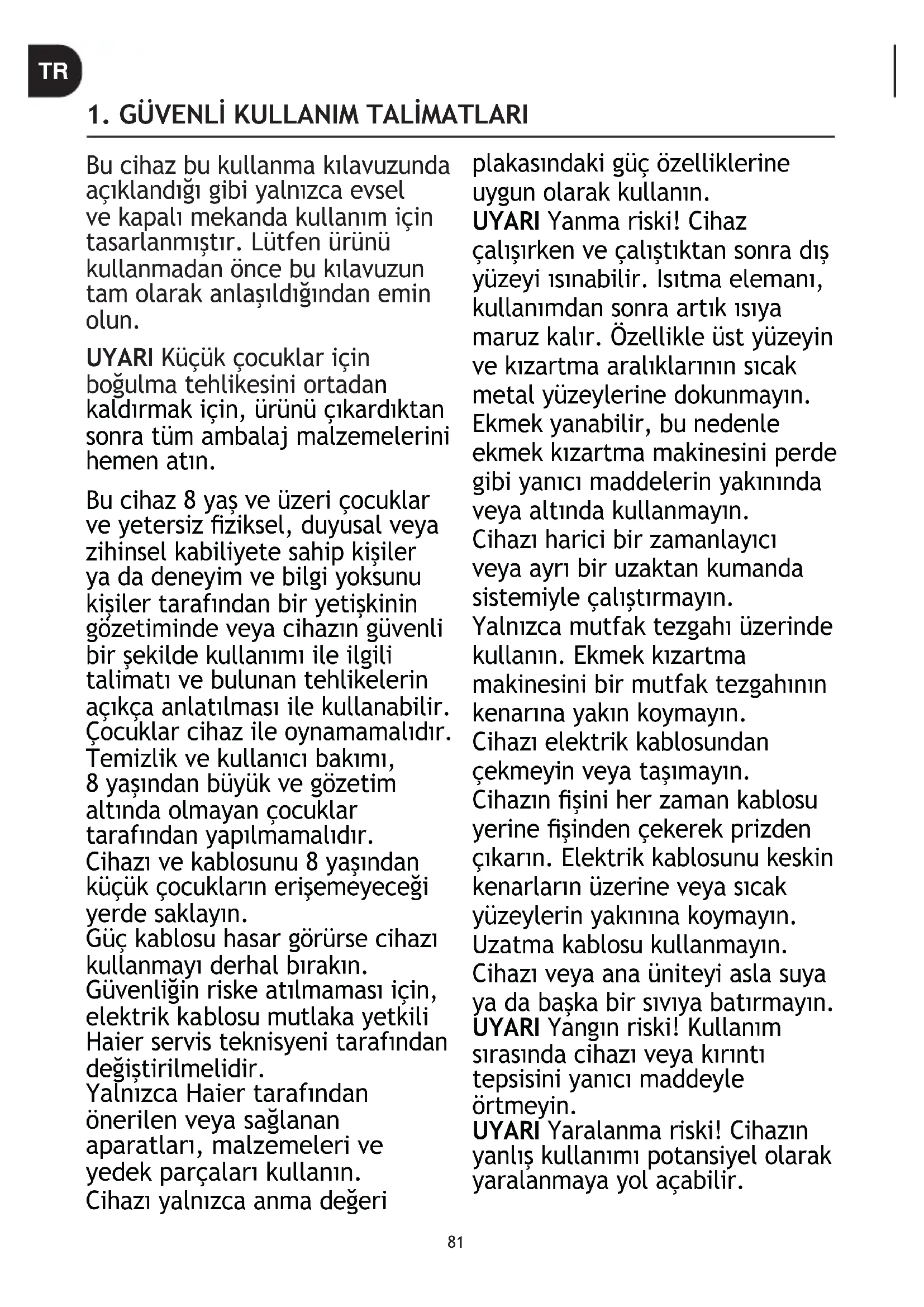 - Riešenie: stlačte ľubovoľné tlačidlo alebo zdvíhaciu páku.81 Bu cihaz bu kullanma kılavuzunda açıklandığı gibi yalnızca evsel ve kapalı mekanda kullanım için tasarlanmıştır. Lütfen ürünü kullanmadan önce bu kılavuzun tam olarak anlaşıldığından emin olun. UYARI Küçük çocuklar için boğulma tehlikesini ortadan kaldırmak için, ürünü çıkardıktan sonra tüm ambalaj malzemelerini hemen atın. Bu cihaz 8 yaş ve üzeri çocuklar ve yetersiz ziksel, duyusal veya zihinsel kabiliyete sahip kişiler ya da deneyim ve bilgi yoksunu kişiler tarafından bir yetişkinin gözetiminde veya cihazın güvenli bir şekilde kullanımı ile ilgili talimatı ve bulunan tehlikelerin açıkça anlatılması ile kullanabilir. Çocuklar cihaz ile oynamamalıdır. Temizlik ve kullanıcı bakımı, 8 yaşından büyük ve gözetim altında olmayan çocuklar tarafından yapılmamalıdır. Cihazı ve kablosunu 8 yaşından küçük çocukların erişemeyeceği yerde saklayın. Güç kablosu hasar görürse cihazı kullanmayı derhal bırakın. Güvenliğin riske atılmaması için, elektr ik ka blosu mutlaka yetkili Haier servis teknisyeni tarafından değiştirilmelidir. Yalnızca Haier tarafından önerilen veya sağlanan aparatları, malzemeleri ve yedek parçaları kullanın. Cihazı yalnızca anma değeri plakasındaki güç özelliklerine uygun olarak kullanın. UYARI Yanma riski! Cihaz çalışırken ve çalıştıktan sonra dış yüzeyi ısınabilir. Isıtma elemanı, kullanımdan sonra artık ısıya maruz kalır. Özellikle üst yüzeyin ve kızartma aralıklarının sıcak metal yüzeylerine dokunmayın. Ekmek yanabilir, bu nedenle ekmek kızartma makinesini perde gibi yanıcı maddelerin yakınında veya altında kullanmayın. Cihazı harici bir zamanlayıcı veya ayrı bir uzaktan kumanda sistemiyle çalıştırmayın. Yalnızca mutfak tezgahı üzerinde kullanın. Ekmek kızartma makinesini bir mutfak tezgahının kenarına yakın koymayın. Cihazı elektrik kablosundan çekmeyin veya taşımayın. Cihazın şini her zaman kablosu yerine şinden çekerek prizden çıkarın. Elektrik kablosunu keskin kenarların üzerine veya sıcak yüzeylerin yakınına koymayın. Uzatma kablosu kullanmayın. Cihazı veya ana üniteyi asla suya ya da başka bir sıvıya batırmayın. UYARI Yangın riski! Kullanım sırasında cihazı veya kırıntı tepsisini yanıcı maddeyle örtmeyin. UYARI Yaralanma riski! Cihazın yanlış kullanımı potansiyel olarak yaralanmaya yol açabilir.