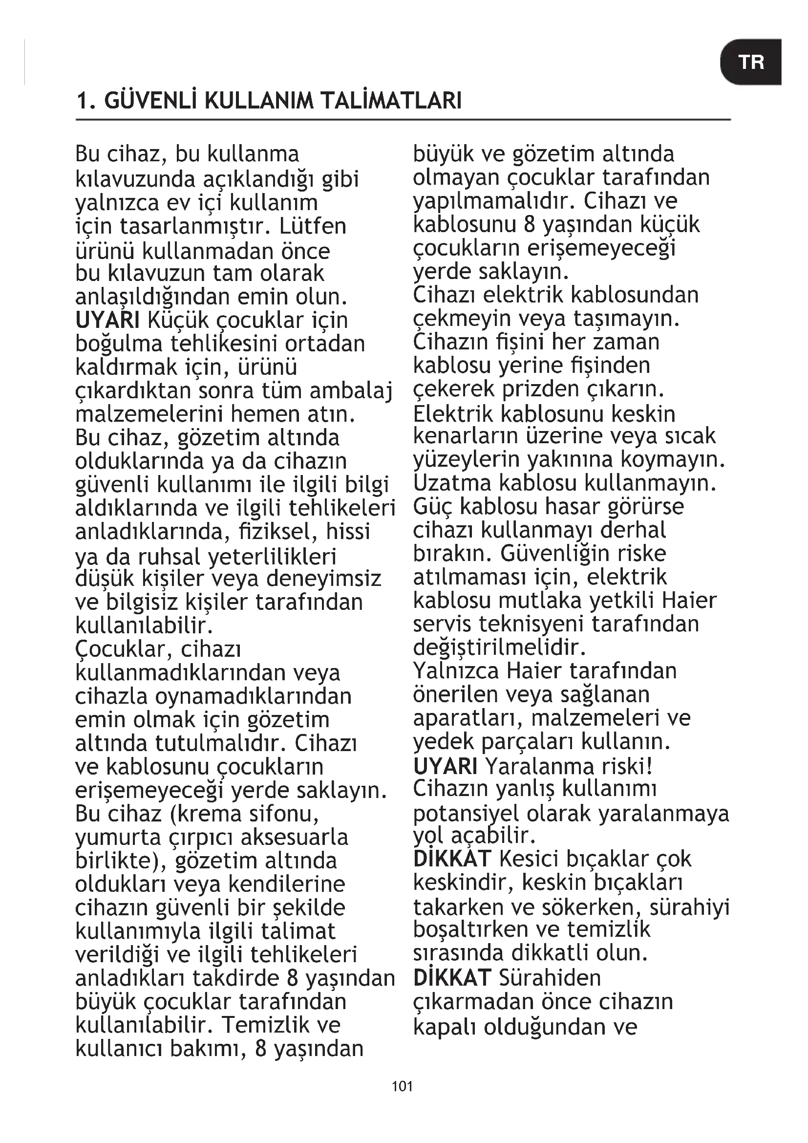 Pred ďalším použitím nechajte zariadenie úplne vychladnúť.101 Bu cihaz, bu kullanma kılavuzun da açıklandığı gibi yalnızca ev içi kullanım için tasarlanmıştır. Lütfen ürünü kullanmadan önce bu kılavuzun tam olarak anlaşıldığından emin olun. UYARI Küçük çocuklar için boğulma tehlikesini ortadan kaldırmak için, ürünü çıkardıktan sonra tüm ambalaj malzemelerini hemen atın. Bu cihaz, gözetim altında olduklarında ya da cihazın güvenli kullanımı ile ilgili bilgi aldıklarında ve ilgili tehlikeleri anladıklarında, ziksel, hissi ya da ruhsal yeterlilikleri düşük kişiler veya deneyimsiz ve bilgisiz kişiler tarafından kullanılabilir. Çocuklar, cihazı kullanmadıklarından veya cihazla oynamadıklarından emin olmak için gözetim altında tutulmalıdır. Cihazı ve kablosunu çocukların erişemeyeceği yerde saklayın. Bu cihaz (krema sifonu, yumurta çırpıcı aksesuarla birlikte), gözetim altında oldukları veya kendilerine cihazın güvenli bir şekilde kullanımıyla ilgili talimat verildiği ve ilgili tehlikeleri anladıkları takdirde 8 yaşından büyük çocuklar tarafından kullanılabilir. Temizlik ve kullanıcı bakımı, 8 yaşından büyük ve gözetim altında olmayan çocuklar tarafından yapılmamalıdır. Cihazı ve kablosunu 8 yaşından küçük çocukların erişemeyeceği yerde saklayın. Cihazı elektrik kablosundan çekmeyin veya taşımayın. Cihazın şini her zaman kablosu yerine şinden çekerek prizden çıkarın. Elektrik kablosunu keskin kenarların üzerine veya sıcak yüzeylerin yakınına koymayın. Uzatma kablosu kullanmayın. Güç kablosu hasar görürse cihazı kullanmayı derhal bırakın. Güvenliğin riske atılmaması için, elektrik kablosu mutlaka yetkili Haier servis teknisyeni tarafından değiştirilmelidir. Yalnızca Haier tarafından önerilen veya sağlanan aparatları, malzemeleri ve yedek parçaları kullanın. UYARI Yaralanma riski! Cihazın yanlış kullanımı potansiyel olarak yaralanmaya yol açabilir. DİKKAT Kesici bıçaklar çok keskindir, keskin bıçakları takarken ve sökerken, sürahiyi boşaltırken ve temizlik sırasında dikkatli olun. DİKKAT Sürahiden çıkarm adan önce cihazın kapalı olduğundan ve