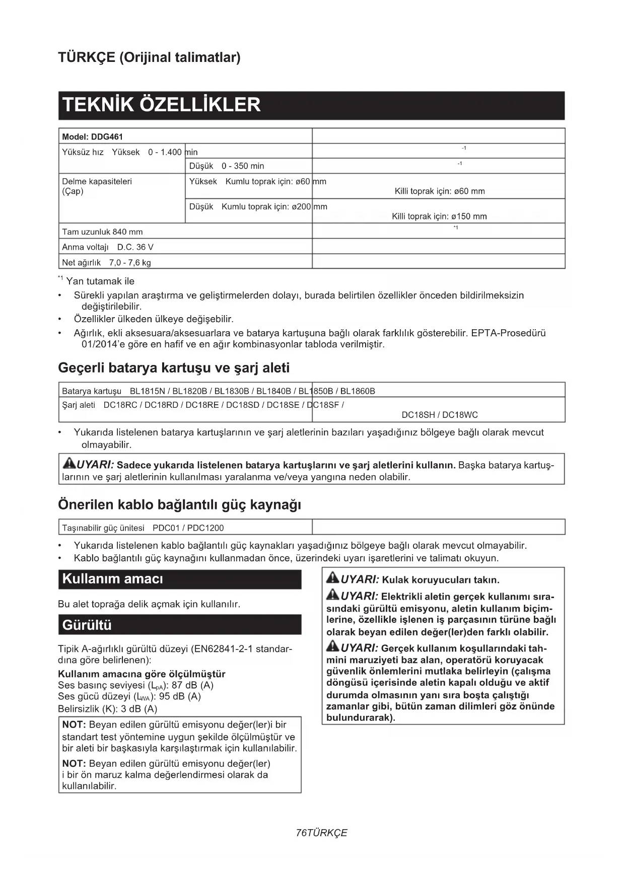 - Kablobağlantılıgüçkaynağınıkullanmadanönce,üzerindekiuyarıişaretlerinivetalimatıokuyun. Kullanım amacı Bualettoprağadelikaçmakiçinkullanılır. Gürültü TipikA-ağırlıklıgürültüdüzeyi(EN62841-2-1standar- dınagörebelirlenen): Kullanım amacına göre ölçülmüştür Sesbasınçseviyesi(L