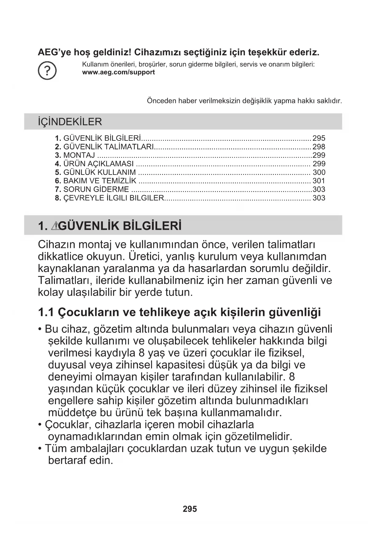 - Tüm ambalajları çocuklardan uzak tutun ve uygun şekilde bertaraf edin. 295• Cihaz çalışırken çocukları ve hayvanları cihazdan uzak tutun.