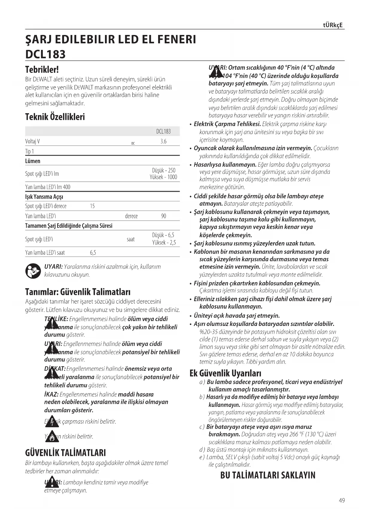 Şarj göstergesi LED’i Kullanım Amacı Satın aldığınız DeWALT DCL183, profesyonel aydınlatma uygulamaları için tasarlanmıştır. ISLAK KOŞULLARDA veya yanıcı sıvı ya da gazların mevcut olduğu ortamlarda kullanmayın. ÇOCUKLARIN lambaya temas etmesine izin vermeyin. Bu lamba deneyimsiz kullanıcılar tarafından kullanılırken gözetim gerekir.