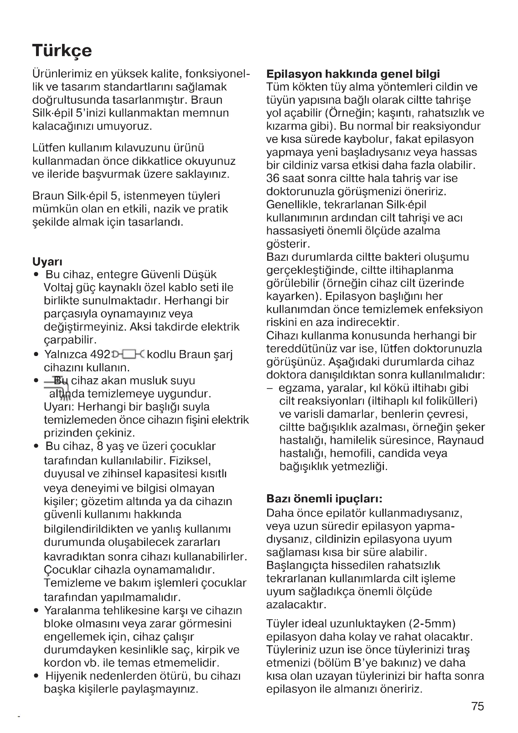 - Hijyenik nedenlerden ötürü, bu cihazı başka kişilerle paylaşmayınız. Epilasyon hakkında genel bilgi Tüm kökten tüy alma yöntemleri cildin ve tüyün yapısına bağlı olarak ciltte tahrişe yol açabilir (Örneğin; kaşıntı, rahatsızlık ve kızarma gibi). Bu normal bir reaksiyondur ve kısa sürede kaybolur, fakat epilasyon yapmaya yeni başladıysanız veya hassas bir cildiniz varsa etkisi daha fazla olabilir. 36 saat sonra ciltte hala tahriş var ise doktorunuzla görüşmenizi öneririz. Genellikle, tekrarlanan Silk·épil kullanımının ardından cilt tahrişi ve acı hassasiyeti önemli ölçüde azalma gösterir. Bazı durumlarda ciltte bakteri oluşumu gerçekleştiğinde, ciltte iltihaplanma görülebilir (örneğin cihaz cilt üzerinde kayarken). Epilasyon başlığını her kullanımdan önce temizlemek enfeksiyon riskini en aza indirecektir. Cihazı kullanma konusunda herhangi bir tereddütünüz var ise, lütfen doktorunuzla görüşünüz. Aşağıdaki durumlarda cihaz doktora danışıldıktan sonra kullanılmalıdır: – egzama, yaralar, kıl kökü iltihabı gibi cilt reaksiyonları (iltihaplı kıl folikülleri) ve varisli damarlar, benlerin çevresi, ciltte bağışıklık azalması, örneğin şeker hastalığı, hamilelik süresince, Raynaud hastalığı, hemofili, candida veya bağışıklık yetmezliği. Bazı önemli ipuçları: Daha önce epilatör kullanmadıysanız, veya uzun süredir epilasyon yapma- dıysanız, cildinizin epilasyona uyum sağlaması kısa bir süre alabilir. Başlangıçta hissedilen rahatsızlık tekrarlanan kullanımlarda cilt işleme uyum sağladıkça önemli ölçüde azalacaktır. Tüyler ideal uzunluktayken (2-5mm) epilasyon daha kolay ve rahat olacaktır. Tüyleriniz uzun ise önce tüylerinizi tıraş etmenizi (bölüm B’ye bakınız) ve daha kısa olan uzayan tüylerinizi bir hafta sonra epilasyon ile almanızı öneririz. Türkçe 90340813_SE5_Power_MN.indd 7590340813_SE5_Power_MN.indd 75 02.06.22 10:4902.06.22 10:4976 İlk kez epilasyon yaparken, ciltteki kızarıklığın gece boyunca kaybolması için akşam epilasyon yapılması önerilir. Cildi rahatlatmak için epilasyondan sonra nemlendirici krem uygulanmasını öneririz. Geri uzayan ince tüyler her zaman cilt yüzeyine çıkamayabilir. Düzenli olarak masaj süngeri kullanmak (örneğin, duştan sonra) veya peeling yapmak, nazik ova- lama işlemleri üstteki deri tabakasını temizleyeceği için batık oluşumunu engellemeye yardımcı olur ve ince tüyler cilt yüzeyine daha rahat uzar. Tanımlama 1a Yüksek frekanslı masaj kapağı 1b Cilt temas ataçmanı* 2 Cımbızlı epilasyon başlığı 3 Işık 4 Açma/kapama düğmesi 5 Çıkarma düğmesi 6 Özel kablo seti 7 Düzeltici ataçmanı ile birlikte tıraş başlığı*