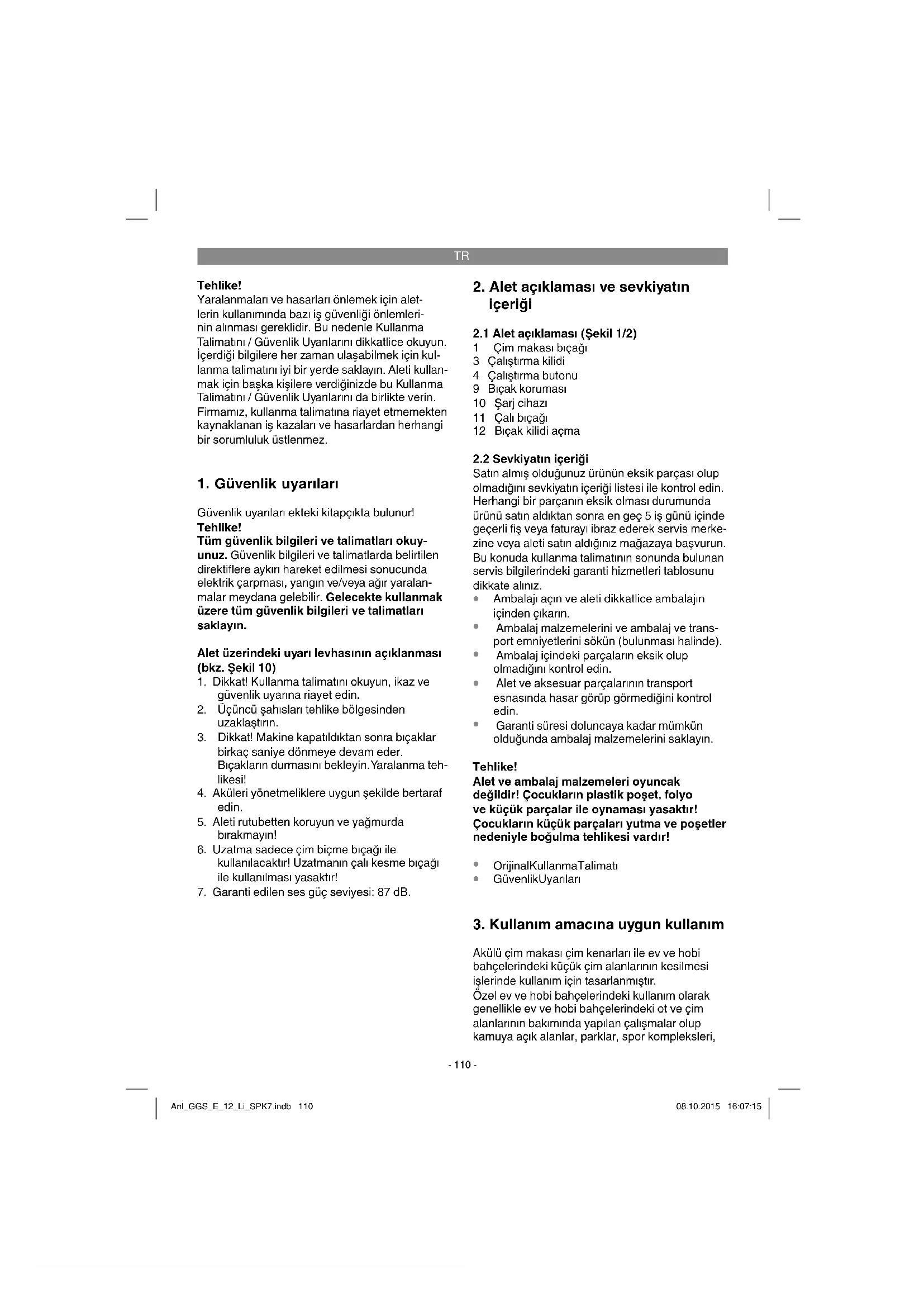 Akülü çim makası çim kenarları ile ev ve hobi bahçelerindeki küçük çim alanlarının kesilmesi işlerinde kullanım için tasarlanmıştır. Özel ev ve hobi bahçelerindeki kullanım olarak genellikle ev ve hobi bahçelerindeki ot ve çim alanlarının bakımında yapılan çalışmalar olup kamuya açık alanlar, parklar, spor kompleksleri, Anl_GGS_E_12_Li_SPK7.indb 110Anl_GGS_E_12_Li_SPK7.indb 110 08.10.2015 16:07:1508.10.2015 16:07:15TR