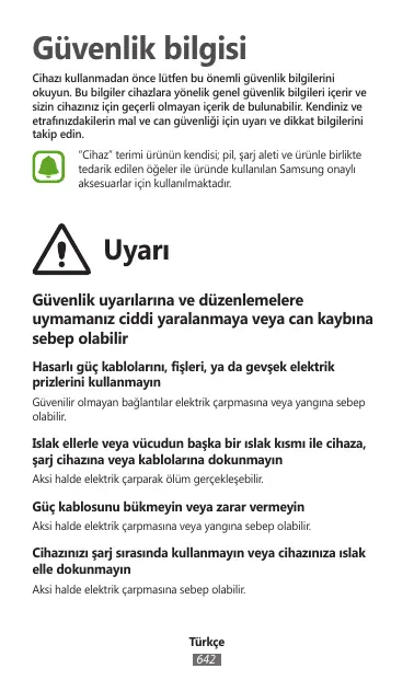 Güvenlik bilgisi Cihazı kullanmadan önce lütfen bu önemli güvenlik bilgilerini okuyun. Bu bilgiler cihazlara yönelik genel güvenlik bilgileri içerir ve sizin cihazınız için geçerli olmayan içerik de bulunabilir. Kendiniz ve etrafınızdakilerin mal ve can güvenliği için uyarı ve dikkat bilgilerini takip edin. “Cihaz” terimi ürünün kendisi; pil, şarj aleti ve ürünle birlikte tedarik edilen öğeler ile üründe kullanılan Samsung onaylı aksesuarlar için kullanılmaktadır.