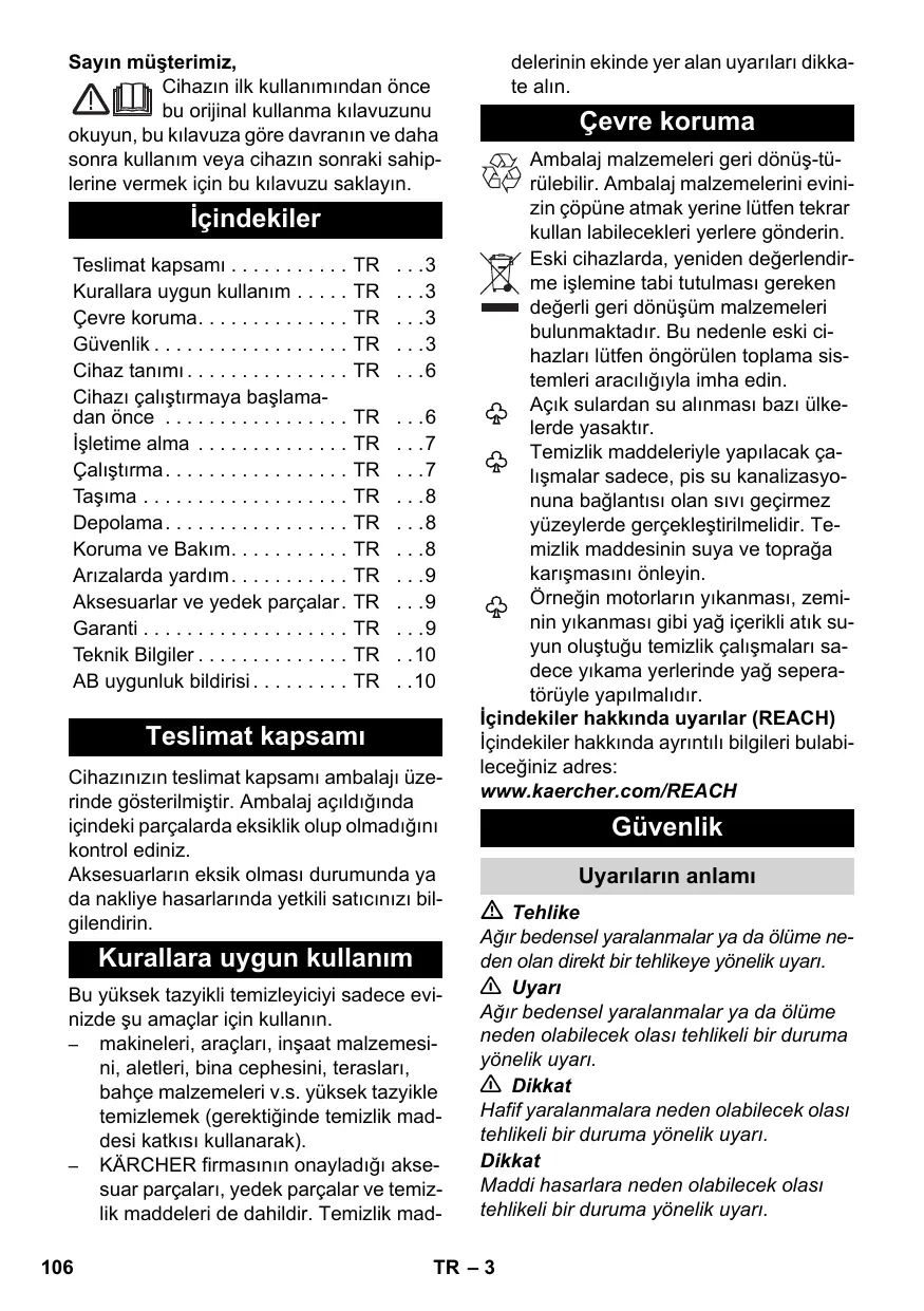 Teslimat kapsamı Cihazınızın teslimat kapsamı ambalajı üzerinde gösterilmiştir. Ambalaj açıldığında içindeki parçalarda eksiklik olup olmadığını kontrol ediniz. Aksesuarların eksik olması durumunda ya da nakliye hasarlarında yetkili satıcınızı bilgilendirin. Kurallara uygun kullanım Bu yüksek tazyikli temizleyiciyi sadece evinizde şu amaçlar için kullanın. – makineleri, araçları, inşaat malzemesini, aletleri, bina cephesini, terasları, bahçe malzemeleri v.s. yüksek tazyikle temizlemek (gerektiğinde temizlik maddesi katkısı kullanarak). – KÄRCHER firmasının onayladığı aksesuar parçaları, yedek parçalar ve temizlik maddeleri de dahildir. Temizlik mad106 delerinin ekinde yer alan uyarıları dikkate alın. Çevre koruma Ambalaj malzemeleri geri dönüş-türülebilir. Ambalaj malzemelerini evinizin çöpüne atmak yerine lütfen tekrar kullan labilecekleri yerlere gönderin. Eski cihazlarda, yeniden değerlendirme işlemine tabi tutulması gereken değerli geri dönüşüm malzemeleri bulunmaktadır. Bu nedenle eski cihazları lütfen öngörülen toplama sistemleri aracılığıyla imha edin. Açık sulardan su alınması bazı ülkelerde yasaktır. Temizlik maddeleriyle yapılacak çalışmalar sadece, pis su kanalizasyonuna bağlantısı olan sıvı geçirmez yüzeylerde gerçekleştirilmelidir. Temizlik maddesinin suya ve toprağa karışmasını önleyin. Örneğin motorların yıkanması, zeminin yıkanması gibi yağ içerikli atık suyun oluştuğu temizlik çalışmaları sadece yıkama yerlerinde yağ seperatörüyle yapılmalıdır. İçindekiler hakkında uyarılar (REACH) İçindekiler hakkında ayrıntılı bilgileri bulabileceğiniz adres: www.kaercher.com/REACH Güvenlik Uyarıların anlamı Tehlike Ağır bedensel yaralanmalar ya da ölüme neden olan direkt bir tehlikeye yönelik uyarı. 몇 Uyarı Ağır bedensel yaralanmalar ya da ölüme neden olabilecek olası tehlikeli bir duruma yönelik uyarı. 몇 Dikkat Hafif yaralanmalara neden olabilecek olası tehlikeli bir duruma yönelik uyarı. Dikkat Maddi hasarlara neden olabilecek olası tehlikeli bir duruma yönelik uyarı. TR – 3 Uygun olmayan elektrikli uzatma kabloları tehlikeli olabilir. Serbest zamanlarda, sadece bunun için müsaade edilmiş ve buna göre işaretlenmiş yeterli düzeyde kablo kesitine sahip elektrikli uzatma kablolarını kullanın. 1 - 10 m: 1,5 mm2;