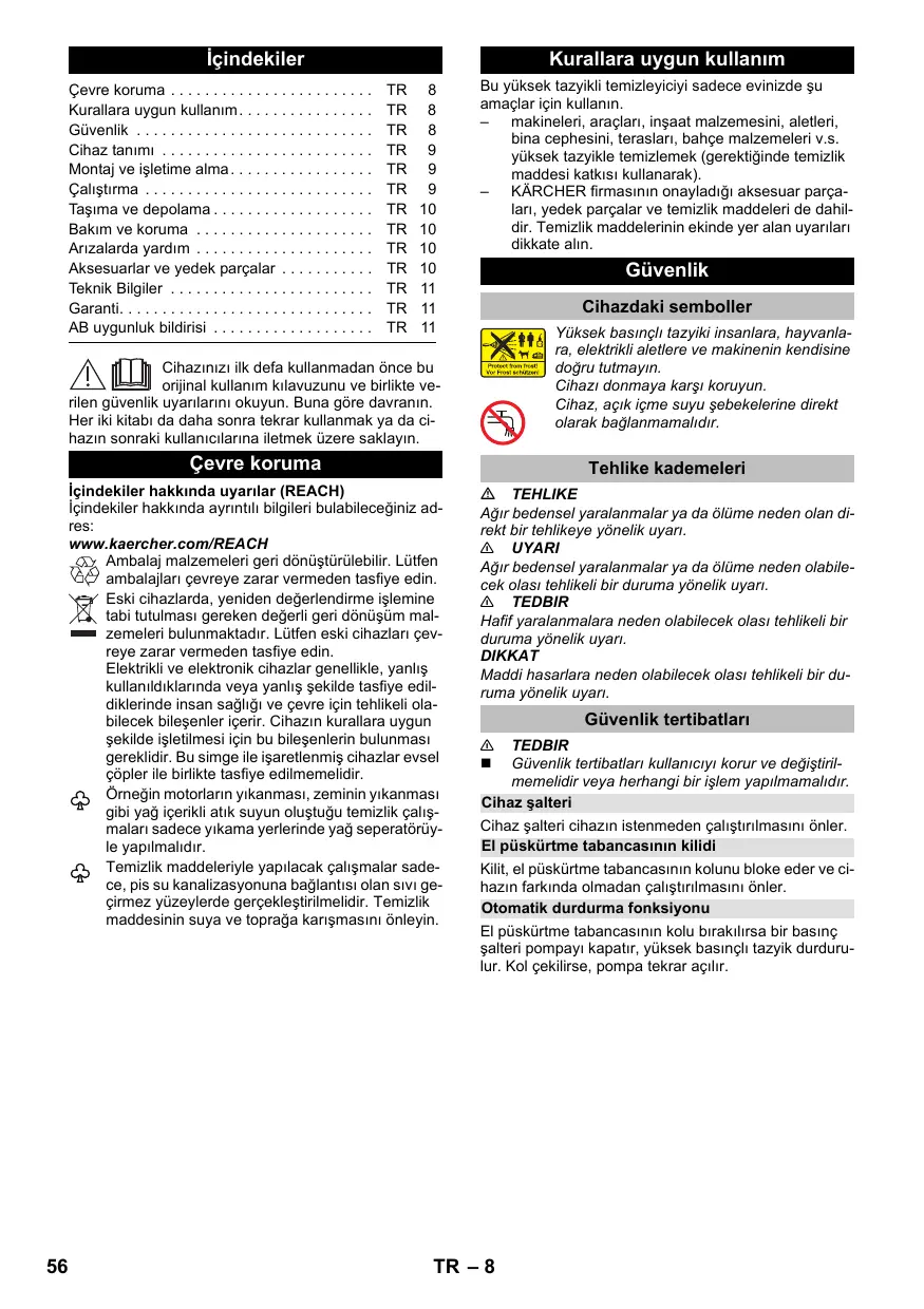 Çevre koruma Tehlike kademeleri İçindekiler hakkında uyarılar (REACH) İçindekiler hakkında ayrıntılı bilgileri bulabileceğiniz adres: www.kaercher.com/REACH Ambalaj malzemeleri geri dönüştürülebilir. Lütfen ambalajları çevreye zarar vermeden tasfiye edin. Eski cihazlarda, yeniden değerlendirme işlemine tabi tutulması gereken değerli geri dönüşüm malzemeleri bulunmaktadır. Lütfen eski cihazları çevreye zarar vermeden tasfiye edin. Elektrikli ve elektronik cihazlar genellikle, yanlış kullanıldıklarında veya yanlış şekilde tasfiye edildiklerinde insan sağlığı ve çevre için tehlikeli olabilecek bileşenler içerir. Cihazın kurallara uygun şekilde işletilmesi için bu bileşenlerin bulunması gereklidir. Bu simge ile işaretlenmiş cihazlar evsel çöpler ile birlikte tasfiye edilmemelidir. Örneğin motorların yıkanması, zeminin yıkanması gibi yağ içerikli atık suyun oluştuğu temizlik çalışmaları sadece yıkama yerlerinde yağ seperatörüyle yapılmalıdır. Temizlik maddeleriyle yapılacak çalışmalar sadece, pis su kanalizasyonuna bağlantısı olan sıvı geçirmez yüzeylerde gerçekleştirilmelidir. Temizlik maddesinin suya ve toprağa karışmasını önleyin. TEHLIKE Ağır bedensel yaralanmalar ya da ölüme neden olan direkt bir tehlikeye yönelik uyarı. 몇 UYARI Ağır bedensel yaralanmalar ya da ölüme neden olabilecek olası tehlikeli bir duruma yönelik uyarı. 몇 TEDBIR Hafif yaralanmalara neden olabilecek olası tehlikeli bir duruma yönelik uyarı. DIKKAT Maddi hasarlara neden olabilecek olası tehlikeli bir duruma yönelik uyarı. Güvenlik tertibatları