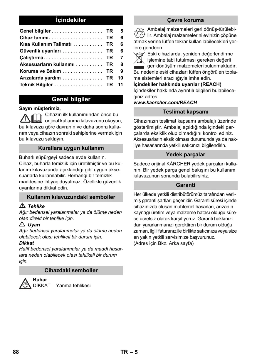 TR 10 TR 11 Genel bilgiler Sayın müşterimiz, Cihazın ilk kullanımından önce bu orijinal kullanma kılavuzunu okuyun, bu kılavuza göre davranın ve daha sonra kullanım veya cihazın sonraki sahiplerine vermek için bu kılavuzu saklayın. Kurallara uygun kullanım Buharlı süpürgeyi sadece evde kullanın. Cihaz, buharla temizlik için üretilmiştir ve bu kullanım kılavuzunda açıklandığı gibi uygun aksesuarlarla kullanılabilir. Herhangi bir temizlik maddesine ihtiyaç duyulmaz. Özellikle güvenlik uyarılarına dikkat edin. Kullanım kılavuzundaki semboller Tehlike Ağır bedensel yaralanmalar ya da ölüme neden olan direkt bir tehlike için. 몇 Uyarı Ağır bedensel yaralanmalar ya da ölüme neden olabilecek olası tehlikeli bir durum için. Dikkat Hafif bedensel yaralanmalar ya da maddi hasarlara neden olabilecek olası tehlikeli bir durum için. Ambalaj malzemeleri geri dönüş-türülebilir. Ambalaj malzemelerini evinizin çöpüne atmak yerine lütfen tekrar kullan labilecekleri yerlere gönderin. Eski cihazlarda, yeniden değerlendirme işlemine tabi tutulması gereken değerli geri dönüşüm malzemeleri bulunmaktadır. Bu nedenle eski cihazları lütfen öngörülen toplama sistemleri aracılığıyla imha edin. İçindekiler hakkında uyarılar (REACH) İçindekiler hakkında ayrıntılı bilgileri bulabileceğiniz adres: www.kaercher.com/REACH Teslimat kapsamı Cihazınızın teslimat kapsamı ambalajı üzerinde gösterilmiştir. Ambalaj açıldığında içindeki parçalarda eksiklik olup olmadığını kontrol ediniz. Aksesuarların eksik olması durumunda ya da nakliye hasarlarında yetkili satıcınızı bilgilendirin. Yedek parçalar Sadece orijinal KÄRCHER yedek parçaları kullanın. Bir yedek parça genel bakışını bu kullanım kılavuzunun sonunda bulabilirsiniz. Garanti Her ülkede yetkili distribütörümüz tarafından verilmiş garanti şartları geçerlidir. Garanti süresi içinde cihazınızda oluşan muhtemel hasarları, arızanın kaynağı üretim veya malzeme hatası olduğu sürece ücretsiz olarak karşılıyoruz. Garanti hakkınızdan yararlanmanızı gerektiren bir durum olduğu zaman, ilgili faturanız ile birlikte satıcınıza veya size en yakın yetkili servisimize başvurunuz. (Adres için Bkz. Arka sayfa) Cihazdaki semboller Buhar DİKKAT – Yanma tehlikesi